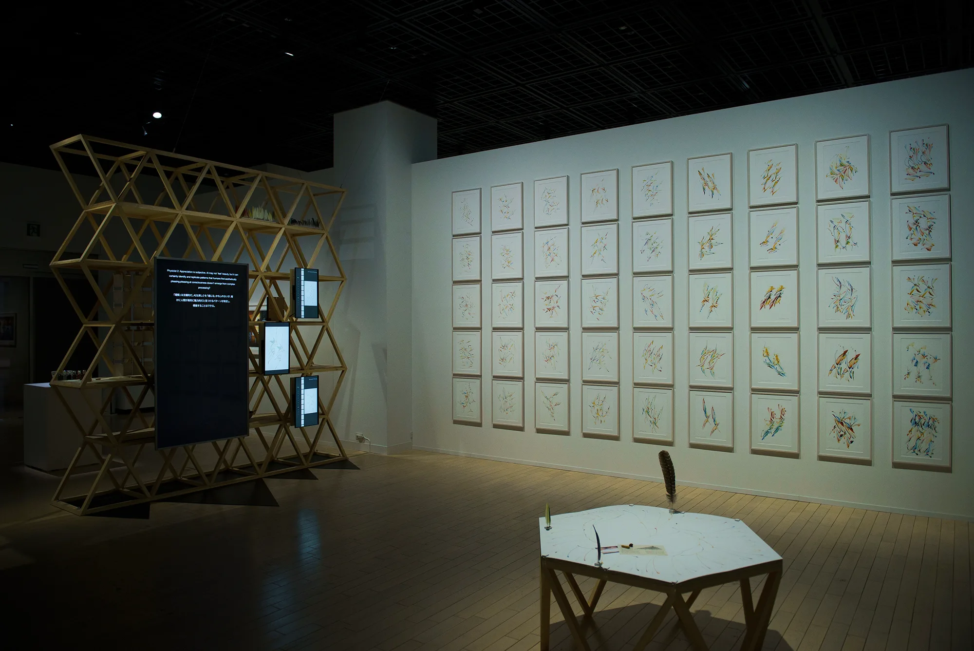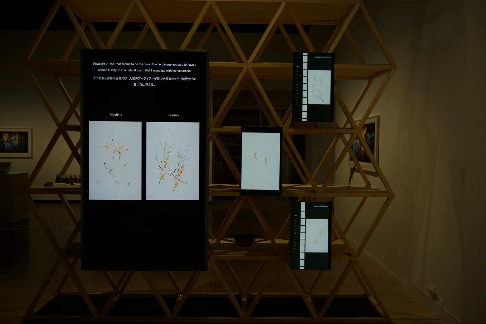 キャンバスを織り上げながら絵画を生み出す「織物絵画」により、身体記憶の繰り返しによる新たな絵画表現を目指してきた村山悟郎。新作《千年後のドローイングのために—人間・人工知能・人工生命》において村山は、AIがドローイングを行う学習データとするために、偶発性を入り込ませないよう相似の線を対比させるドローイングを1000枚制作。そのデータをもとに、池上高志がサイエンスの側から、村山がアートの側からコンセプトを出し、人工生命研究のAlternative MachineとAIを用いた創造的な表現を試みるQosmo, inc.がそれぞれ異なるアプローチから作品制作に携わる。画像からの学習、身体の記憶。その関わり合いから、人工知能が生み出す画面には村山の記憶とどれだけのズレが生じるのか。村山のドローイングとAIが生成した画像を比較し、解析する動画からは目が離せなくなるはずだ。