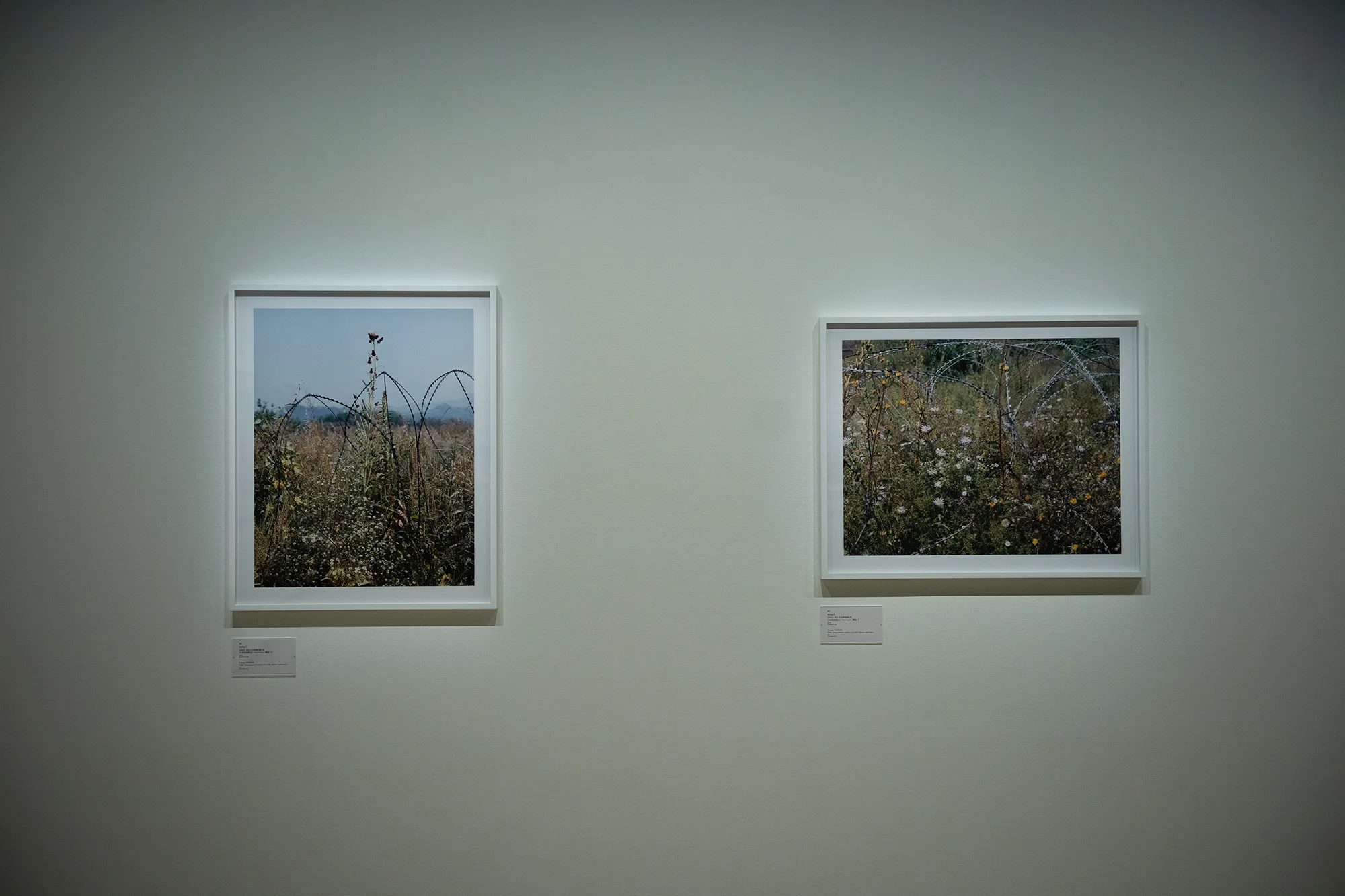 展示は米田知子の作品展示へと続く。大判で明るい画面の米田の作品。そこには、実際に写されていないが、歴史的な悲劇や事件の現場であるという「記憶」が残されている。あるいは、韓国と北朝鮮国境の非武装地帯で撮影した「絡まった有刺鉄線と花(非武装地帯近く・チョルウォン・韓国)」と題するシリーズには、まだ歴史になっていない、現在進行形で何かが起こる可能性を孕んだ危うさと結びついた景色が写されている。のどかな駅のプラットフォームや明るいスケートリンクで撮影された写真からも、有刺鉄線と花の写真からも、血生臭さは感じられない。だが、そこにはたしかに、目には見えない人々の記憶が刻まれている。