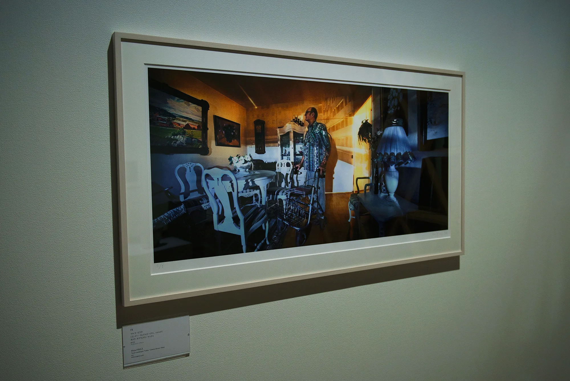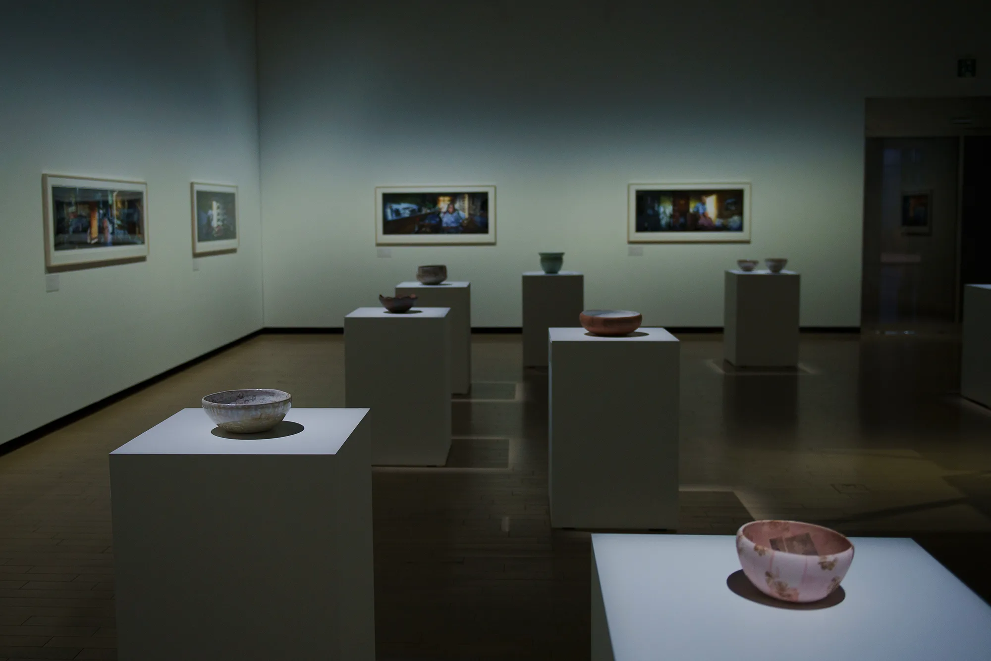 展示室最後の空間には、写真と陶の作品が並ぶ。写真家のマルヤ・ビリラと作陶のSatoko Sai +Tomoko Kuraharaが2010年から11年にかけ、フィンランド・トゥルク市に暮らす9人の高齢者に取材し、コラボレーションしたシリーズ作品《インナー・ランドスケープス、トゥルク》だ。マルヤ・ビリラはモデルとなった高齢者たちが暮らす部屋で、カメラ・オブスクラの技法を用いて、屋外の景色を部屋に投影してポートレートを撮影。光を遮断した箱に針で空けた小さな穴から光を招き入れ、屋外の景色を中に投影して焼き付けるピンホールカメラの原理で撮影された写真だ。