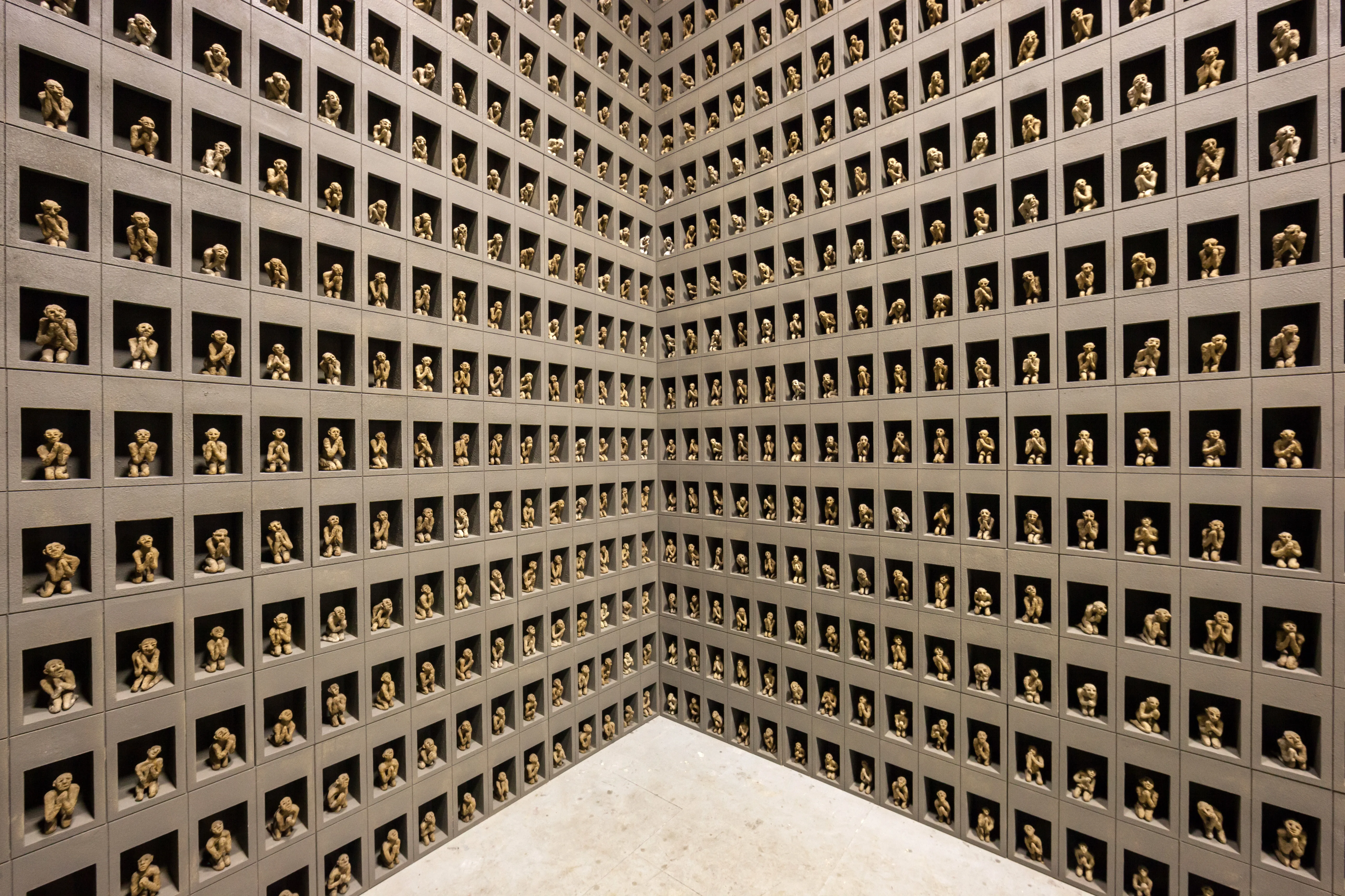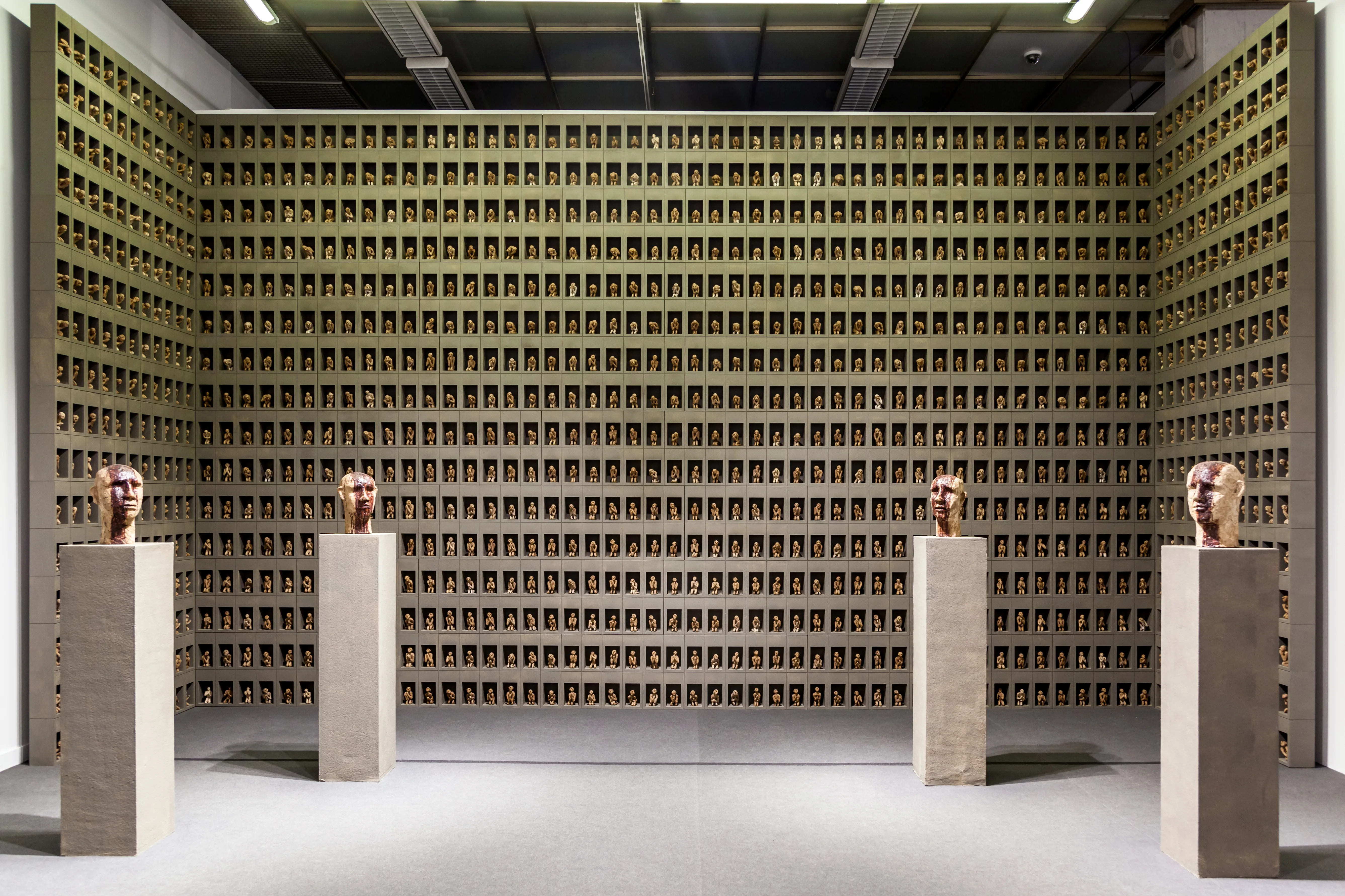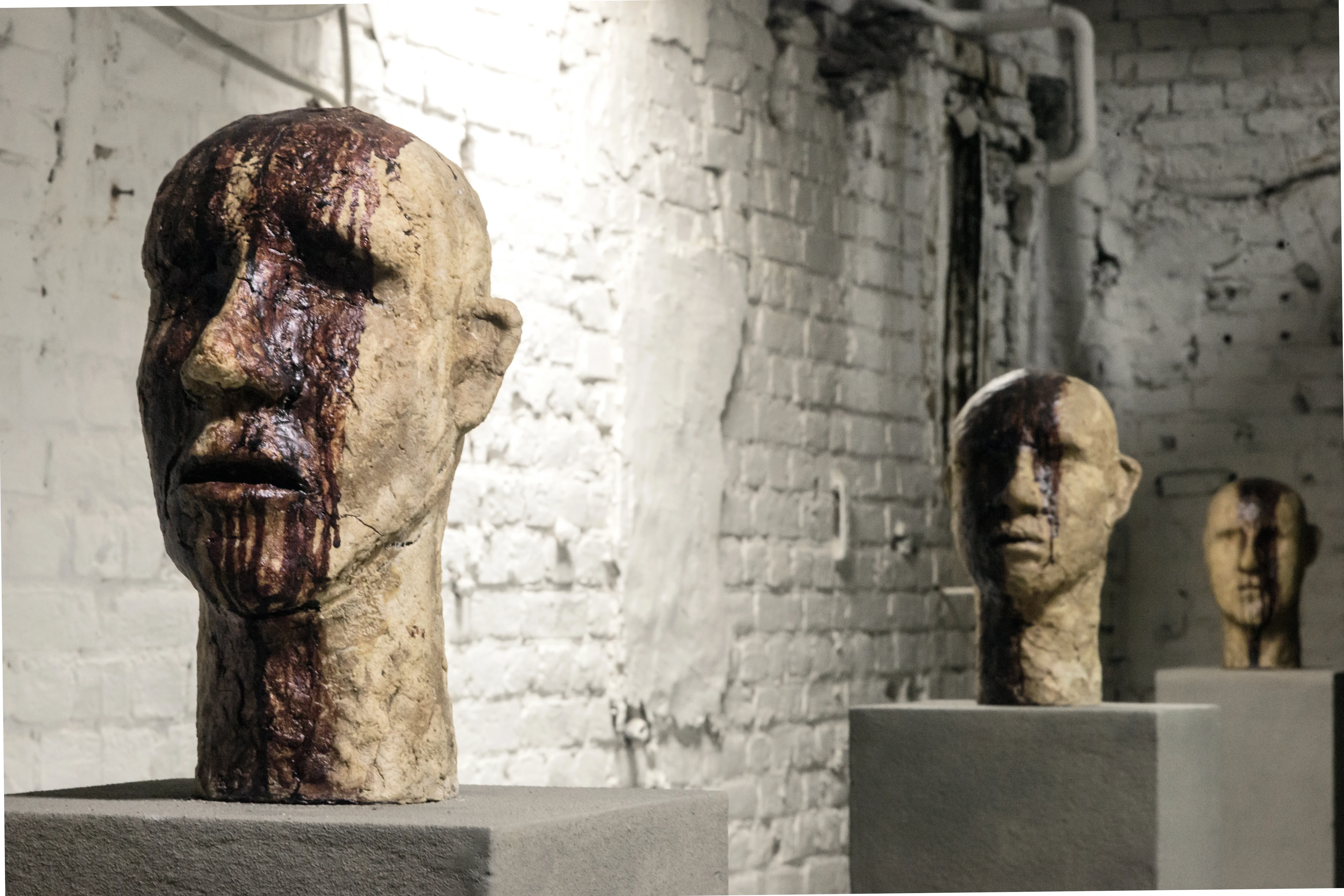 《祈る人たちと英雄たち》(2016-19)には、独房、あるいは墓のような1104の小部屋があり、どの部屋にも、パンで作られた祈る人の像が置かれている。その傍らには、やはりパンで作られ作家の血が塗られた6つの男性の頭部像がある。クスキンはこれらすべての像を3年かけて自分の手で作り上げた。「この作品は、私にとって、この国の悲劇的な歴史に対する供物であり、ある種の犠牲なのです。この国の罪のない犠牲者たちに捧げる作品です」とクスキンは語る。