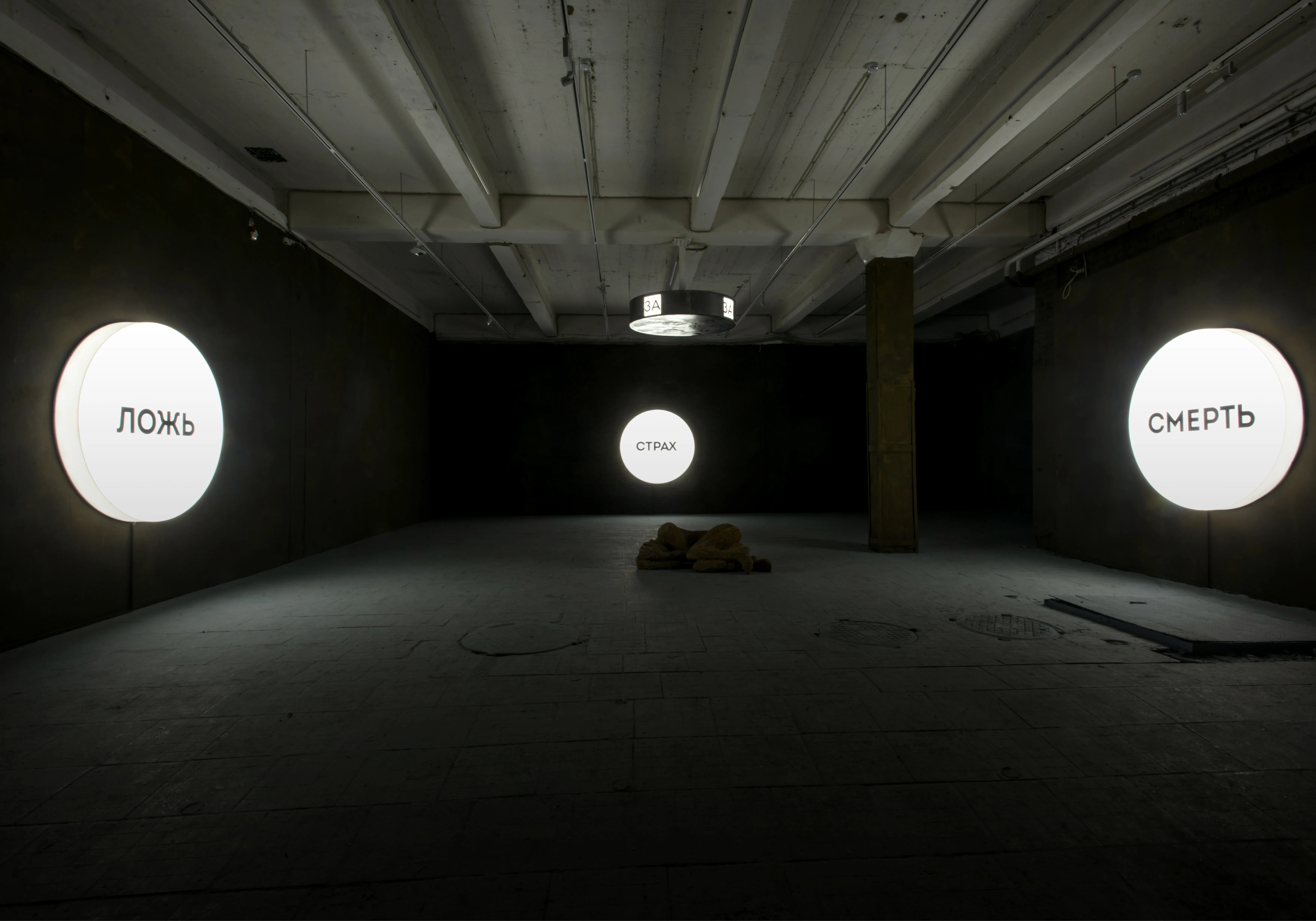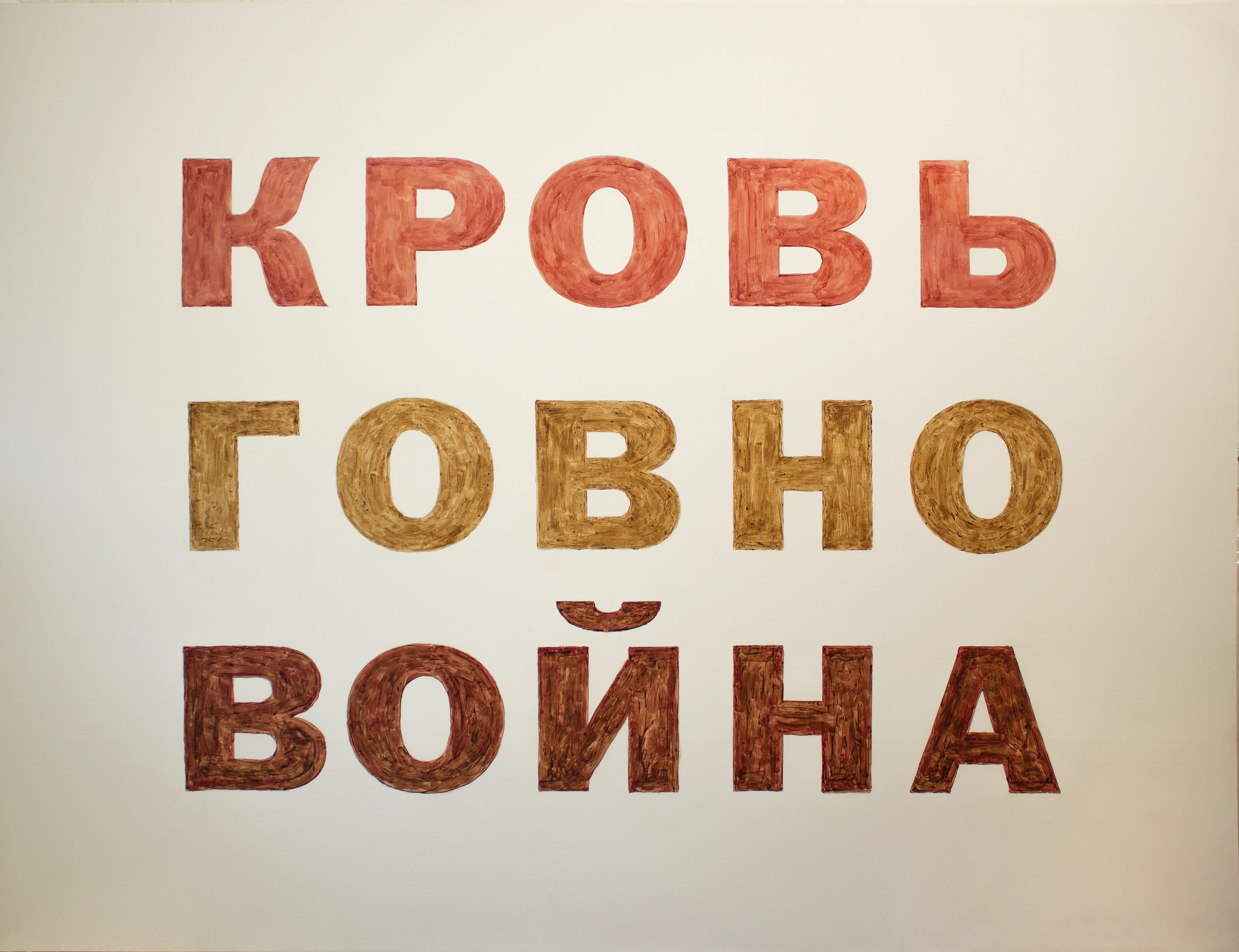 そして今回の2022年の戦争が起こった。クスキンは、戦争勃発の数日後にモスクワで反戦デモに参加し逮捕され、4月6日、戦争に反対するという声明をあらためて発表し、5月15日には、今回の戦争に抗議する初の作品《混合》(2022)を完成させた。作家は、「血、糞、戦争」という言葉を、それぞれの言葉が指す材料で画布に描きつけ、「戦争」という言葉は、血と大便を混ぜた材料で描いている。