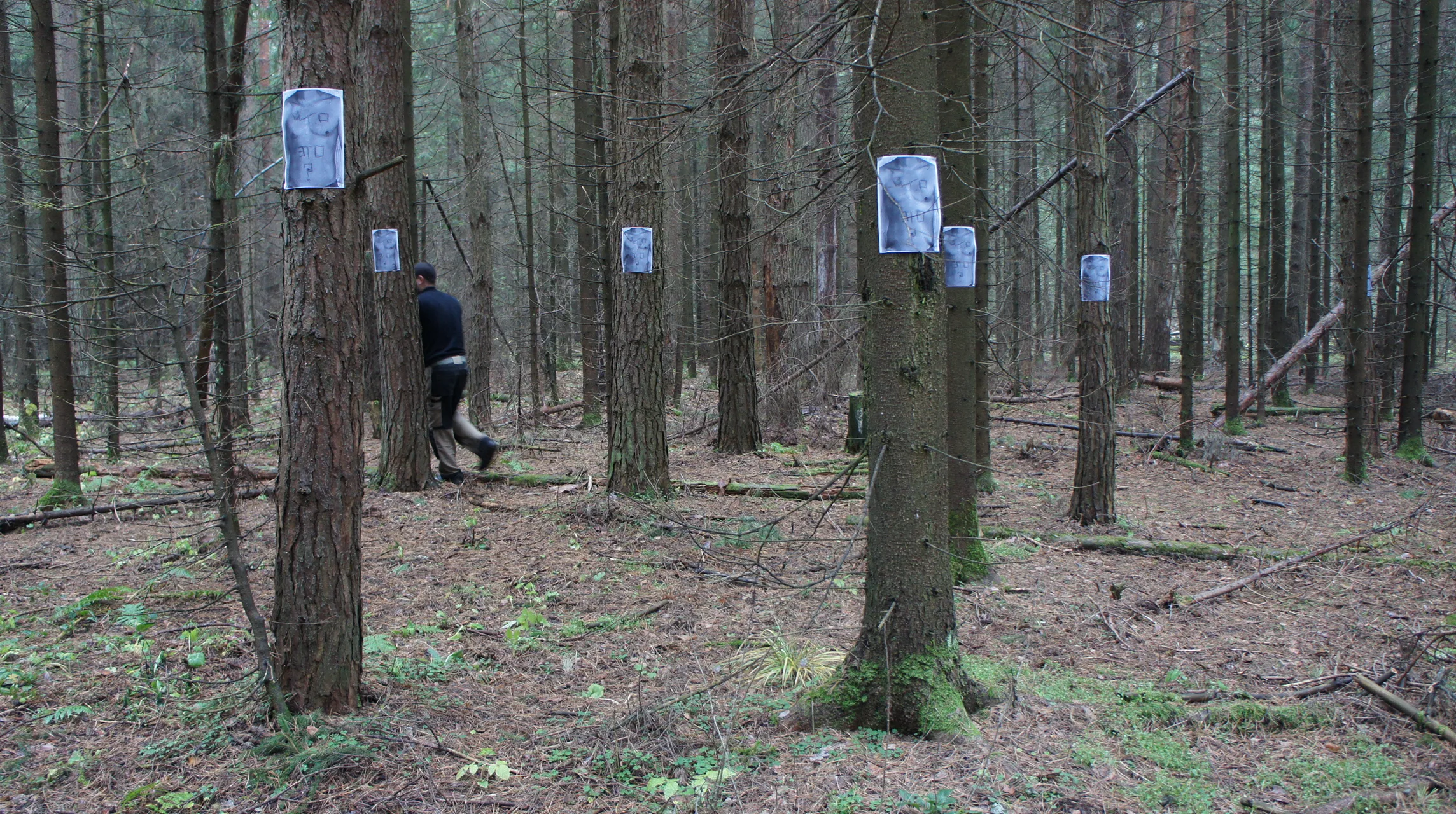 その後、作家は、《基本的な質問》のパフォーマンスで撮影した自分の身体の写真はまるで広告写真のようでもあると感じ、公共空間に貼ろうと考え、同一の写真をモノクロで93枚印刷し、モスクワ郊外の森に貼り付けるアクション《広告》を実施した。ほとんど誰も足を踏み入れることのない森の奥に「広告」を貼るこのアクションは、アンドレイ・モナスティルスキー(1949〜)を中心とするソ連の非公認アーティストがモスクワ郊外で展開していた「集団行為」のアクションに通じるとクスキンは語る。