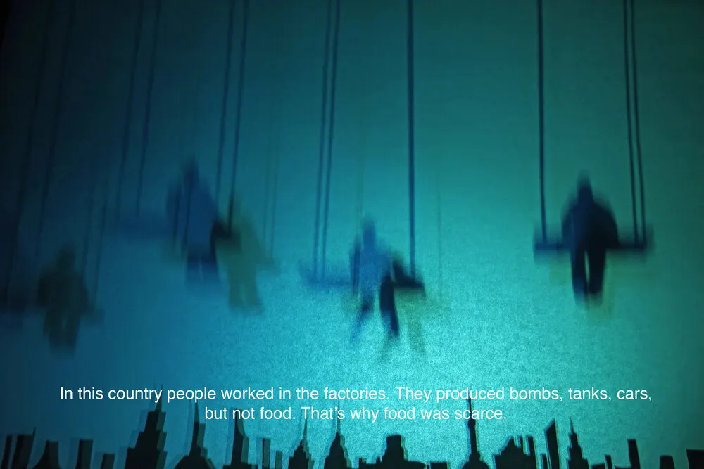 《この国で》(2017)では、ソ連時代を知らない子供たちに「ソ連で人々はどのように暮らしていたか」というテーマで作文を書いてもらい、それをもとに9分33秒のフィルムを制作。映像自体は、揺らめく影絵の手法を用いていることもあり、過ぎ去った時代、いまは存在しない国をめぐるノスタルジーを感じさせるものだ。しかし、そこで人々がどのような服を着て、どのように余暇を過ごしていたかという、当時の生活をめぐる子供たちの想像を通じてソ連を描くことで、国家の教科書的なイメージは異化されている。ソ連の貧困や弾圧にも言及することで、2000年代以降にロシア社会の一部で広まった「懐かしむべき大国ソ連」というプロパガンダへのアンチテーゼともなっている。また、このプロジェクトは、経験していない自国の歴史を人はどのように想像するのか、その背景にどのような教育や語りがあるのかという重要な問題を提起するものでもある。ムロムツェワは、影絵の手法は、第一に過去への追憶と、第二にプラトンの洞窟のイメージと結びついていると語る。