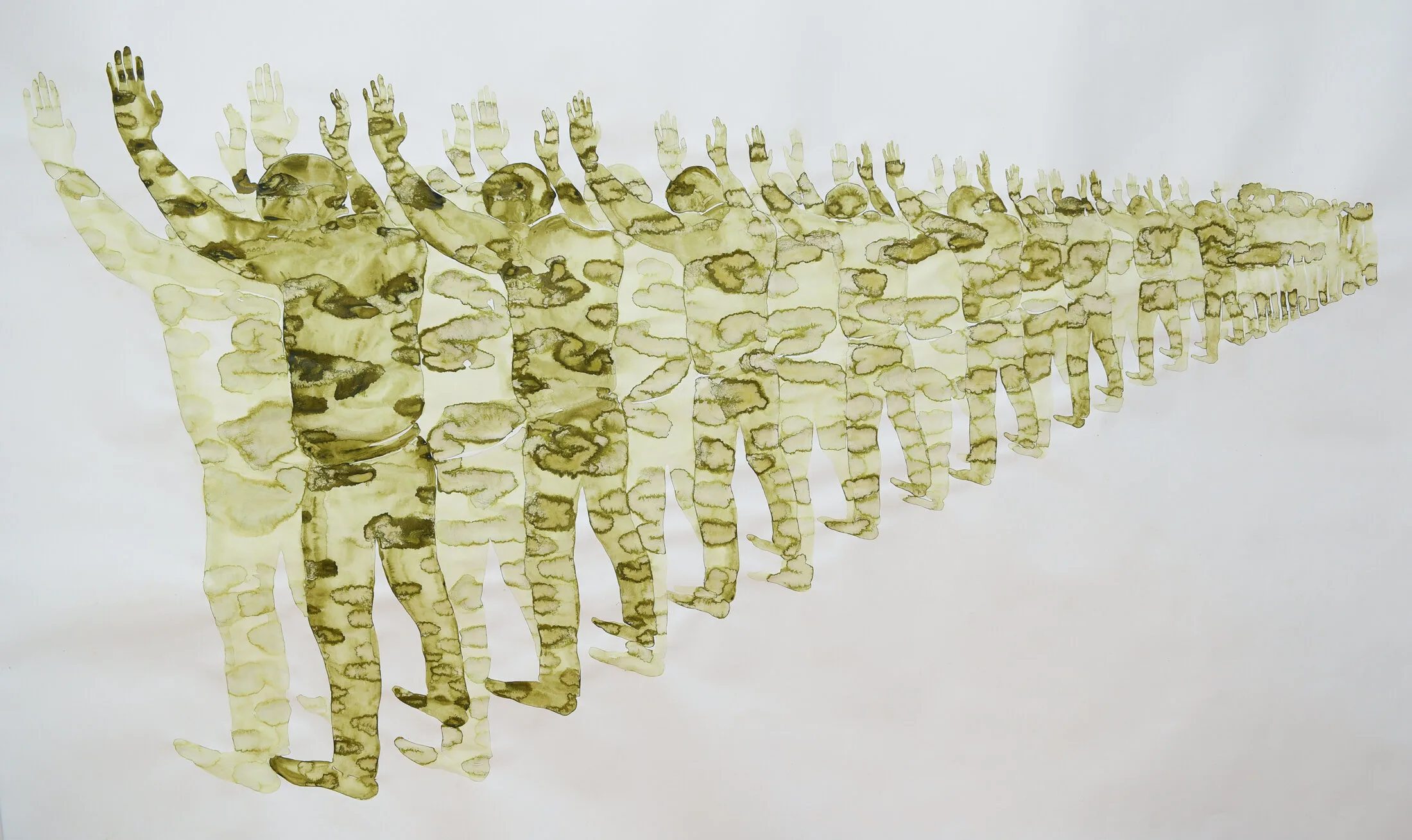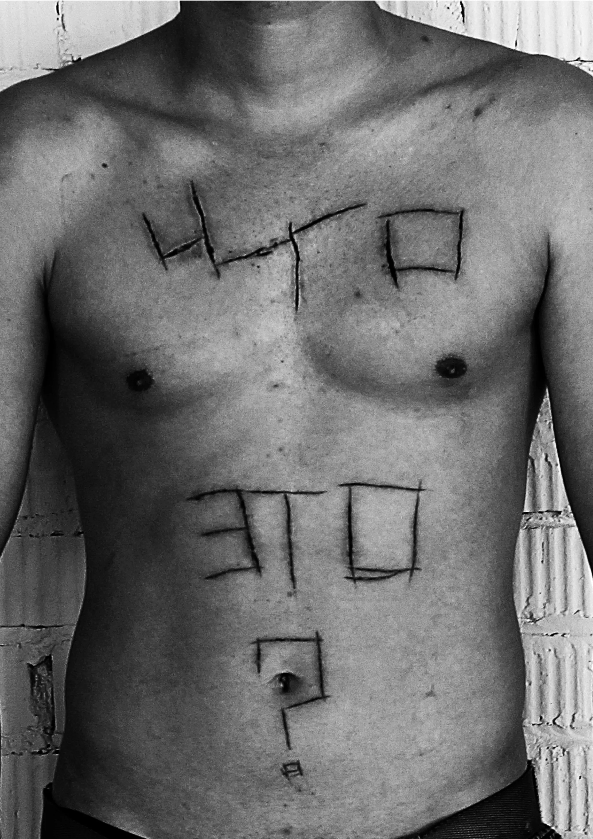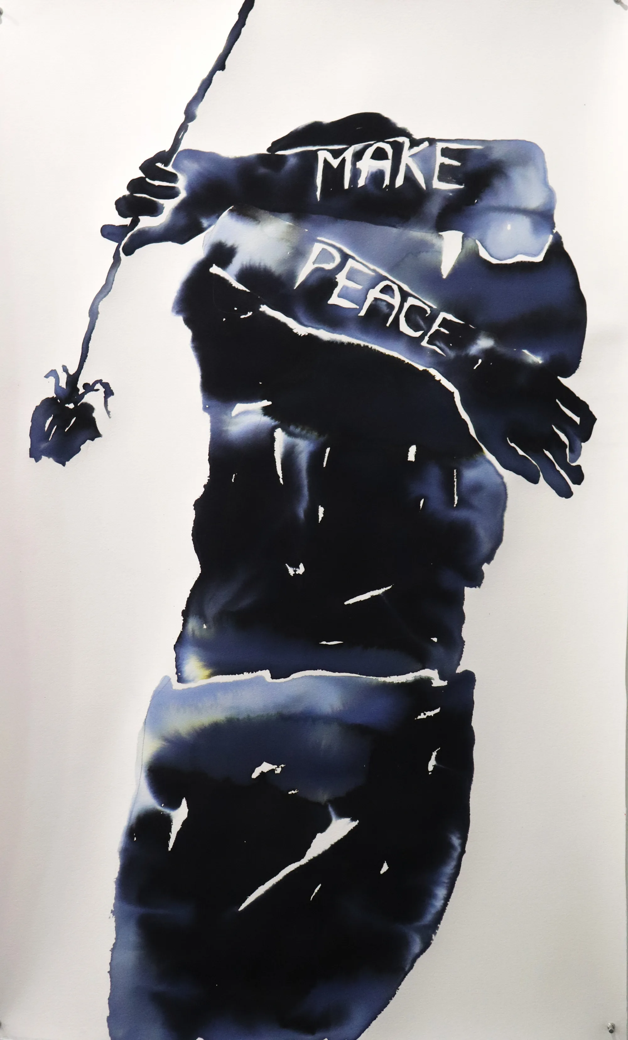 「私はこの《混合》という作品を作り、血と大便を塗る様子を写真と映像に撮り、Facebookで公開しました。でも、この作品を公共空間で公開することは、到底不可能です。ギャラリーに提案さえしませんでした。拒否されるのが分かっているからです。それは危険なことですし、理解できます。誰も、国に罰せられて、罰金を払ったり刑務所に入りたくはありません。なぜこれをしようと決意したか? なぜなら、あらゆる戦争は血と糞であることを人々が忘れているように思えたからです。人はすっかり愚かになり、基本的なことを学び直すために小学校へもう一度入学する必要があるからです。だからこの作品は、初等読本のようなスタイルで描かれています。とても単純な作品ですが、人々に働きかける作品だと思います」。