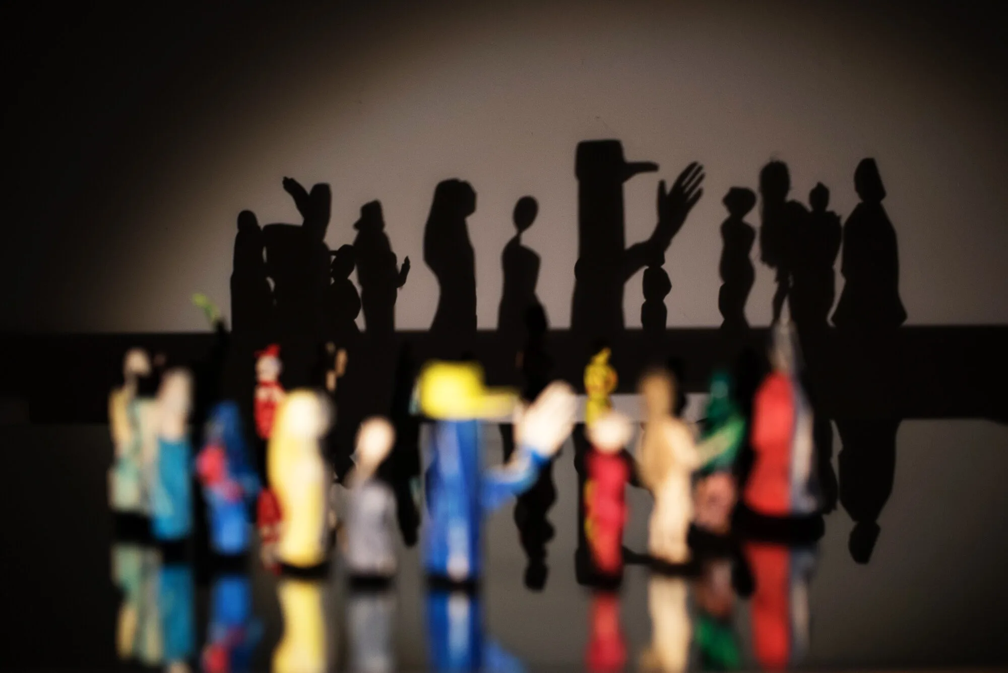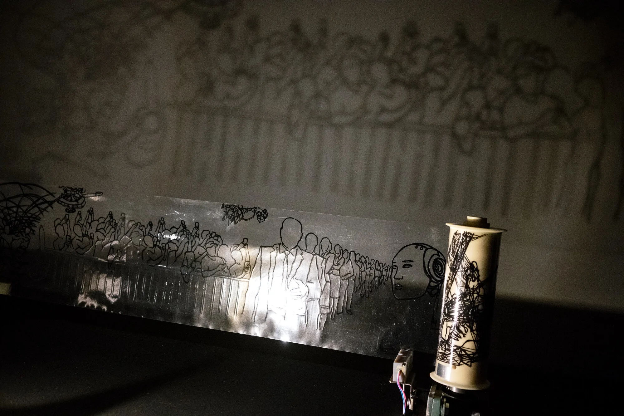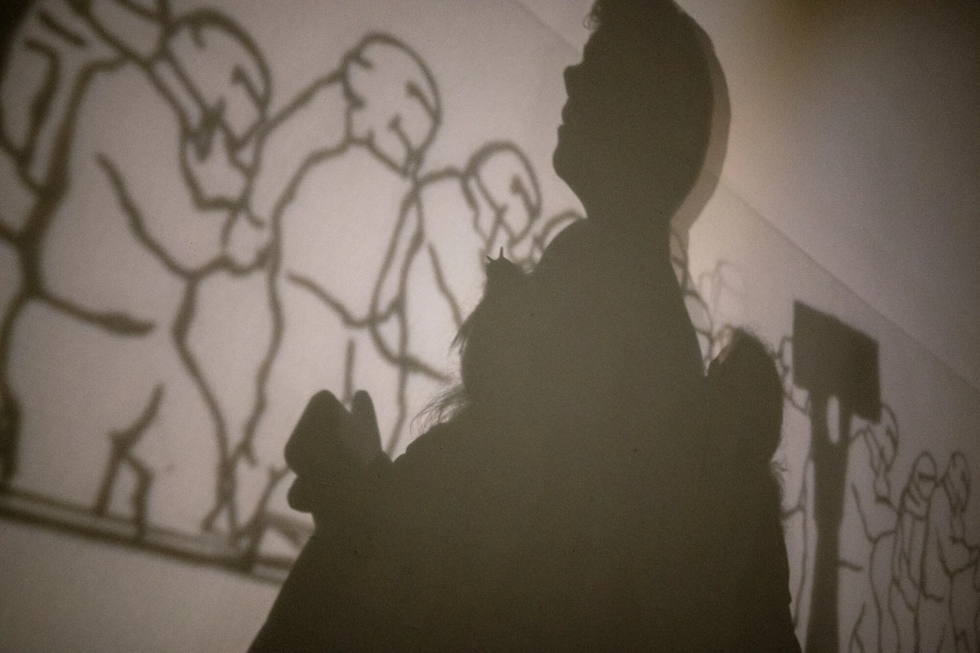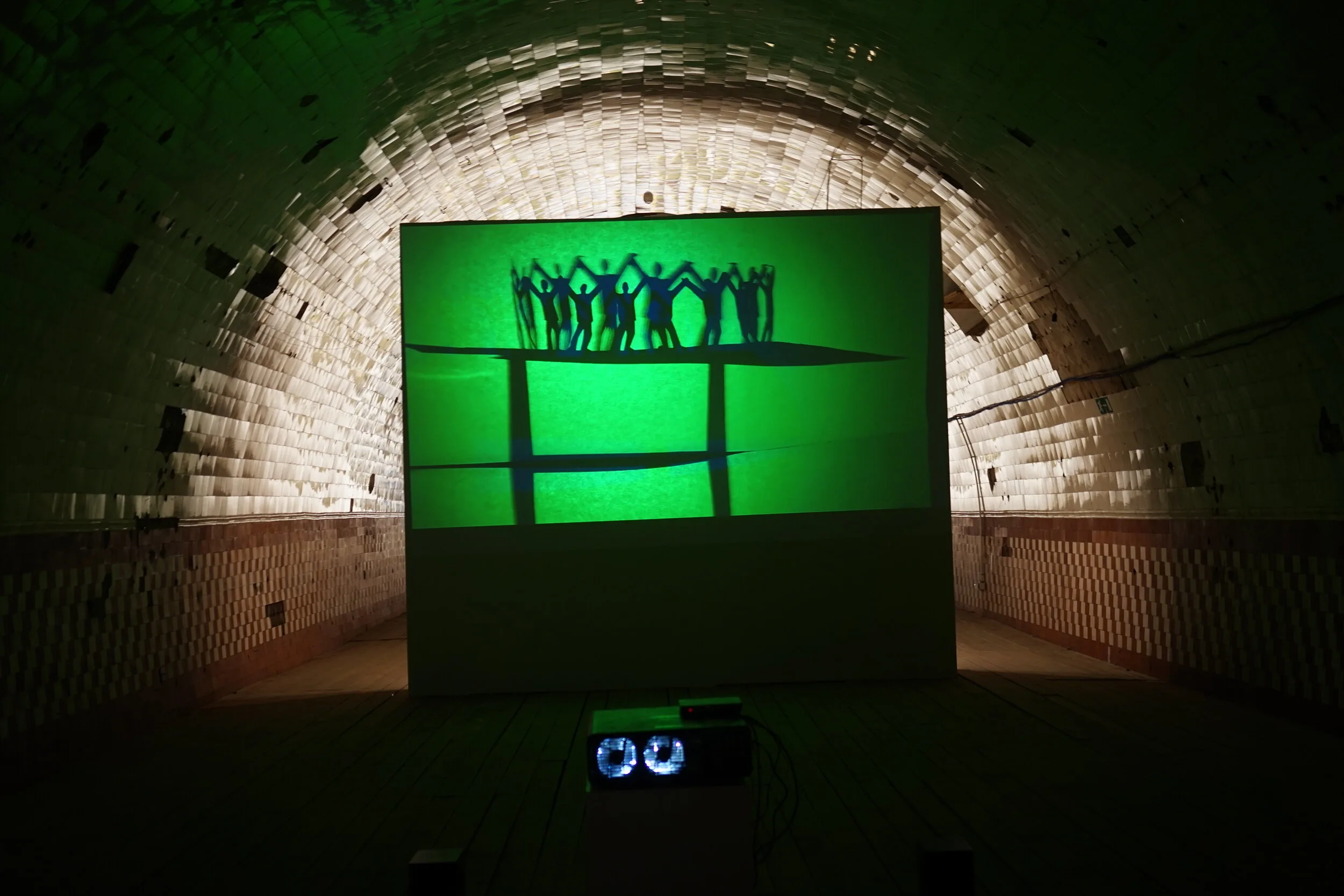 《この国で》や《違う時間》からも明らかなように、歴史もまた、ムロムツェワの主要な主題である。《12時15分前》(2018)は、20 世紀初頭のロシア象徴主義詩人アレクサンドル・ブロークの革命をテーマにした詩「十二」にインスピレーションを受け、影絵によって革命のリズムを映し出し、集団的な期待と変化のサイクルを表現した作品である。この作品では、観客の影もしばしば作品と重なり合い、時空を超えたつながりが生まれる。