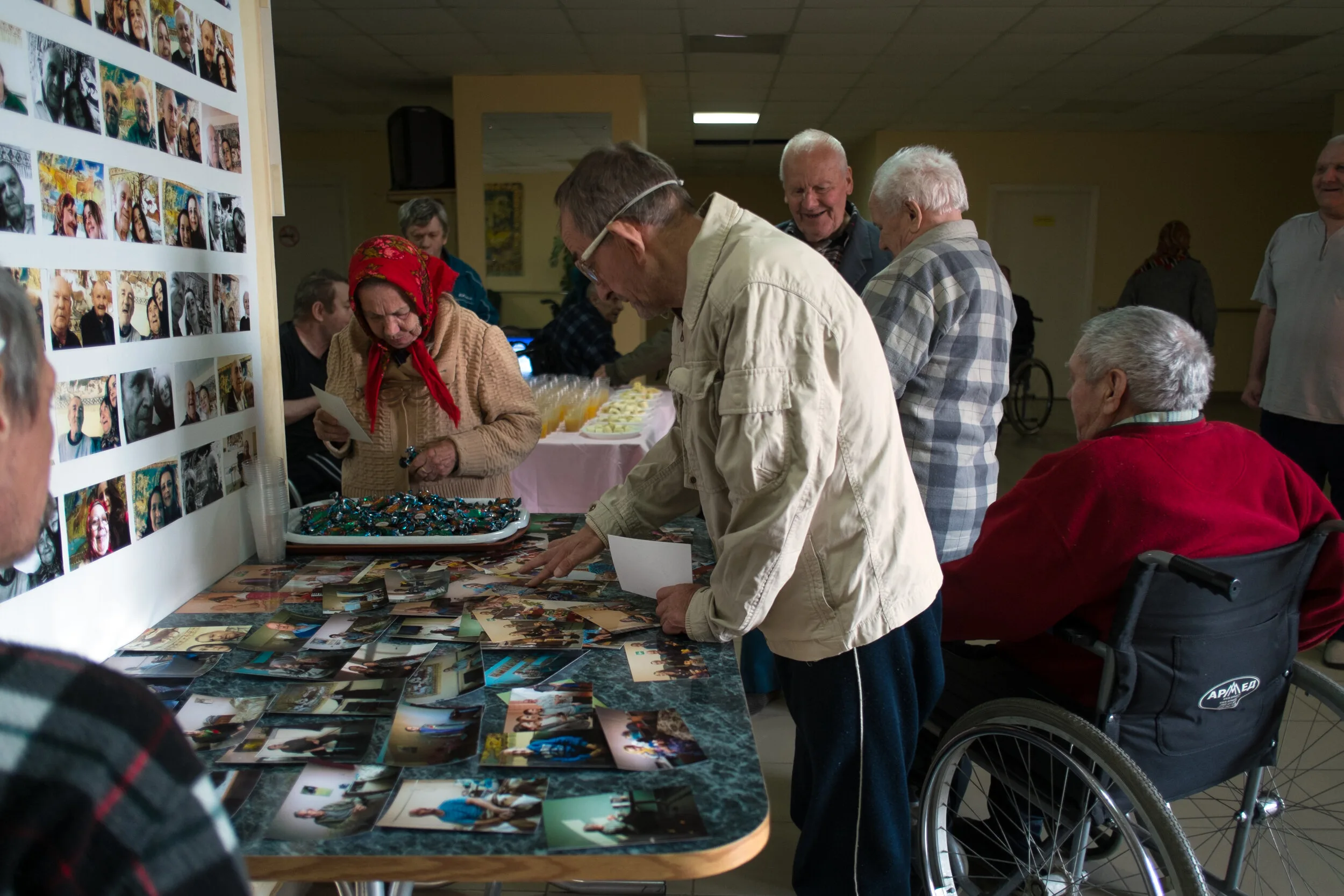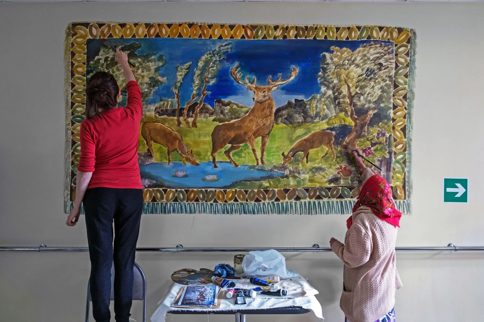 ムロムツェワはこうした意識のもとに、他者の声や物語に耳を傾け、人々との交流のうちに作品を制作してきた。2014年から19年にかけて、ムロムツェワは、ロシアの地方都市トゥーラ県の高齢者介護施設をしばしば訪ね、夏季には数週間にわたって入居者と共同生活を行いながら、彼らとともに施設の壁に何枚もの壁画を描いた。この協働のプロジェクト《唱和する方がいい》について、ムロムツェワは、「私にはアーティストとボランティアの境界がどこにあるのかわかりません。どんなアーティストも、〈人生〉という巨大な組織のボランティアなのかもしれません」と語っている。