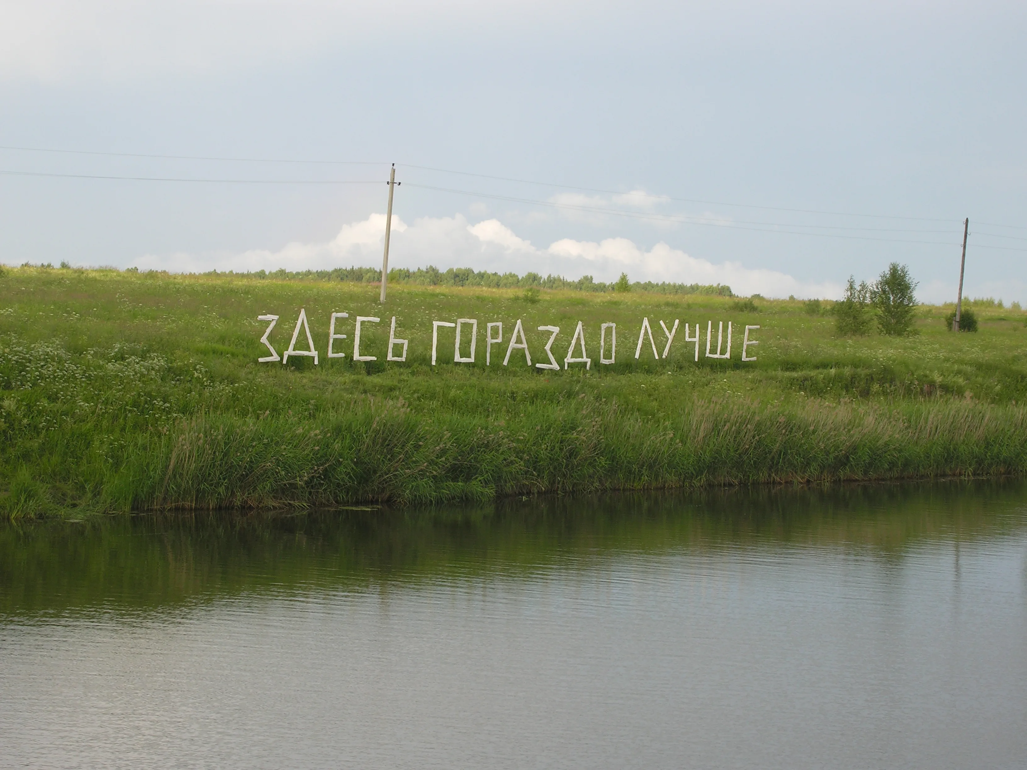 なお、クスキンは2008年にモスクワ郊外で、観客がいる川岸の対岸に、「こっちはずっと良い」と書かれた木製の文字を設置するプロジェクト《向こう岸》(2008)を実施しているが、自分たちがいま暮らしている社会の不完全さをユーモラスに摘発するこのプロジェクトもまた、「集団行為」のアクションに通じるものであり、とりわけ、「何も文句はないし、すべていいと私は思う。ここに来たことは一度もなく、この場所について何も知らないけれど」という言葉を書いた赤い布を郊外に設置したアクション《スローガン》(1977)をふまえていると考えらえる。