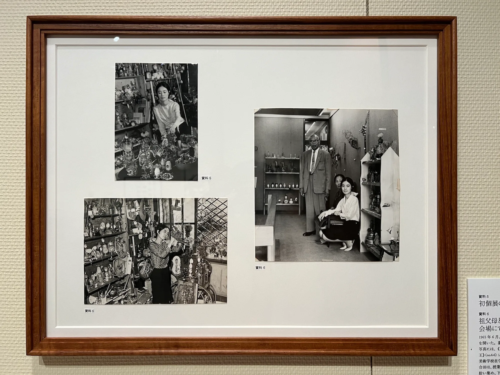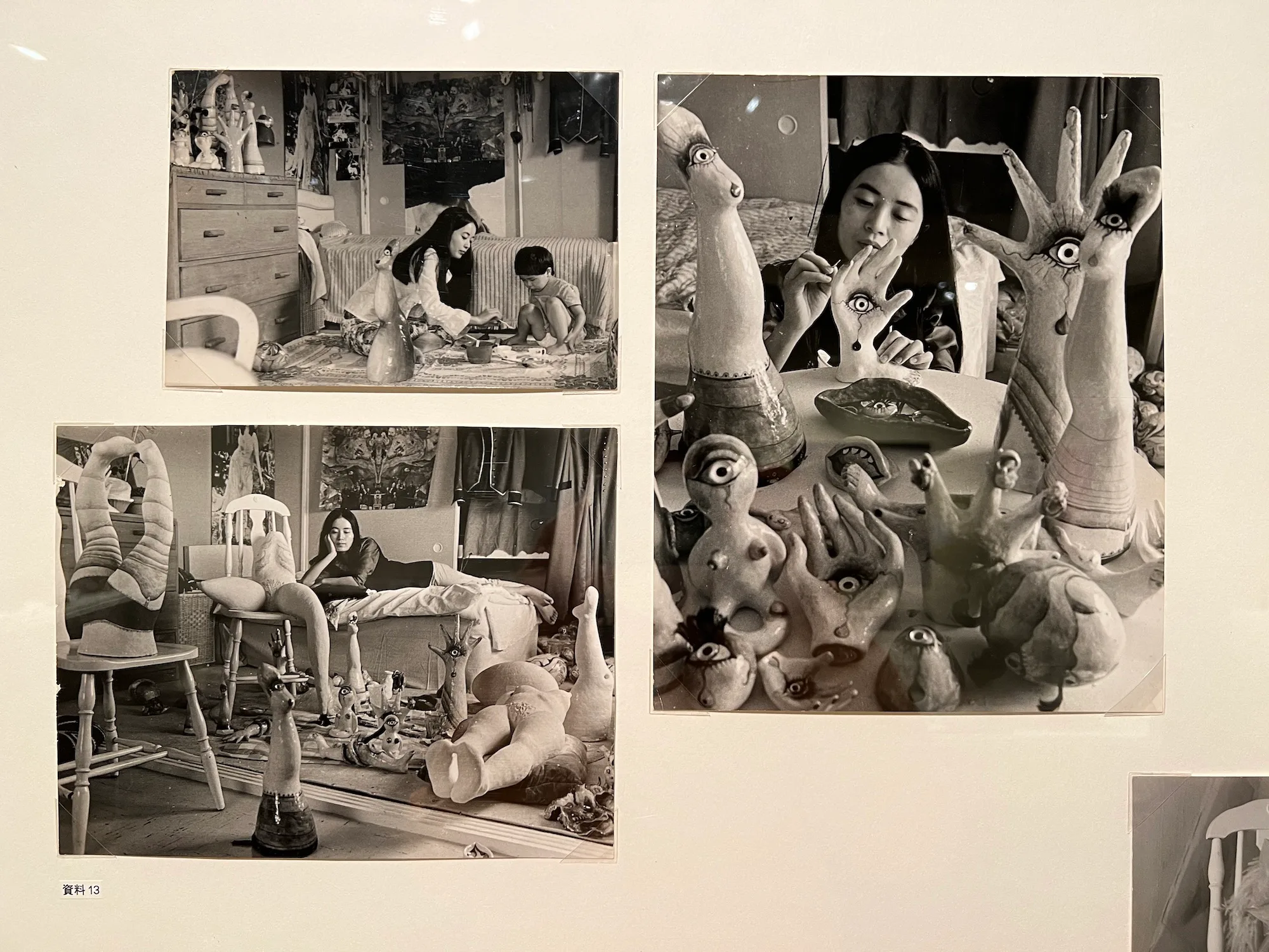 自宅での制作風景を写した写真からは、キッチンで熱心に制作に取り組む姿や、大小のオブジェに囲まれながら堂々たる風格を漂わせる姿を見ることができる。そして同時に、彼女が母子家庭を営み、裕福ではないなかで、制作よりもはるかに多くの時間を家事・育児に費やしていたことも伝えている。