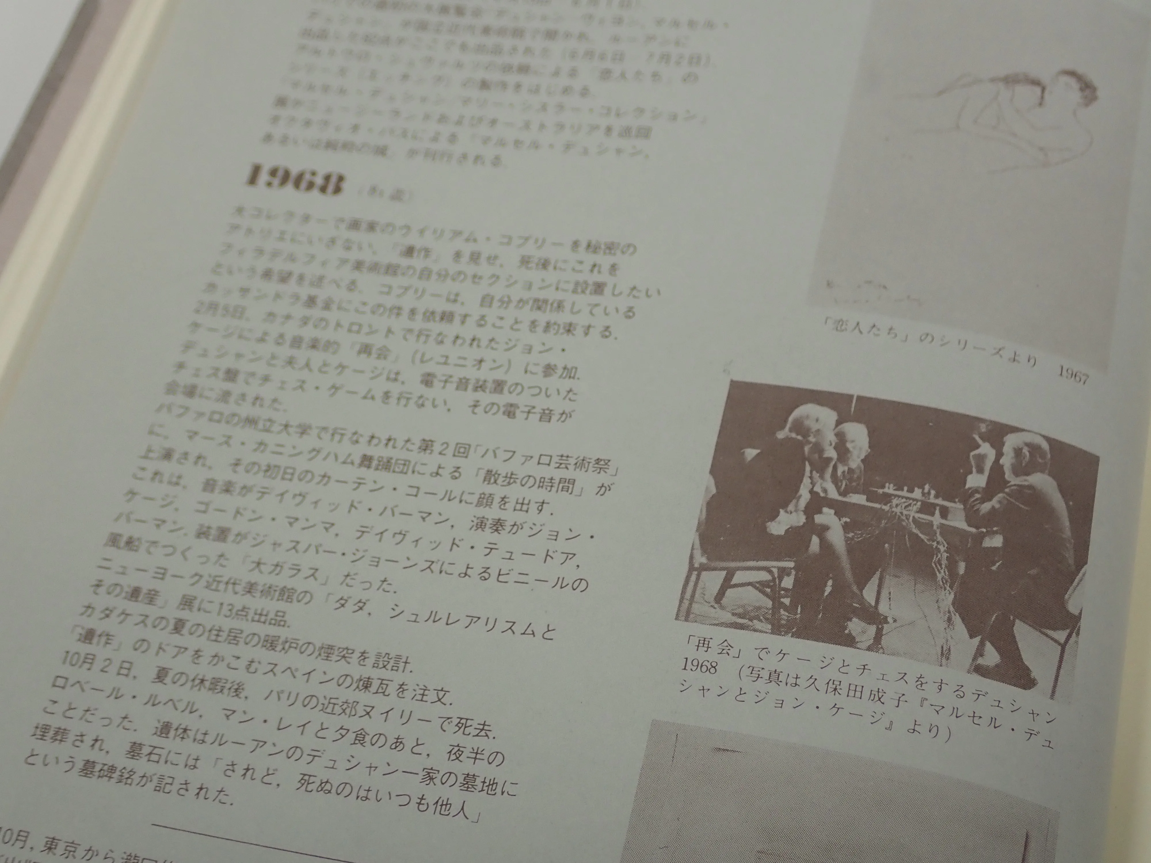 さらに久保田をアーティストとしては無視したに等しい東野芳明の『マルセル・デュシャン』を久しぶりに書庫から出して開いてみれば、ジョン・ケージとデュシャンが音響パフォーマンスとして戦ったチェスゲームのあの有名な写真はほかならぬ久保田成子が撮影したものなのであり、東野自身キャプションにはっきりと彼女の名前を書き留めていた。