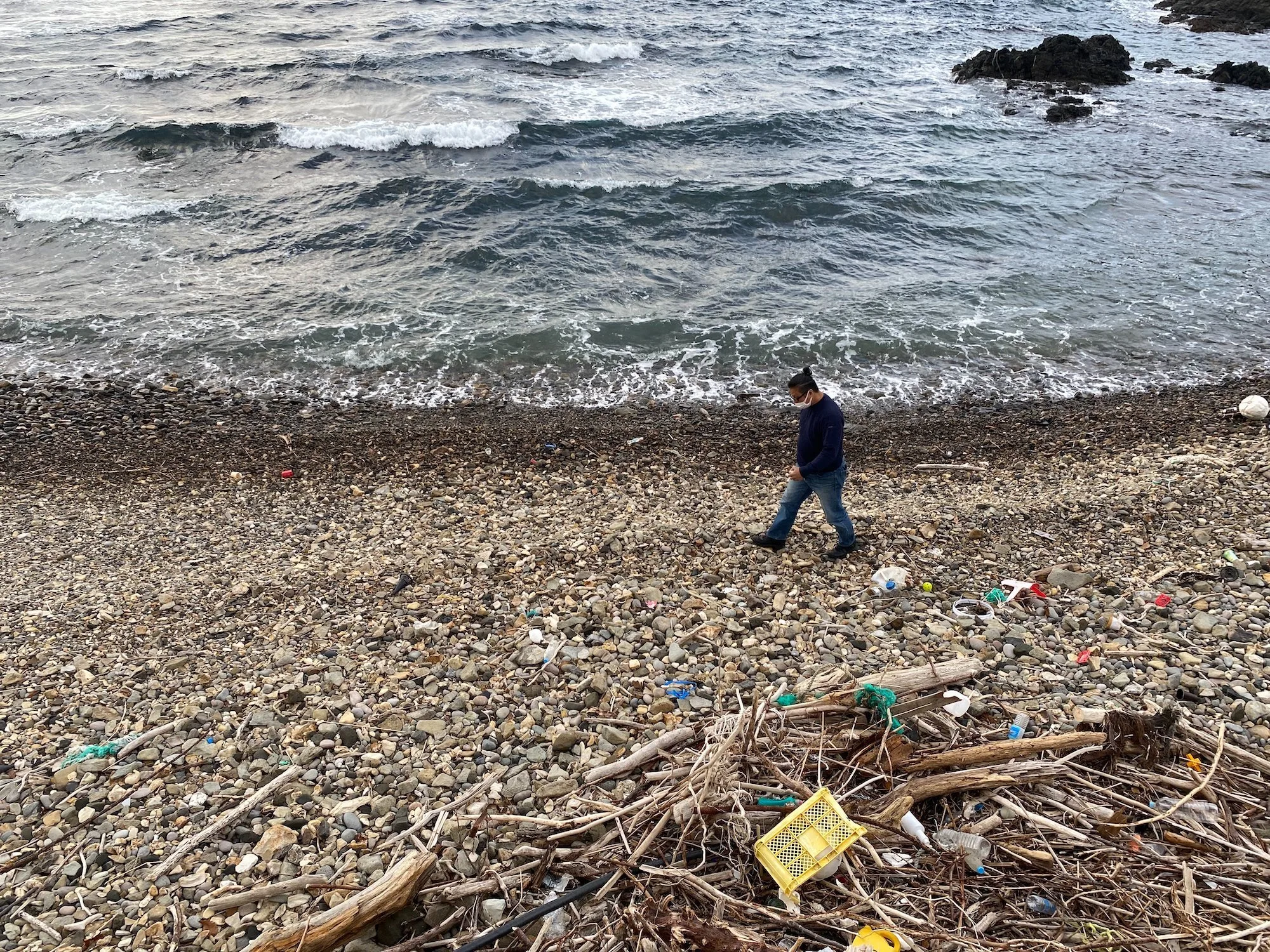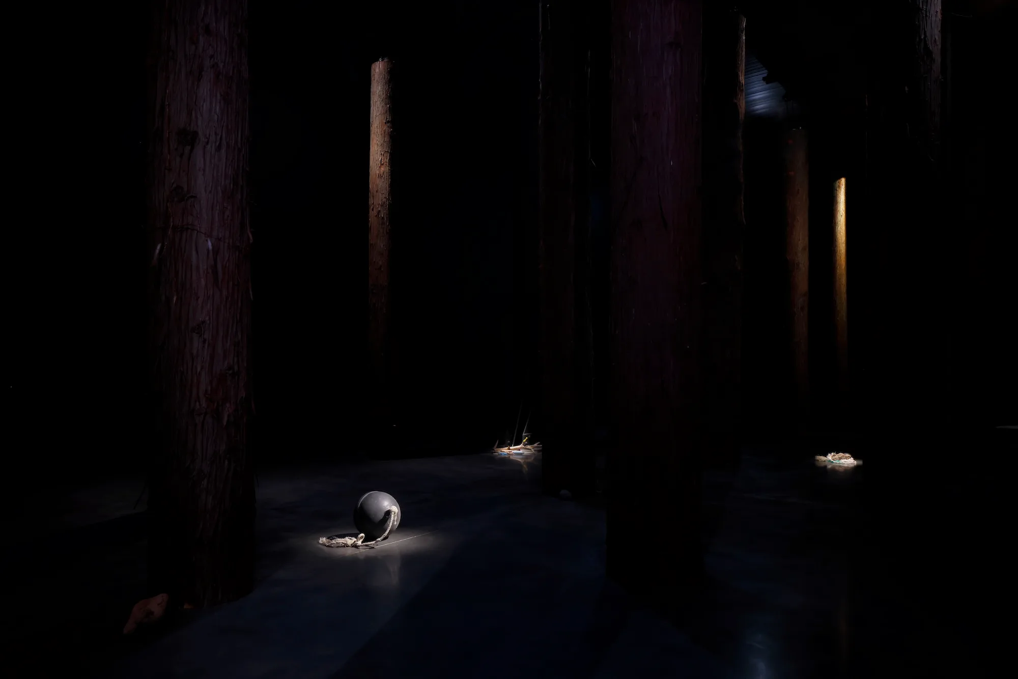 大巻は今回、音や歌を作品に取り入れている。美術館自体をひとつの身体として、奥から声や音が聞こえてくるように構成されているので、音に耳を澄ませながらの鑑賞体験も楽しめる。暗い森の中でキツツキが木をつつく音が聞こえる《KODAMA》もそのひとつだ。本物の樹木を展示室にインストールしているので、木の密度と水分量により音が少しずつ変わっている。キツツキは、先の見えない世界に穴を開け、向こう側にたどり着くための使者でもあり、音はモールス信号になっている。足元には、韓国や中国、台湾など向こう岸の国からの漂着物を点在させている。“精霊の森”の中で、現実の時空間を超えて、向こう側とこちら側がつながっていくようだ。