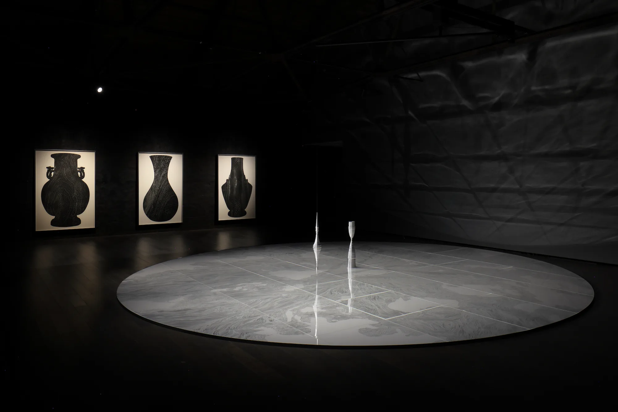 鑑賞者は、この始まりと終わりのあいだで、光の玉が煙となって落ちていく《sink》、世界地図《Flotage》と回転する《Liminal Air -core- 天 IWAKI》《Liminal Air -core- 地 IWAKI》を組み合わせたインスタレーションなどを体験する。