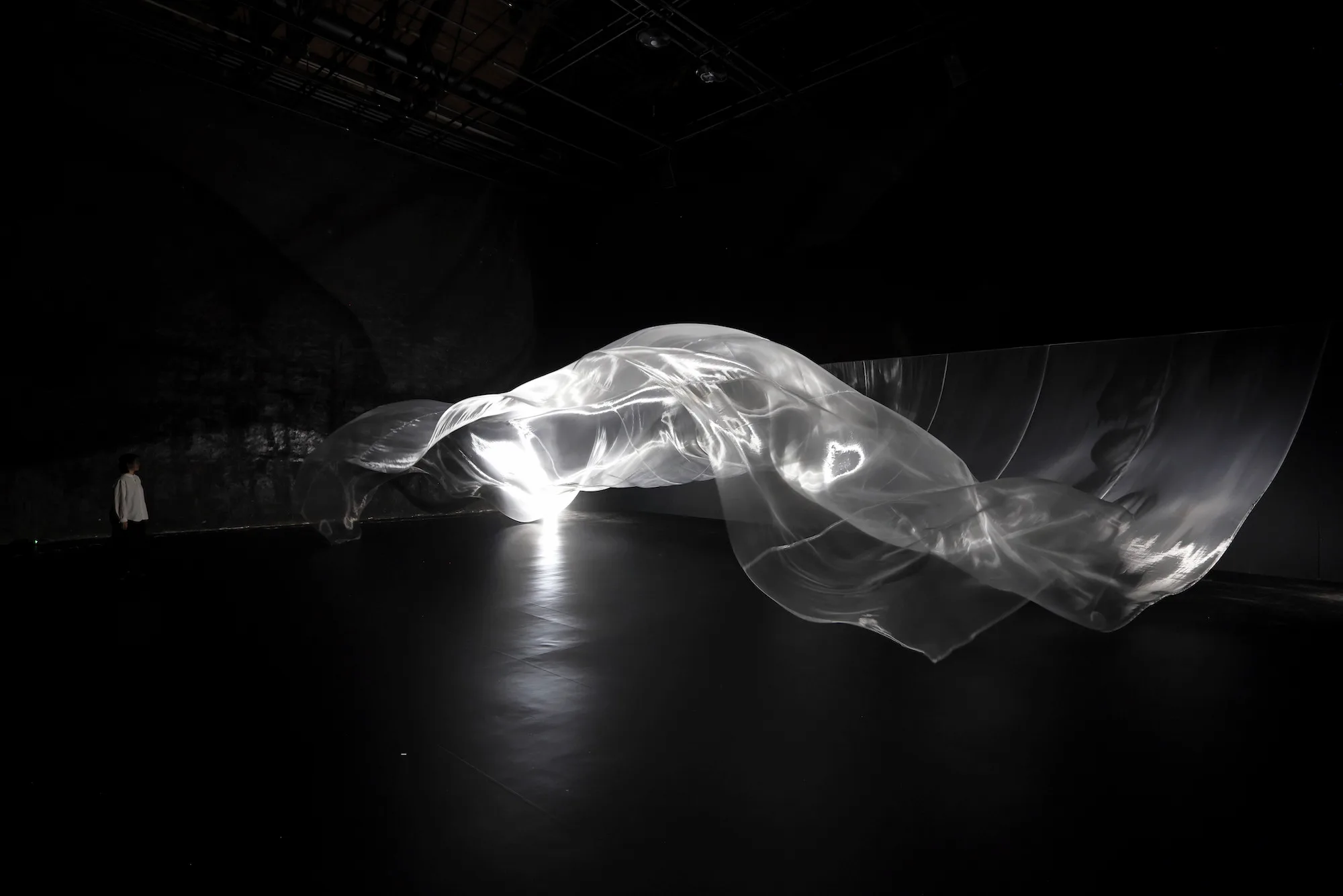 夜の海を想像させる《Liminal Air Space-Time: 事象の地平線》は、《Liminal Air Space- Time》[1] シリーズ最大級、幅約15m×11mの作品を実現した。大巻は、津軽の海の波の高さ、沿岸流域で自然と共存しながら生活を続ける人々に感嘆し、このエネルギーをこそ表現したいと考えた。波のように動く布の中に空気をためながら、スローモーションで上がっていくのは、隆起する陸のイメージだ。このインスタレーションでは、津軽の人々の声を集めて作られた「音」も聞こえてくる。目を凝らしていると、寄せる波にできる空洞が「喉」に見えてきた。
