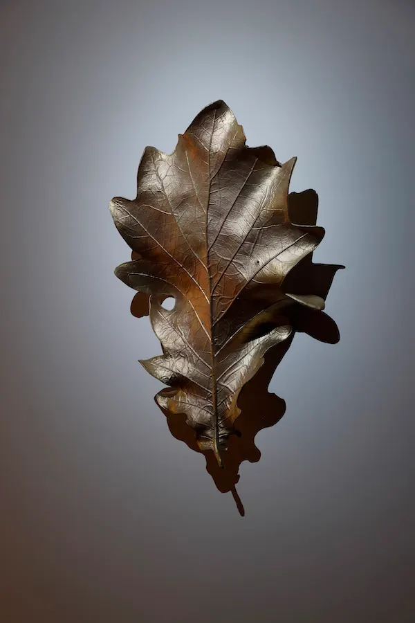 ほかに鬼が腰掛けたという柏の木もある。柏の葉は、春に新芽が出るまで落葉しない。大巻はその葉を人間の掌に見立て、自身の血管をトレースし柏の葉に重ね合わせた作品《Oak Leaf -the Given-(Right)》と《Oak Leaf -the Given-(Left)》を制作。展覧会の入口と出口に展示し、出口は藍染職人の協力で暖簾にした。その根底には、大巻自身が同年に静脈瘤を患い、命の循環について考えた思いがある。
