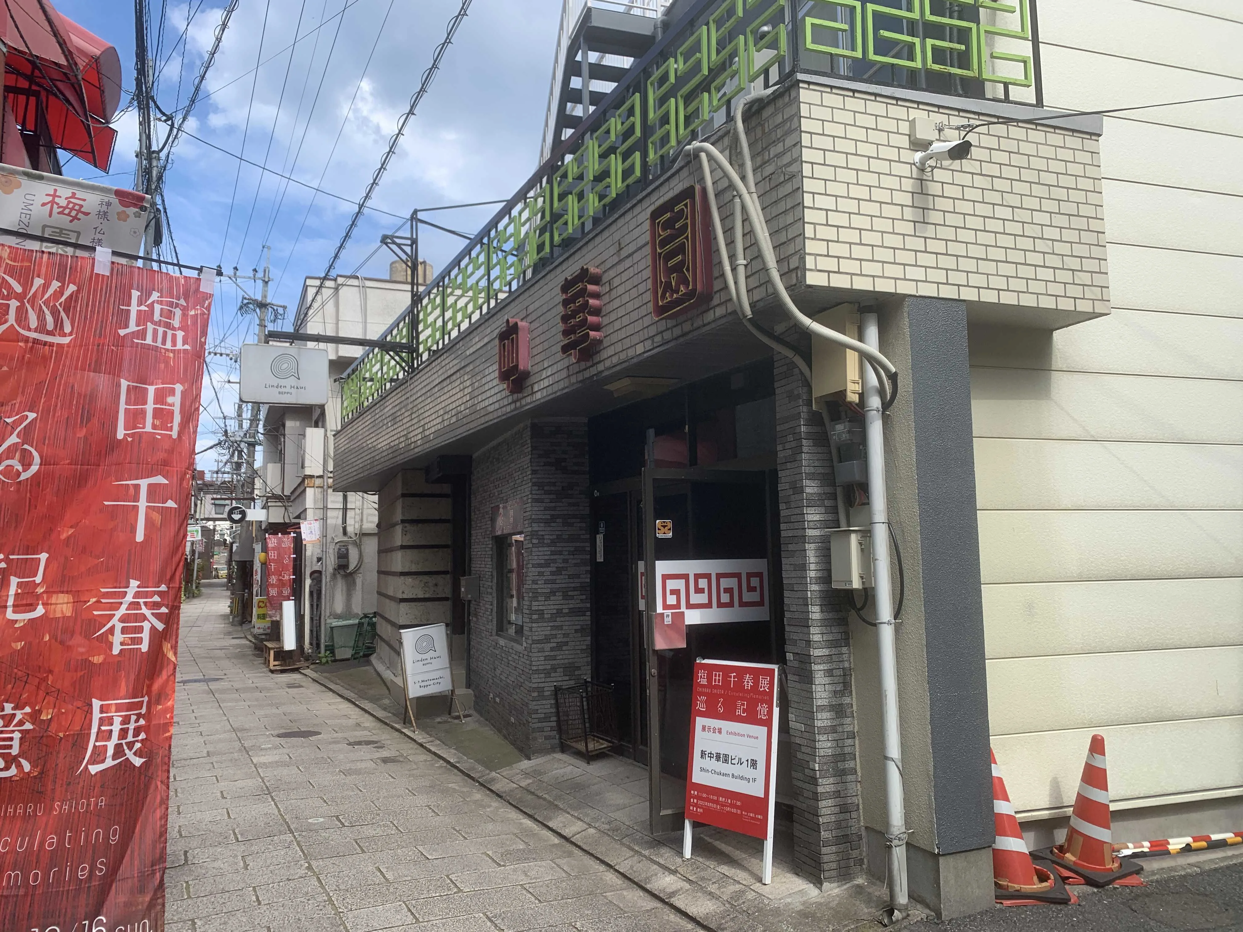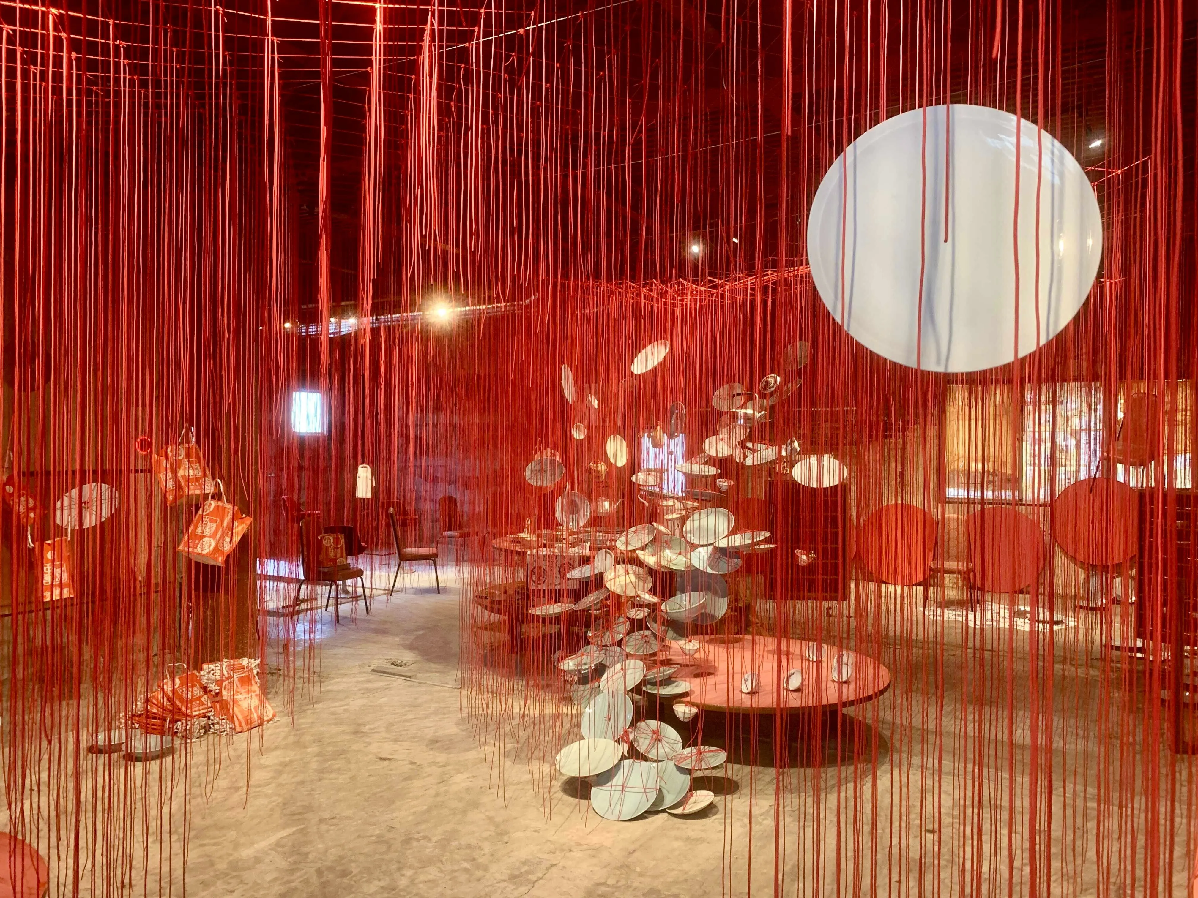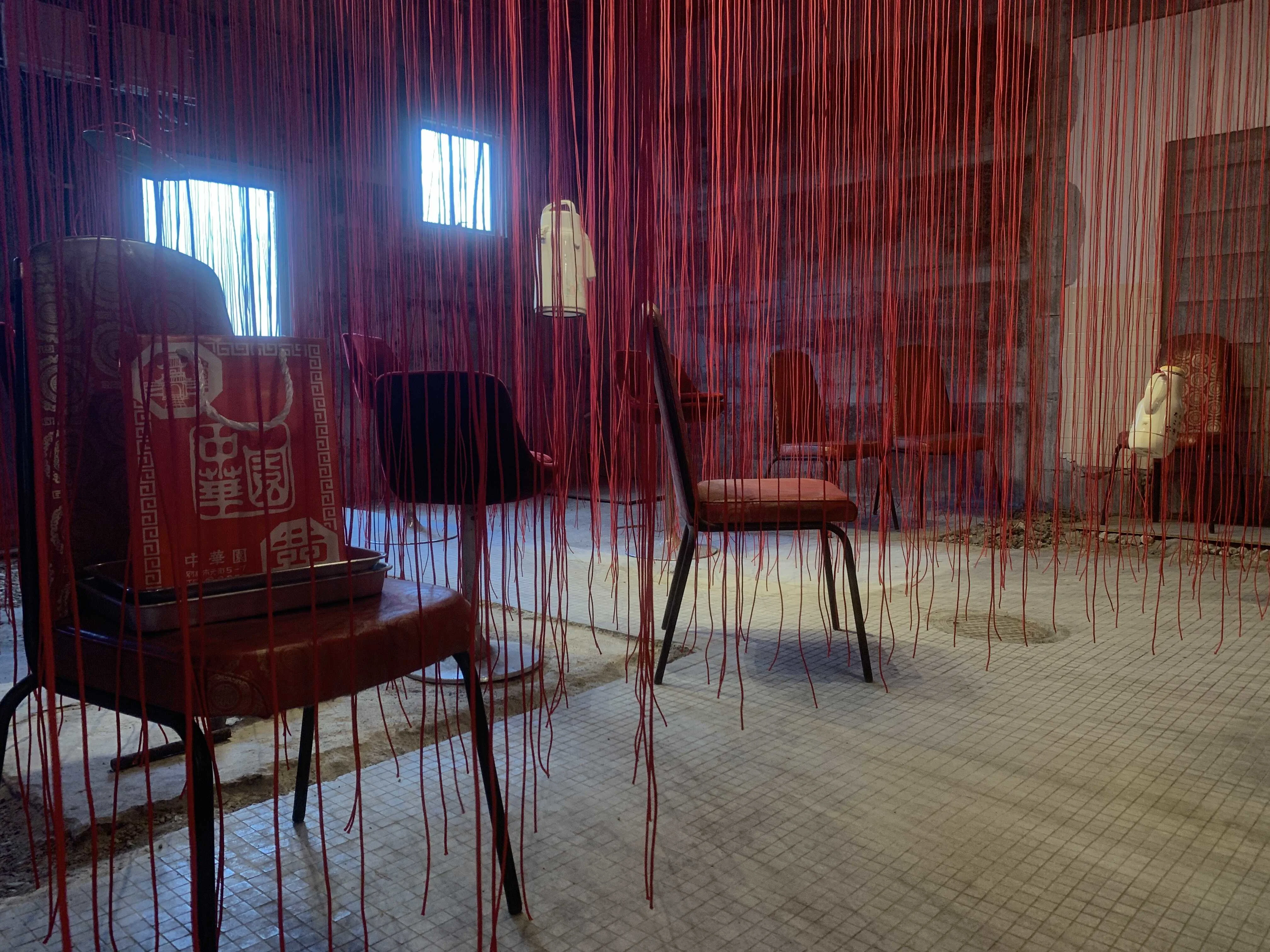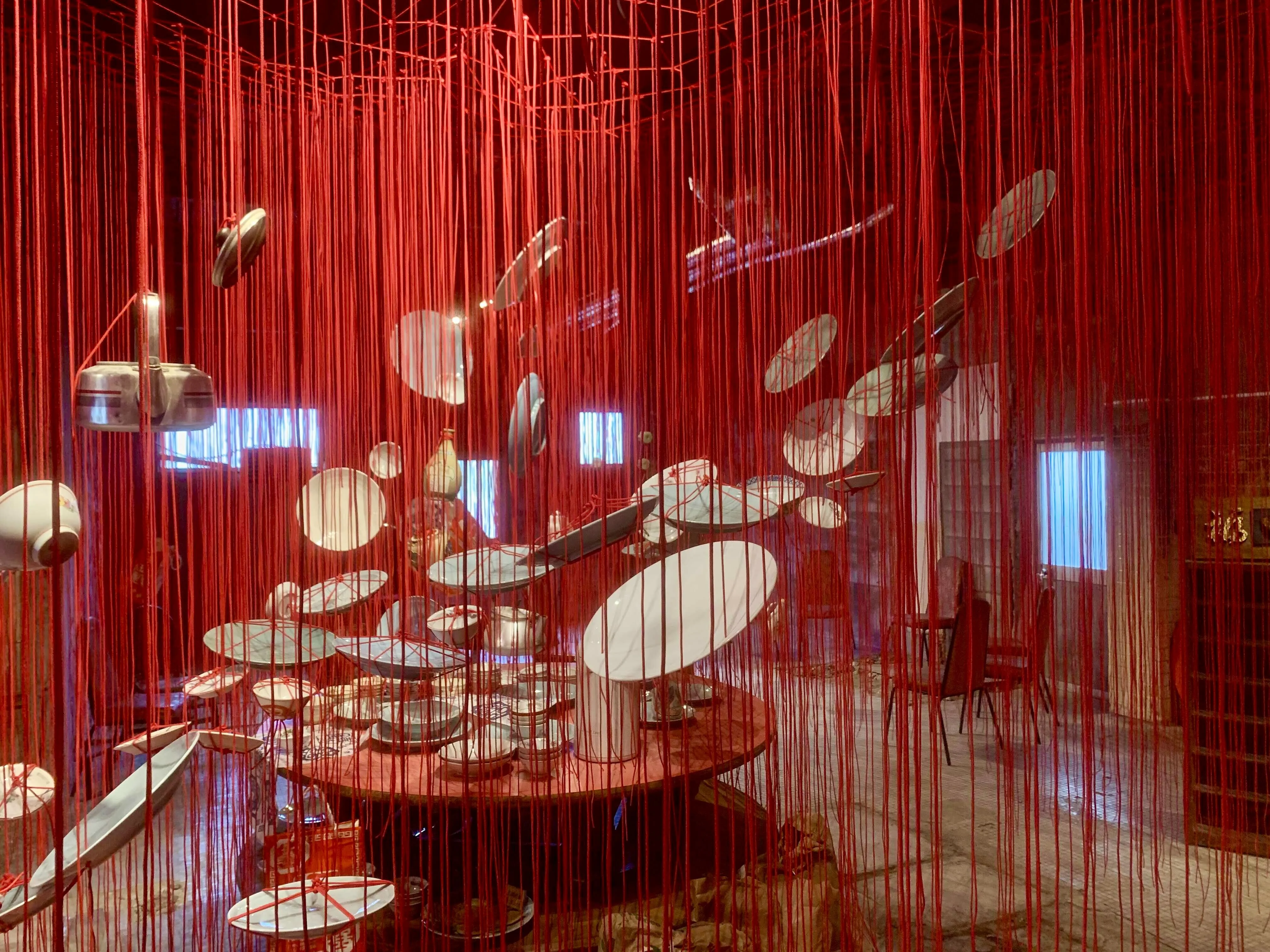 続く会場は、歩いて2分ほどの場所にある「新中華園ビル1階」(別府市元町)。別府市民に長く愛され、約6年前に惜しまれつつ閉店した元中華料理屋の店内を使ったこちらは、静謐で動的な白の世界とはうって変わって、パワフルな赤の世界が広がっている。
