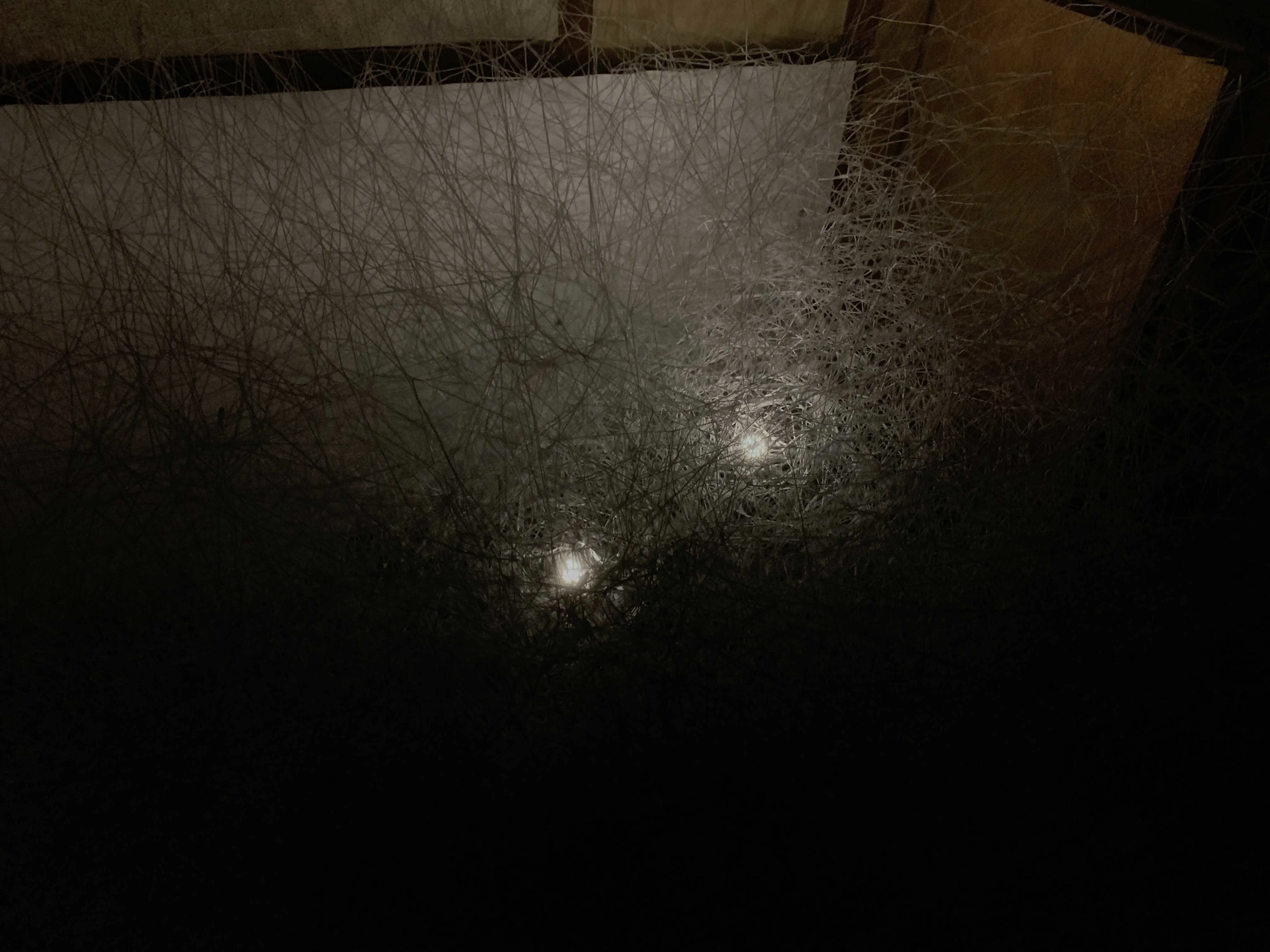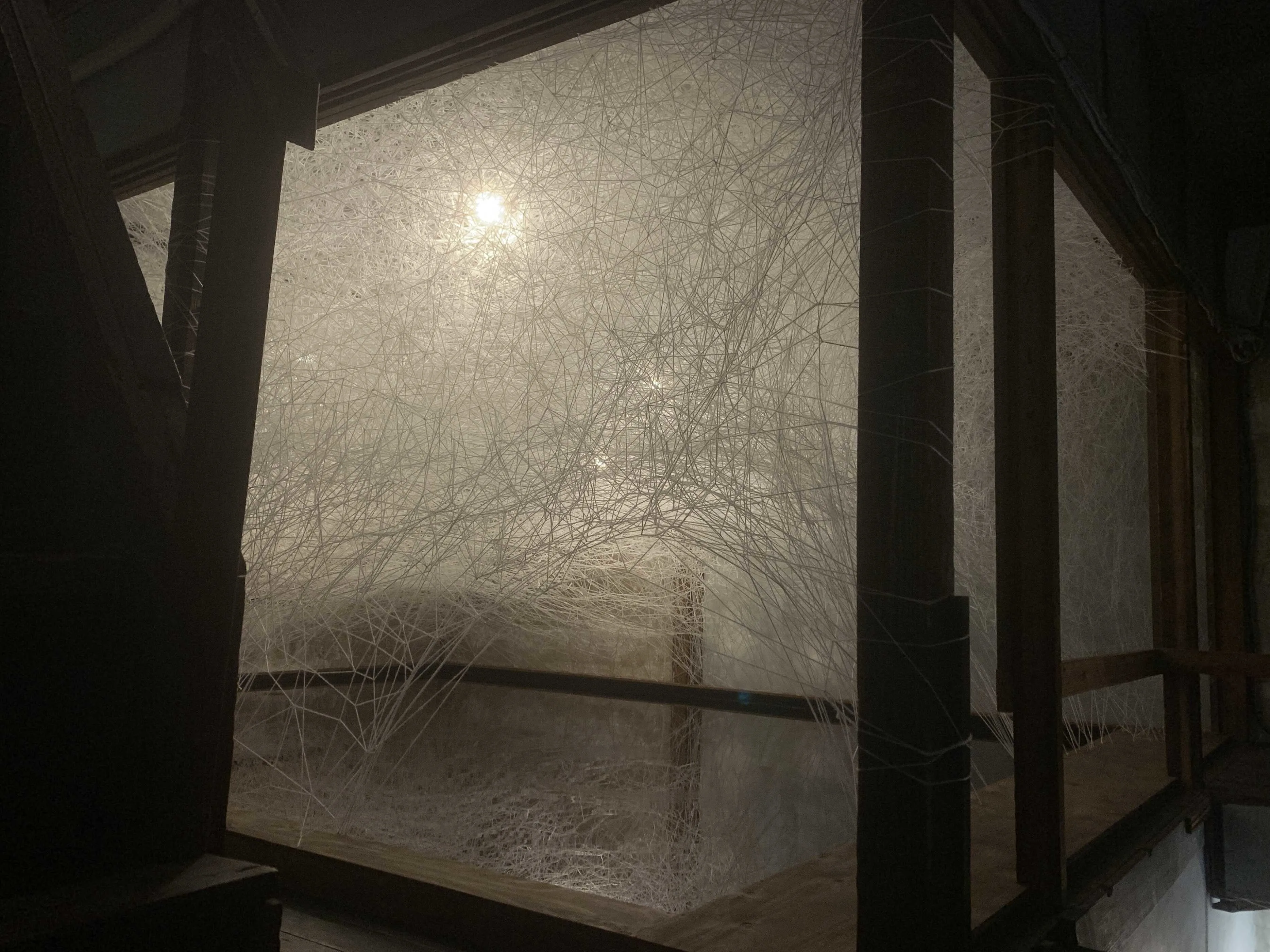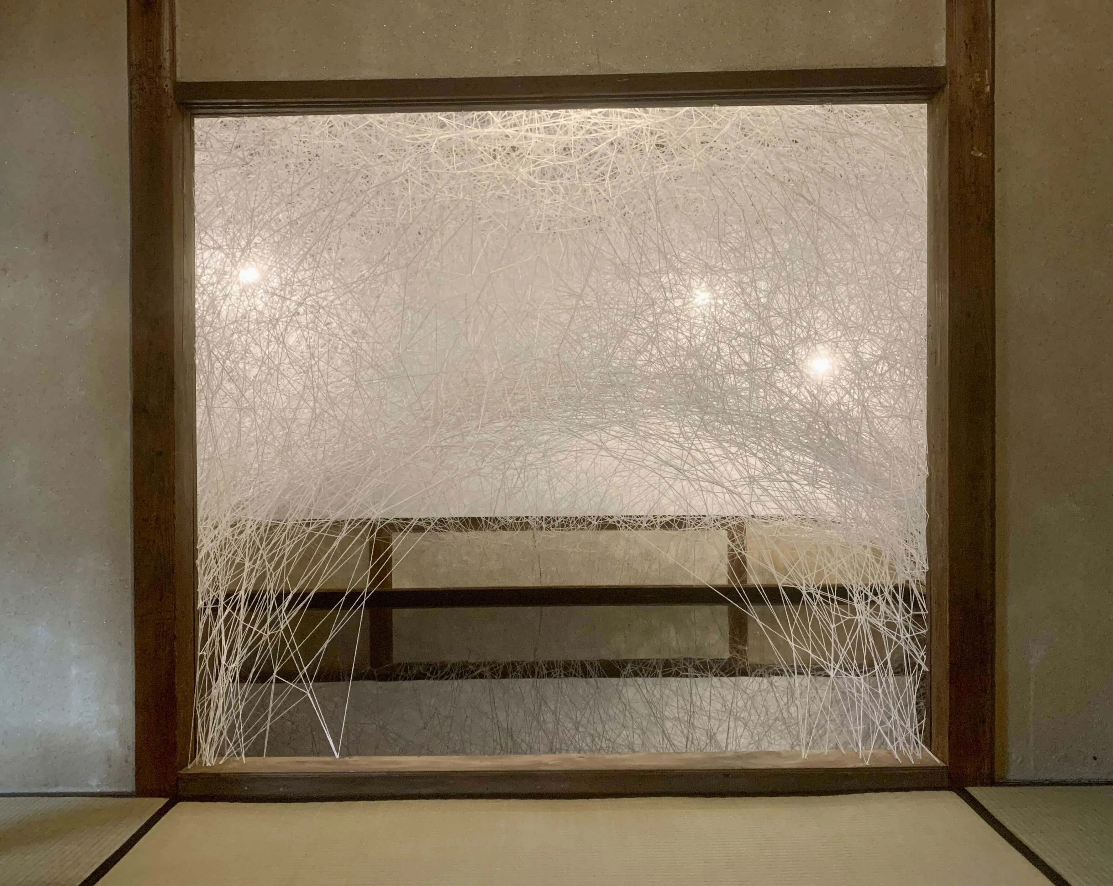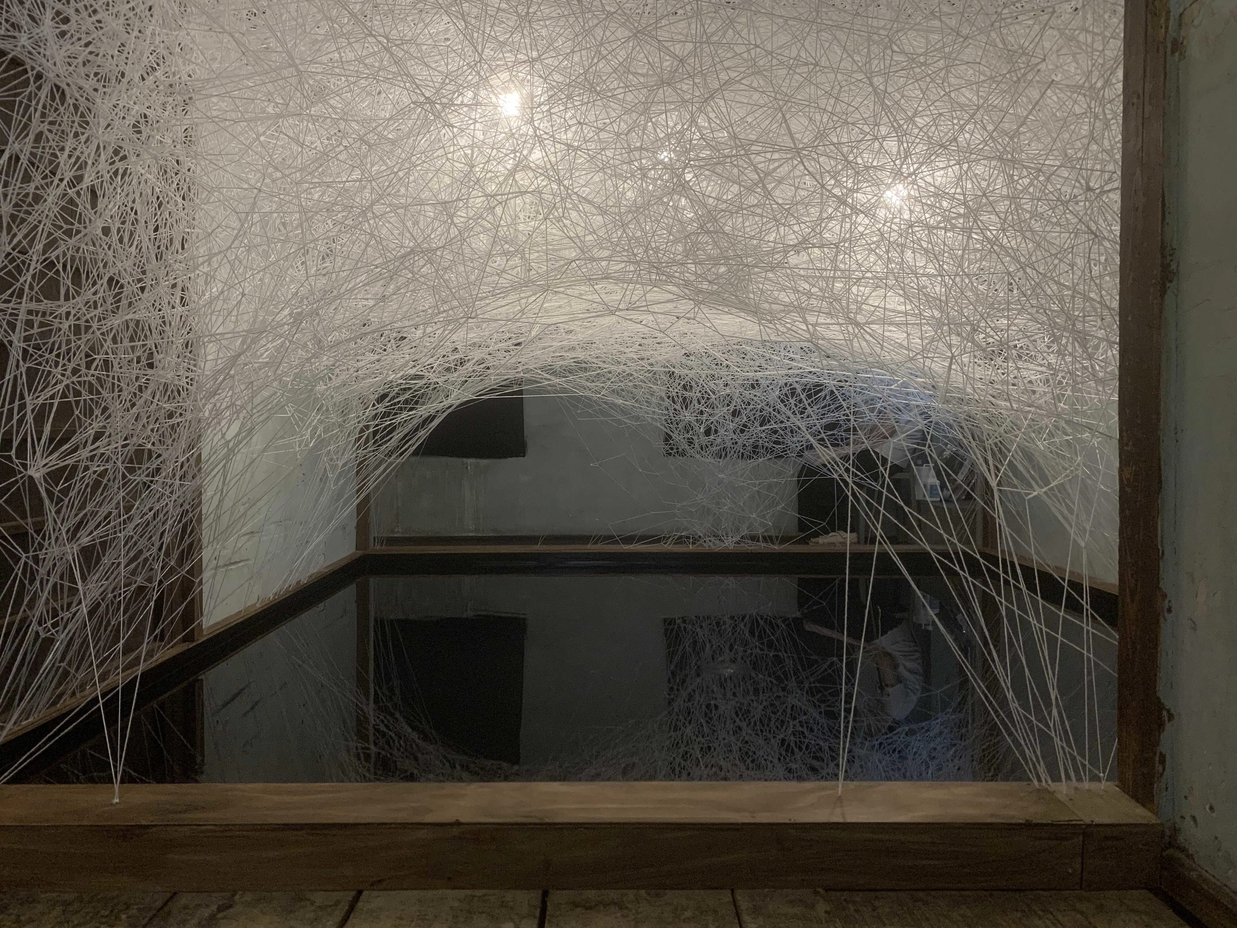 展覧会の構想のために塩田は別府市内の30か所以上を見てまわったというが、最終的に選ばれたこの会場はそのなかでもとくに小さなスペースだったそう。海外巡回が行われるほどの好評を博した森美術館での個展(「塩田千春展:魂がふるえる」、2019)がそうであったように、大規模かつスペクタクルな作風が特徴的に認識されてきた塩田にとって、これは意外な選択かもしれない。