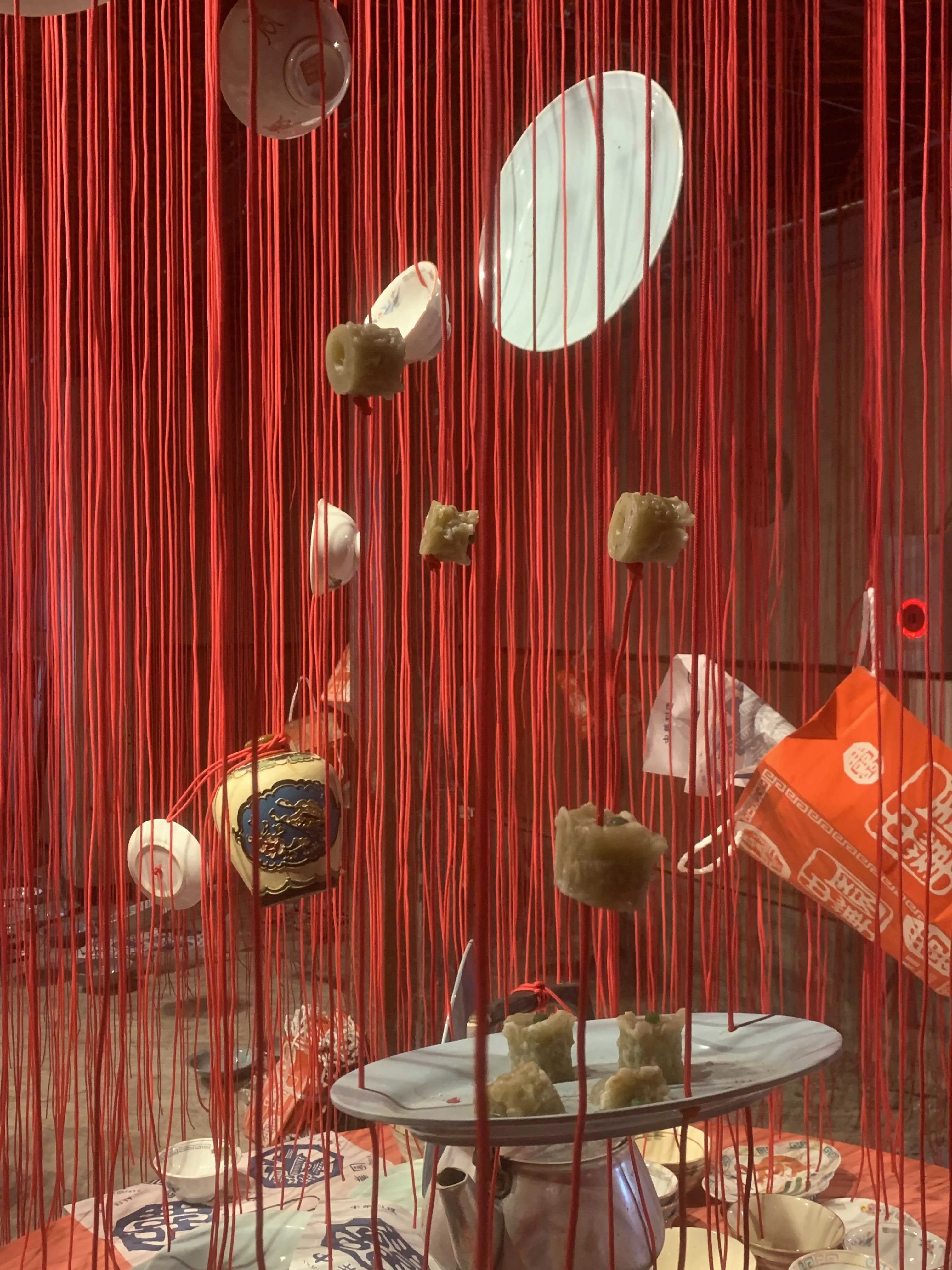 閉店後に残されたままになっていたテーブルや食器を赤い糸で結ぶ方法は、ストレートに「記憶をつなげる」イメージになっているが、不思議と感傷的な気分にならないのは幽霊たちのパーティーのようなスラップスティックさがあるからかもしれない。皿も空を舞うが、シュウマイも空を舞う。