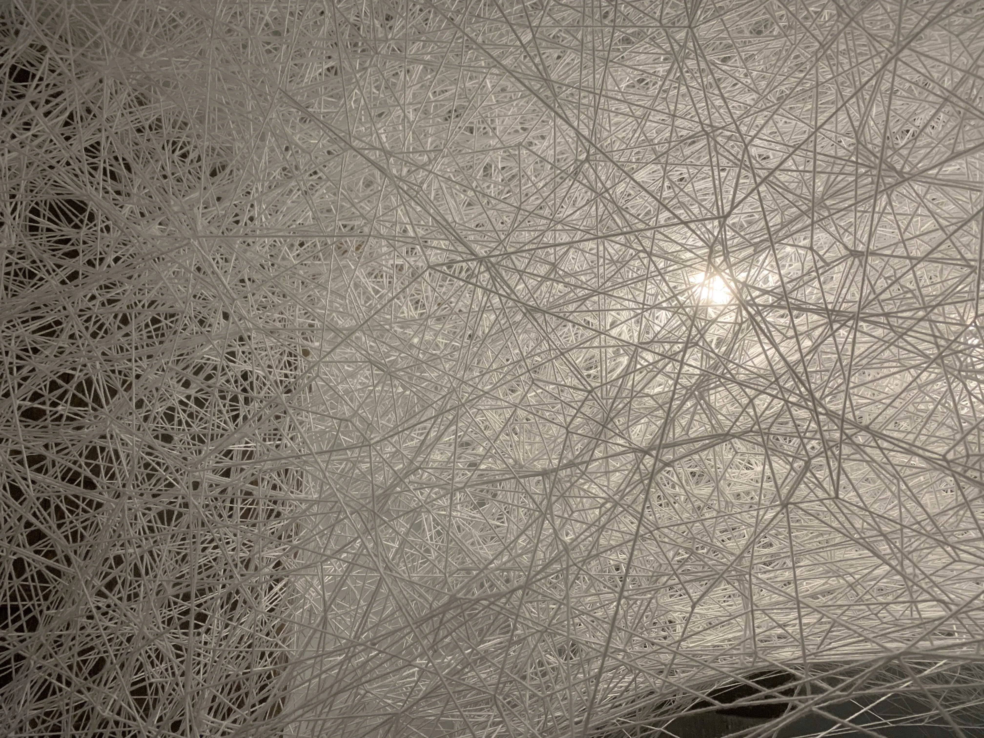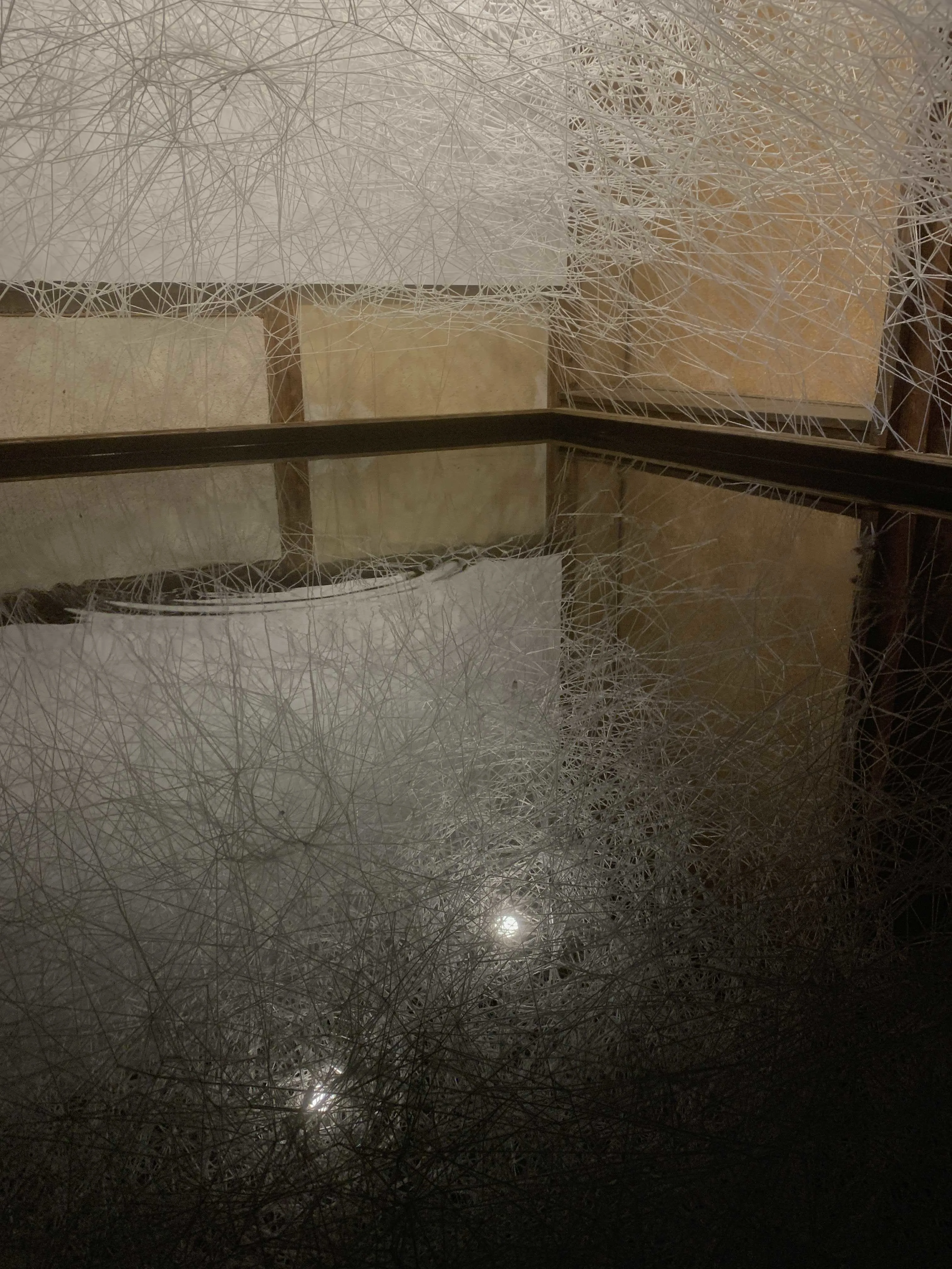 編み込まれた大量の白い糸と滴る水、そしてその下一面に広がる水面で構成された同作は「循環」をテーマとしている。