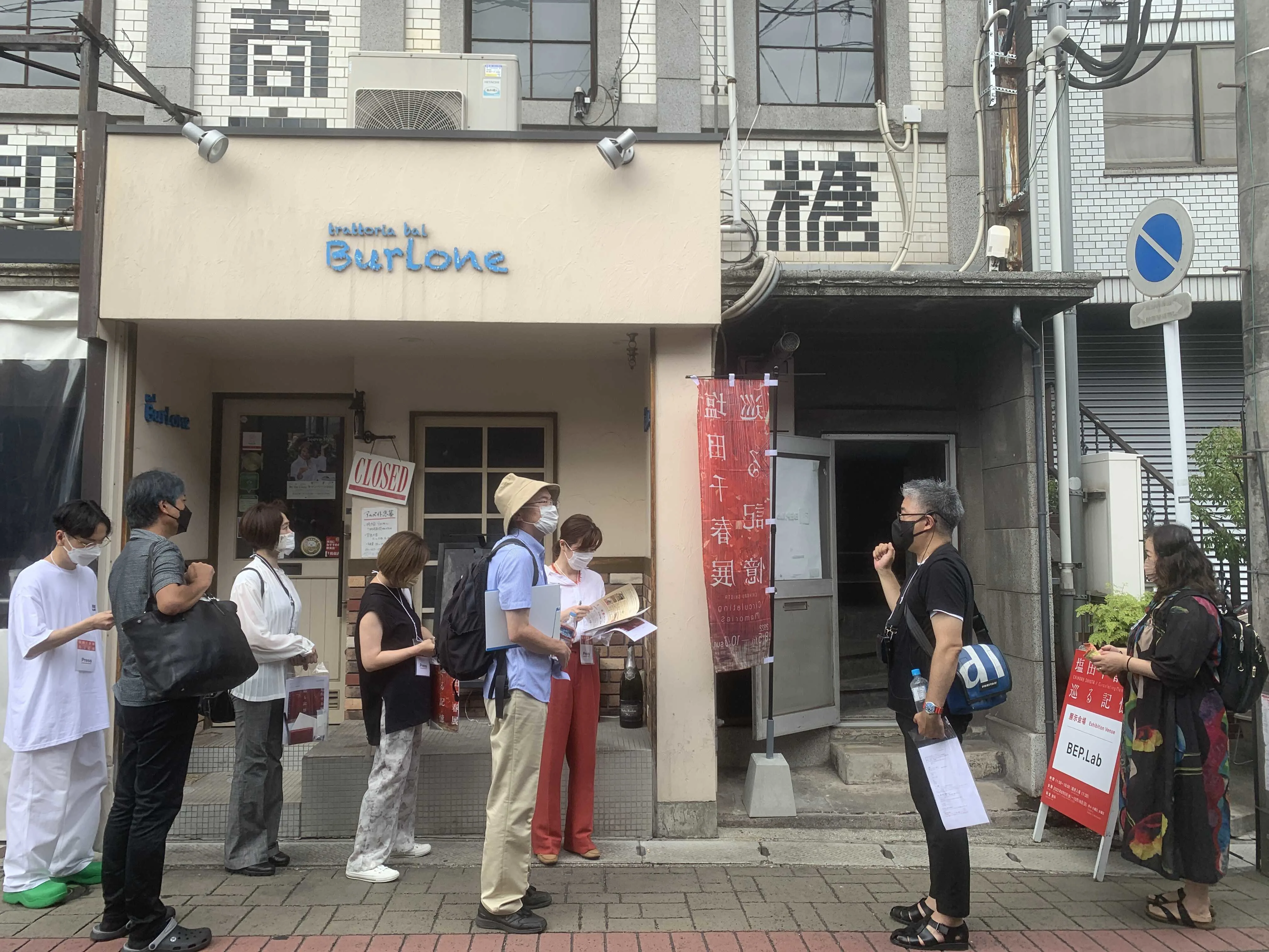 塩田と総合プロデューサーである山出淳也によるガイドつきで行われたプレスツアーでは、まず最初に「BEP.Lab」(別府市北浜)を訪ねた。小麦粉や砂糖などの食品卸業を商う草本商店の旧倉庫などを活用した多目的スペースである同所では、建物の2階・3階を用いたインスタレーション《巡る記憶 - 草本商店》が展示されている。