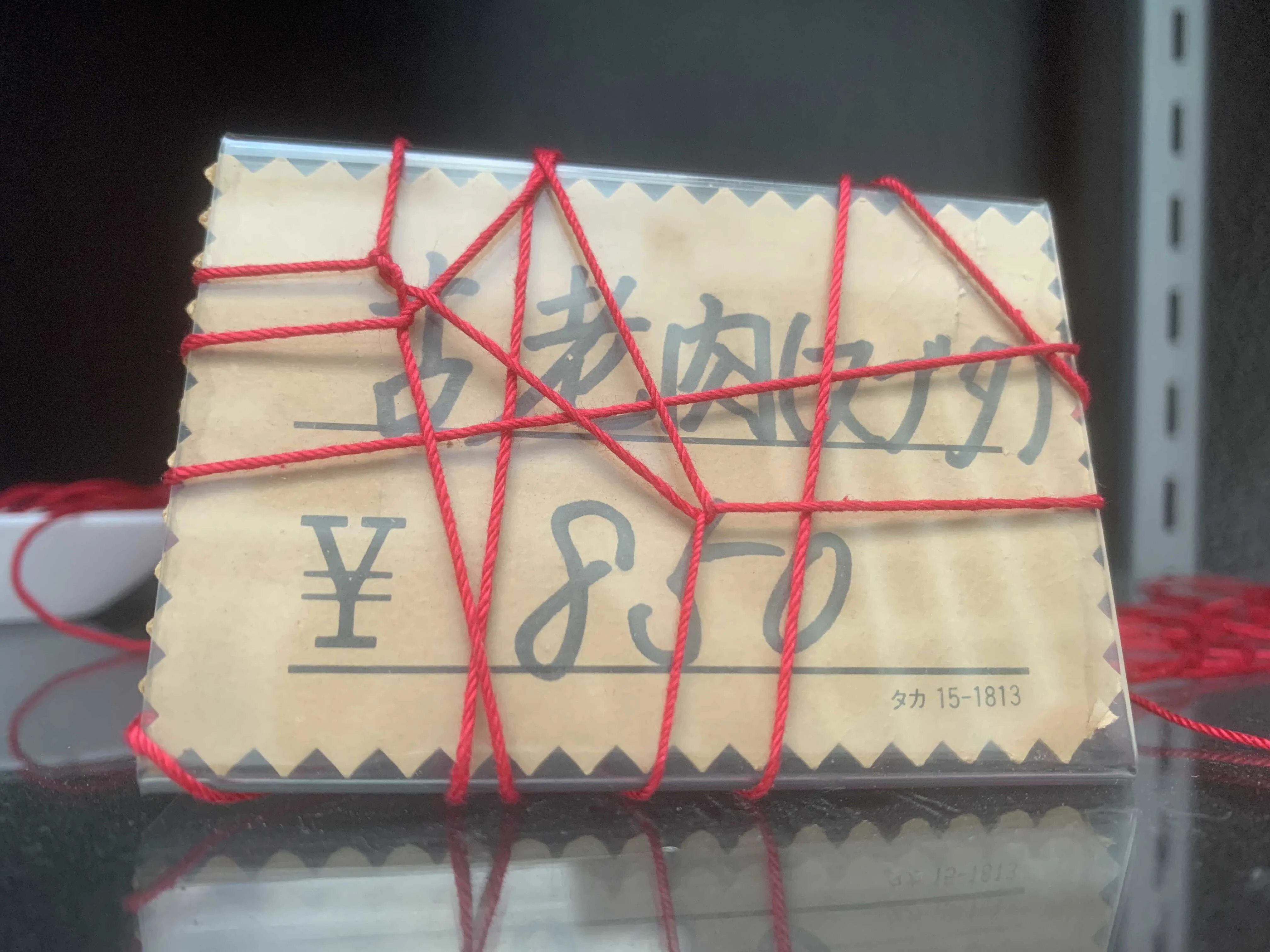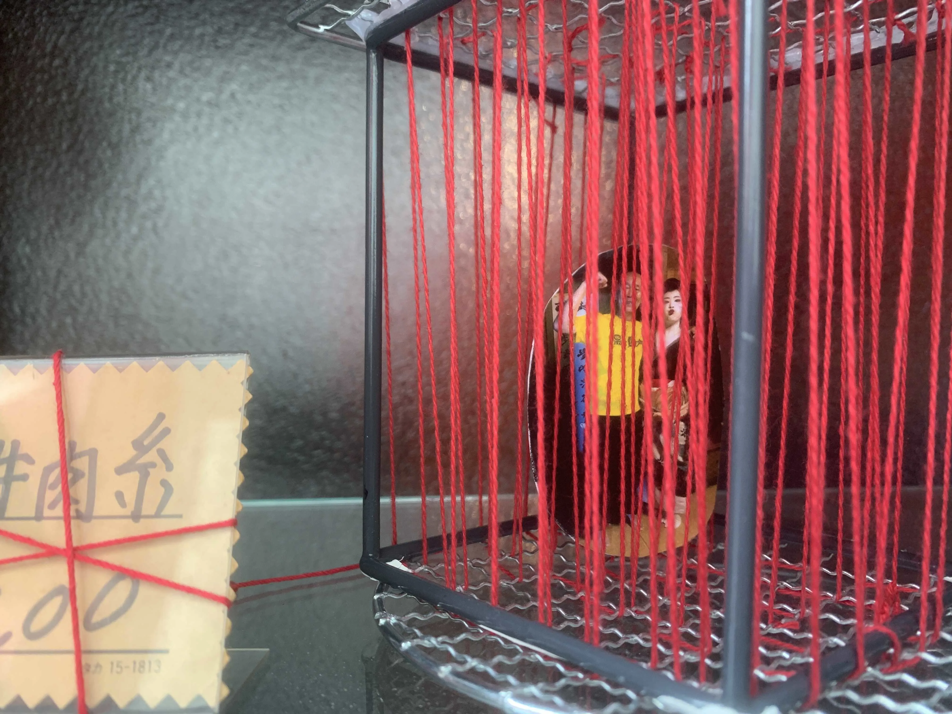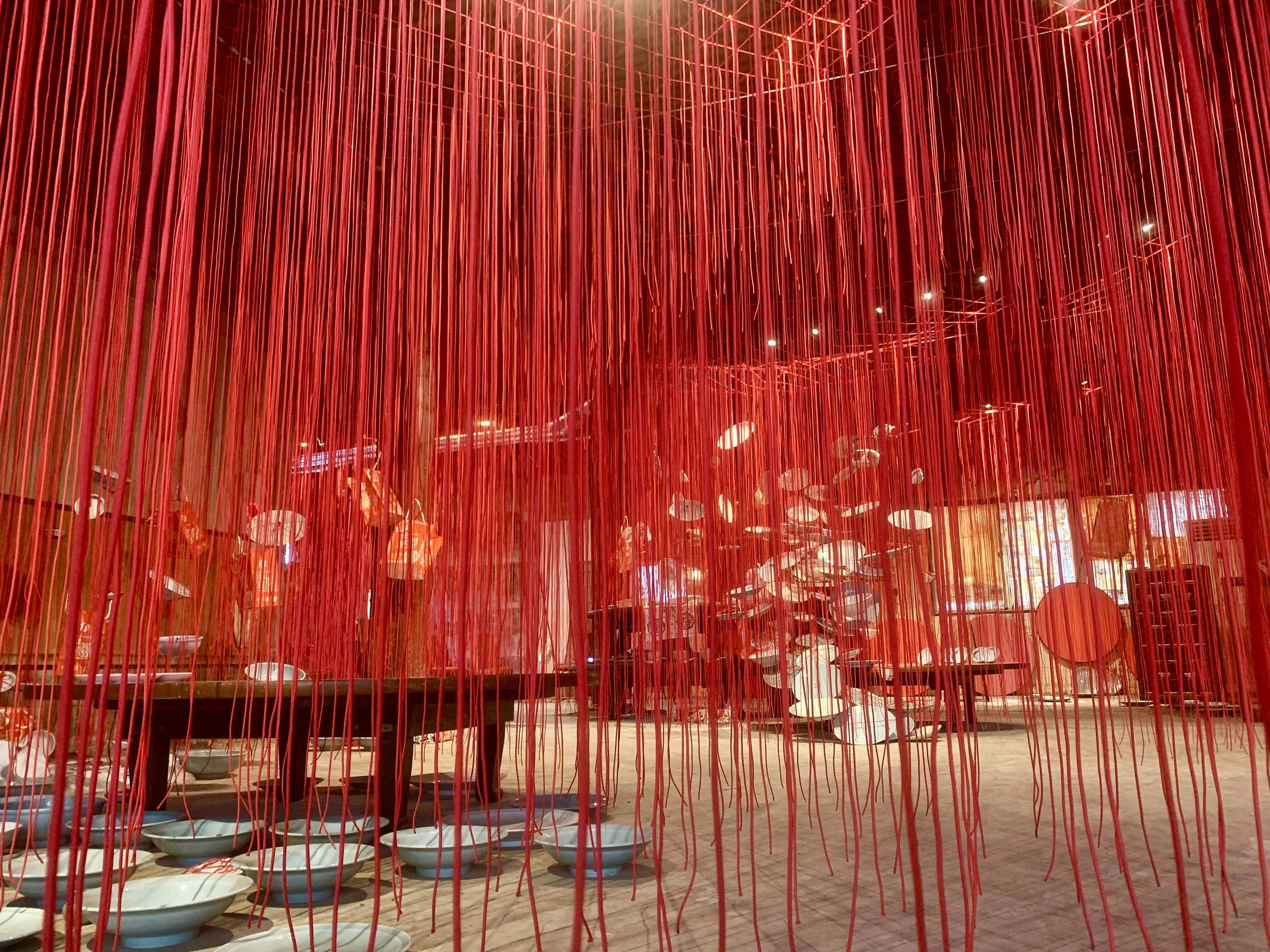 ここで見逃せないのが、店先にあるディスプレイ。お皿やメニューの名札を緊縛(?)するような赤い糸のたたずまいがファニーだが、よくよく見ると塩田千春作品の雰囲気とはちょっと違うものも混ざっている。