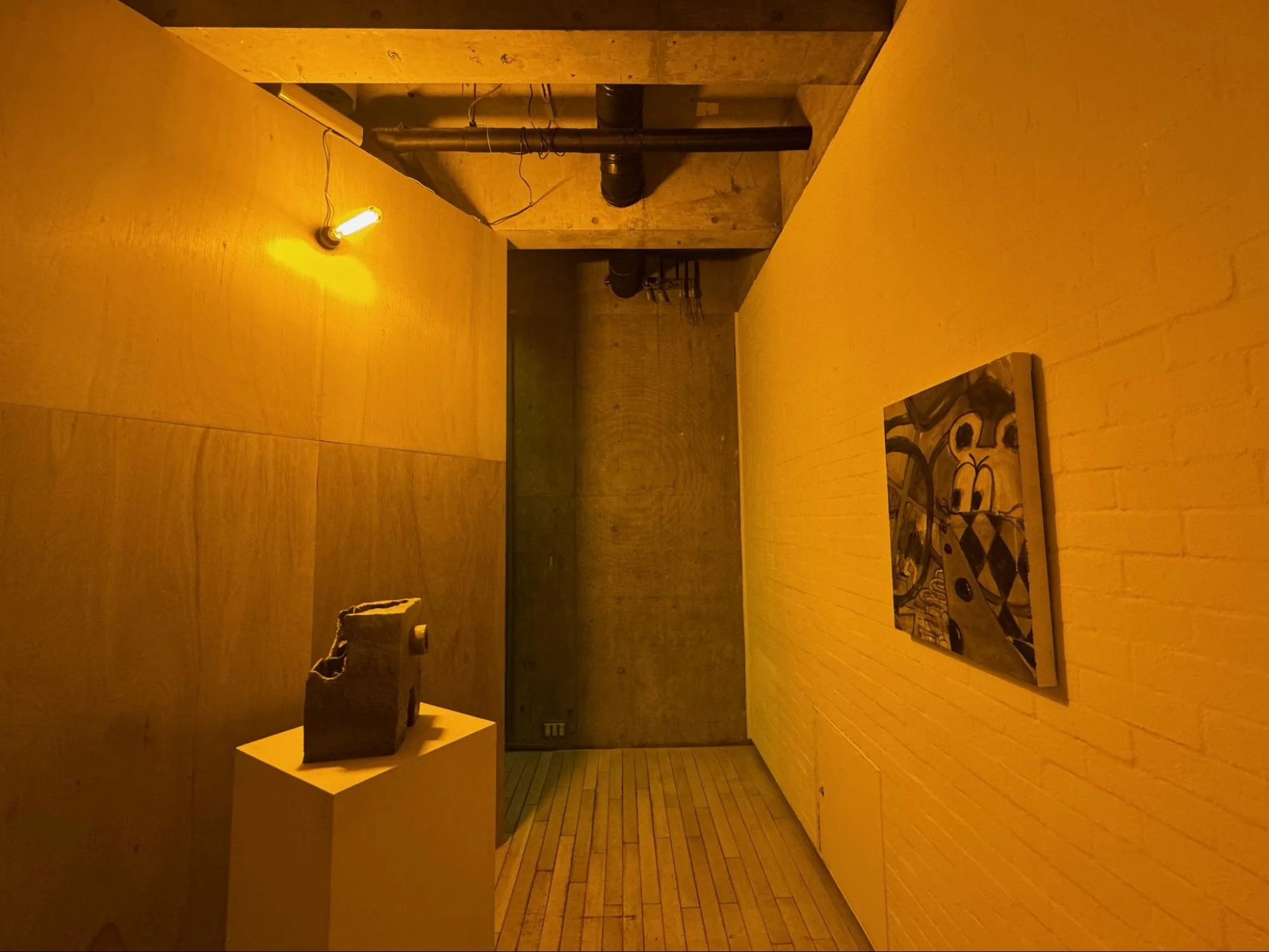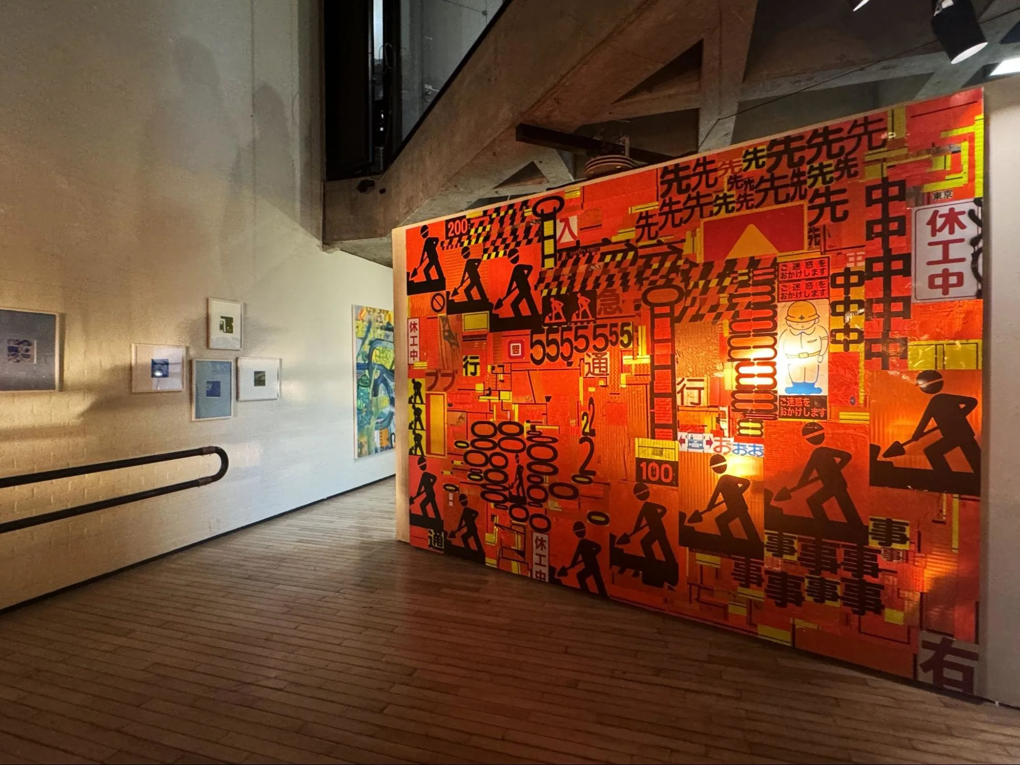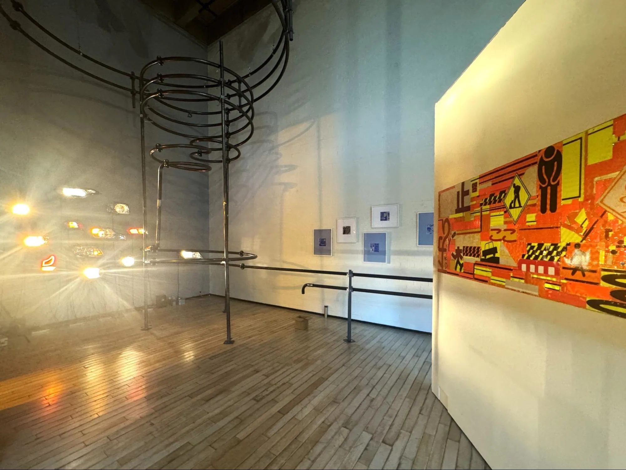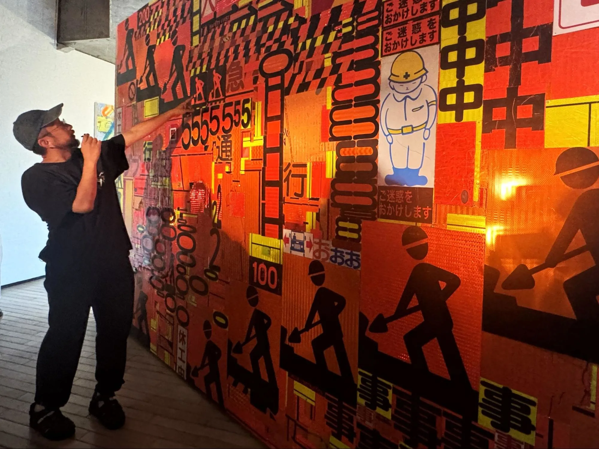空間全体を、LEDに切り替わる以前の車のヘッドライトが眩しく照らす。フロア中央でゆっくりと回転する壁面にコラージュされた、工事現場で見られるピクトグラムの看板がキラキラと反射する様子も、つい目で追ってしまうだろう。