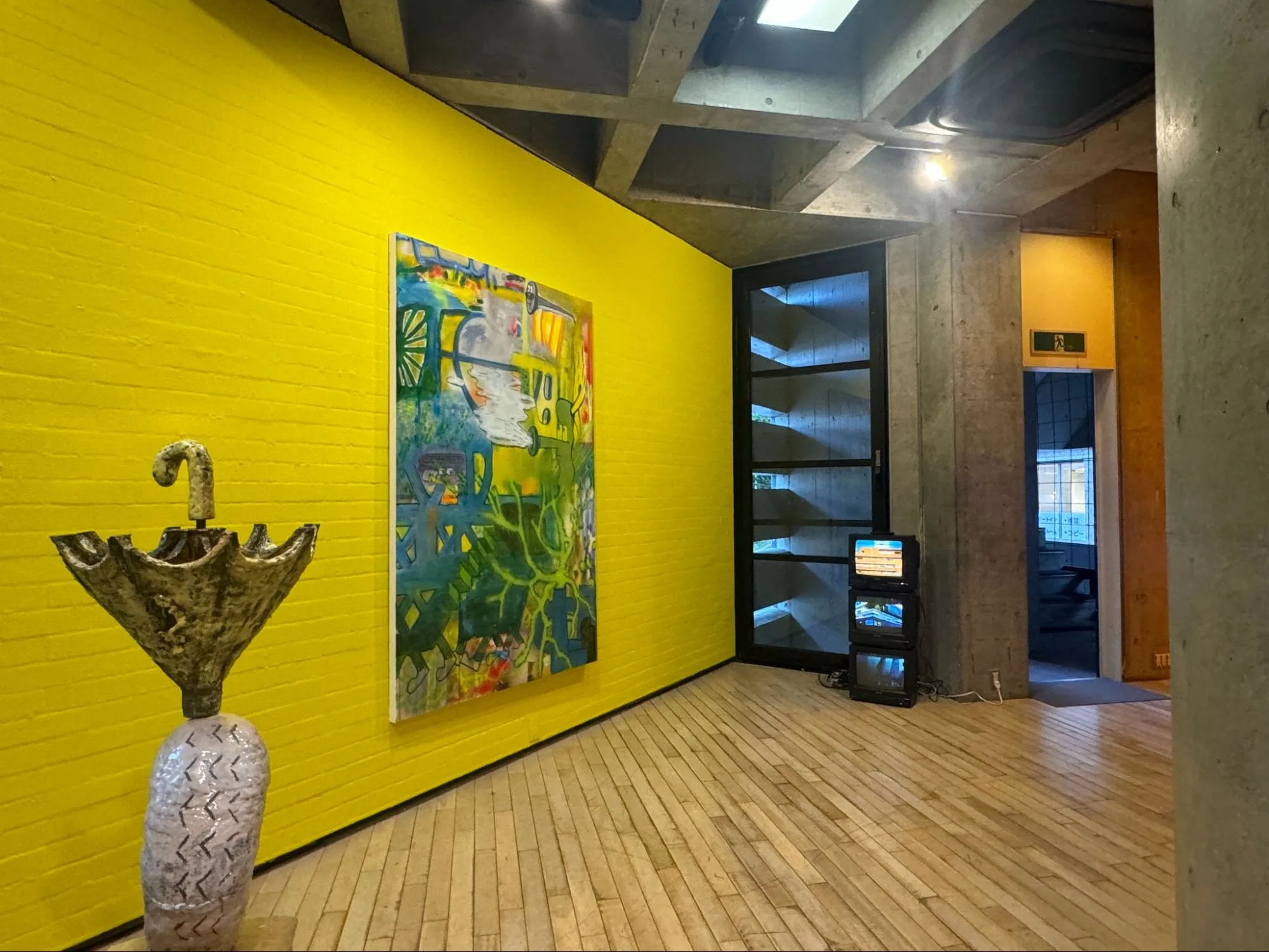 エレベーターを降り、広がる視界の色彩に違和感を感じながら進むと、立体交差する首都高速のように、鉄パイプがぐるぐると広がった吹き抜けの空間が現れる。と、突然、上階からゴロゴロと音がして、パイプの中を何かが転がり落ちてきた。