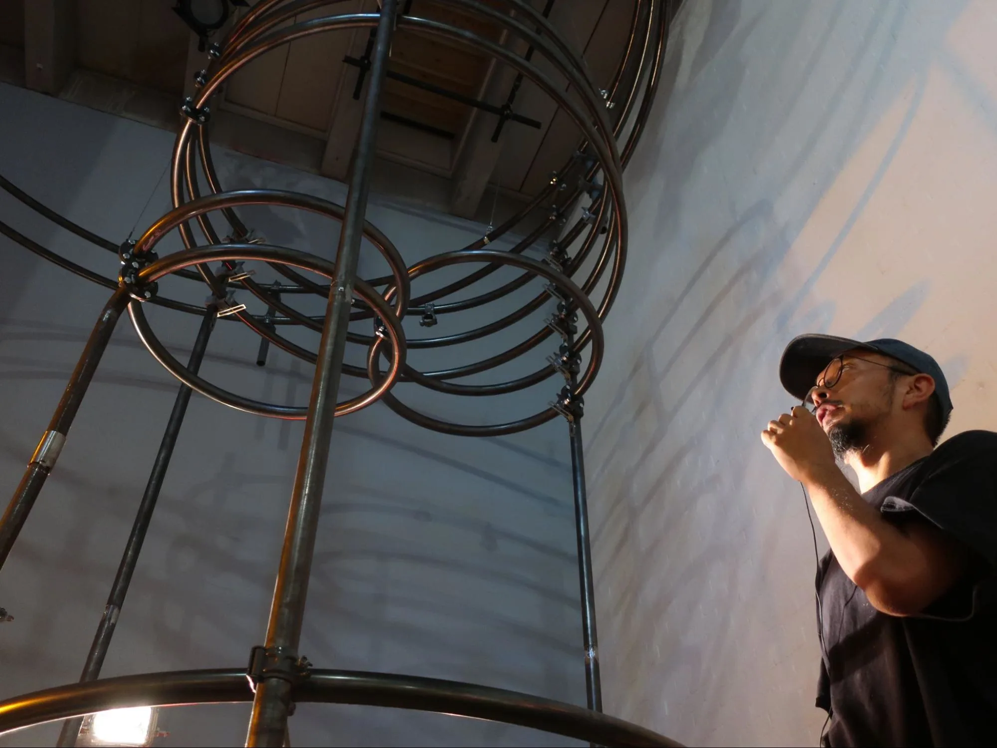 《コンピューターとブルドーザーの為の時間》は、反響して話し声を遮るほどの音量に、つい、音の出どころを目で追ってしまう音響彫刻作品。都市の中で当たり前に存在している電柱やマンホールの中、橋なども、実は音を発している。意識しないと聞こえない、都市インフラが発する音がテーマだ。