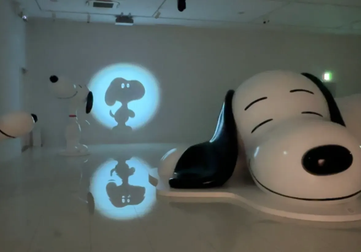 同じく常設展として新設された「スヌーピー・ルーム」は、ミュージアムの代名詞と言える空間に。リラックスして横たわる全長8mのスヌーピーをはじめ様々なポーズを取るスヌーピーたちが人々を迎え、暗転した室内で映像、光、音楽による演出が楽しめる2分間のショー演出は、思わず顔がほころぶプレイフルな世界観を作り出している。