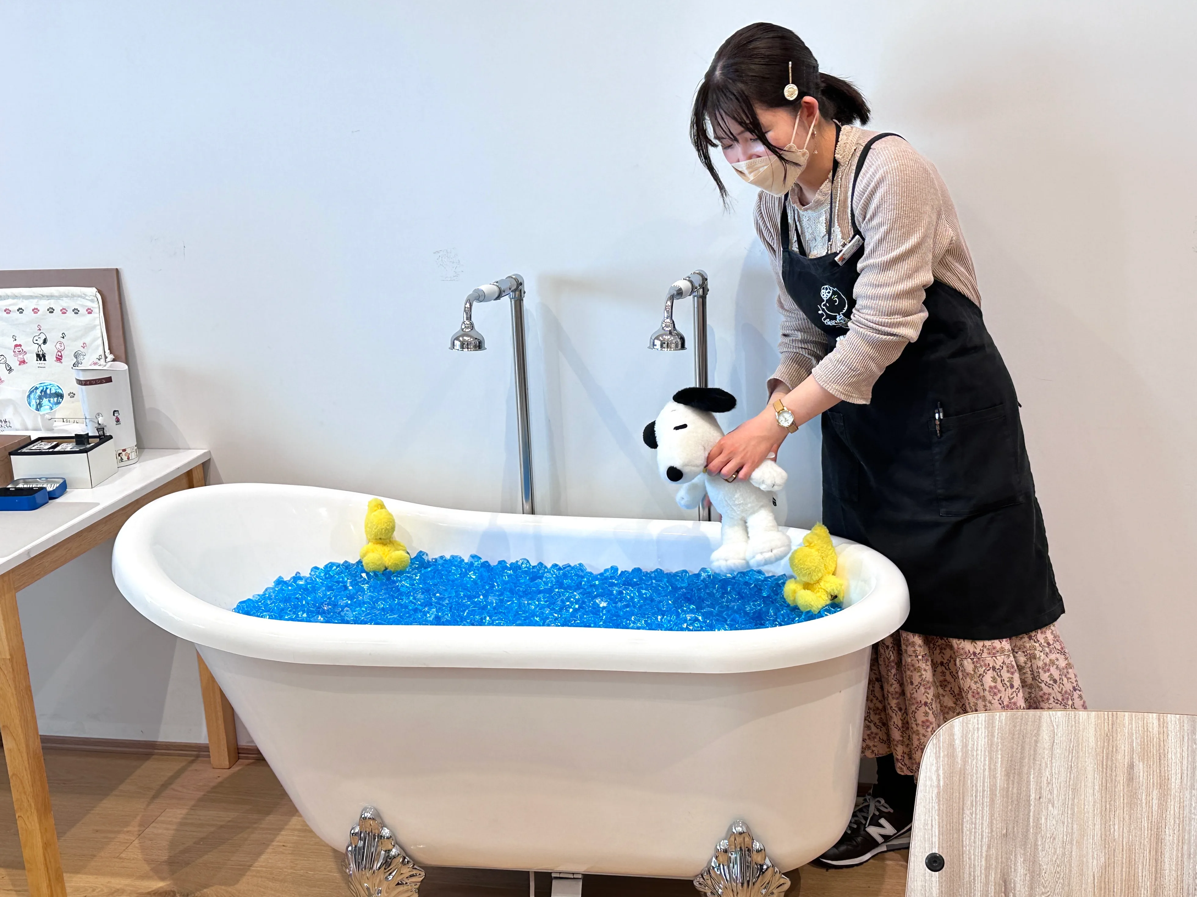 毎月体験チケットが即完売するという大人気の「ぬいぐるみワークショップ」は、今回のリニューアル以降も引き続き開催。ワークショップではボディ(本体)にペレット(詰め物)や好みの量の綿を入れ、Tシャツや首輪のカラーも選べるオリジナルのスヌーピーを作ることができる。