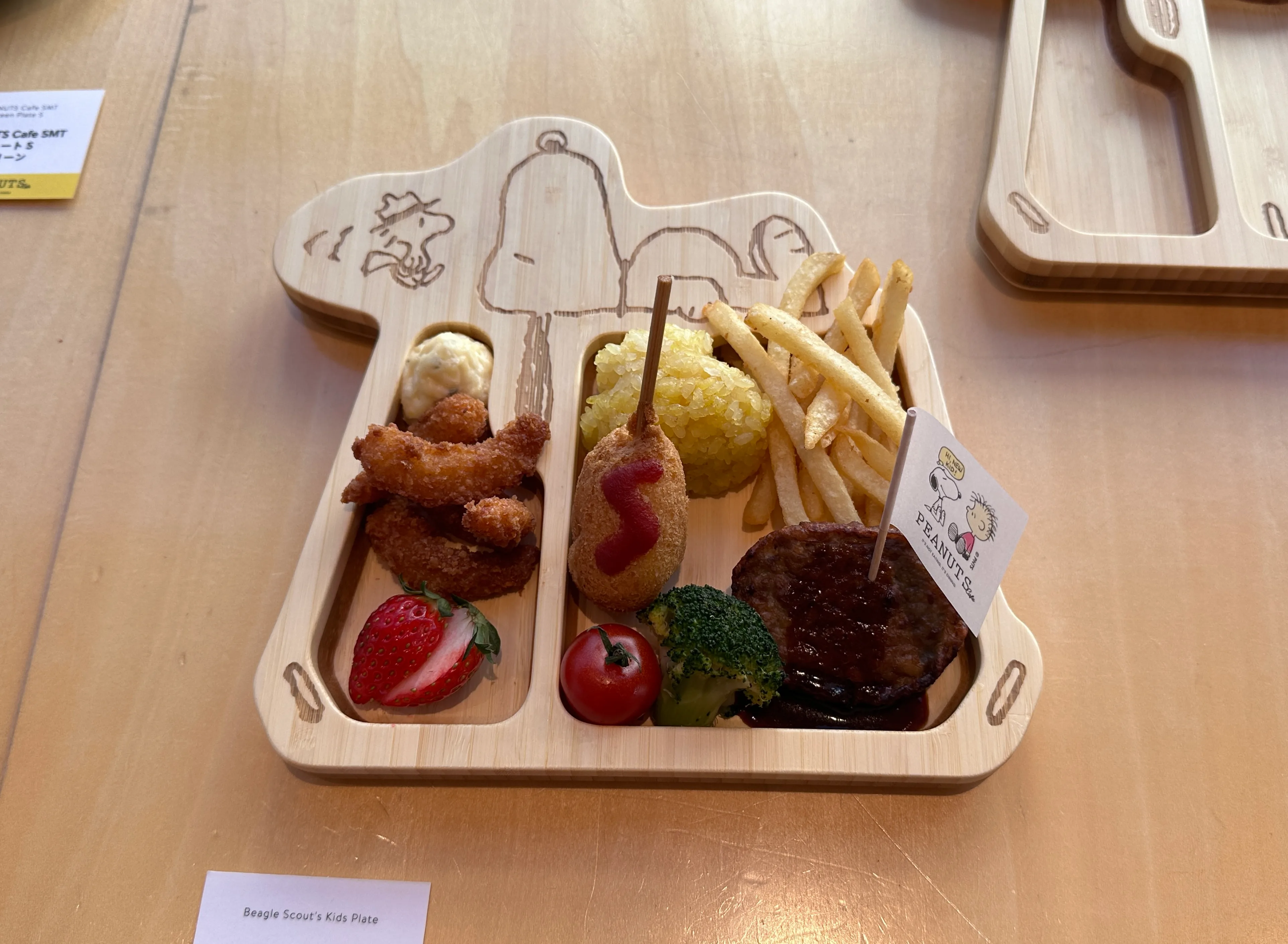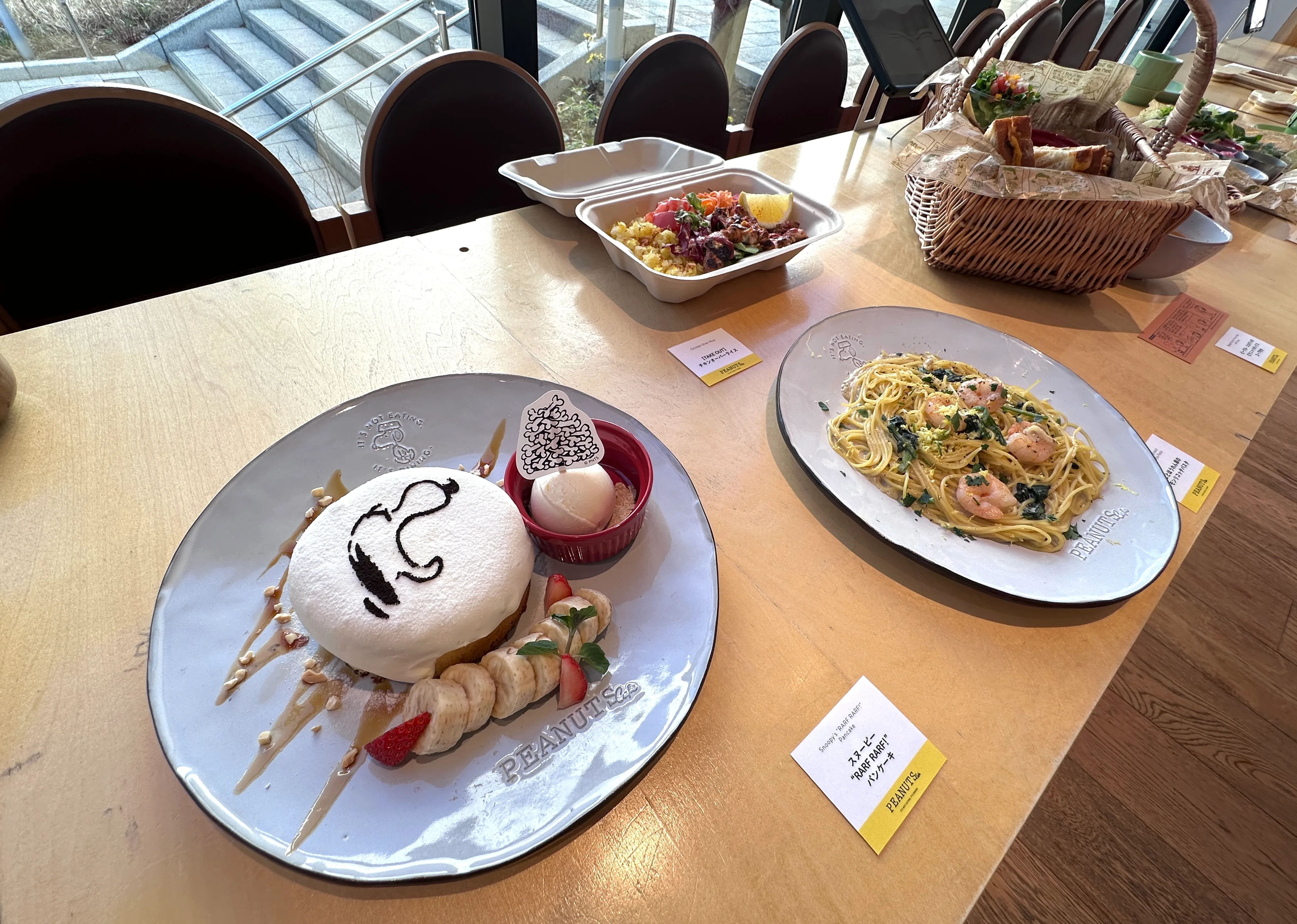 スヌーピーミュージアムに隣接する「PEANUTS Cafe」では、スヌーピーのイラストがデザインされたデザートメニューやキッズプレート、原作者のシュルツが好んだツナサンドをイメージしたピクニックボックスなど、見て楽しい食べておいしいメニューが並ぶ。