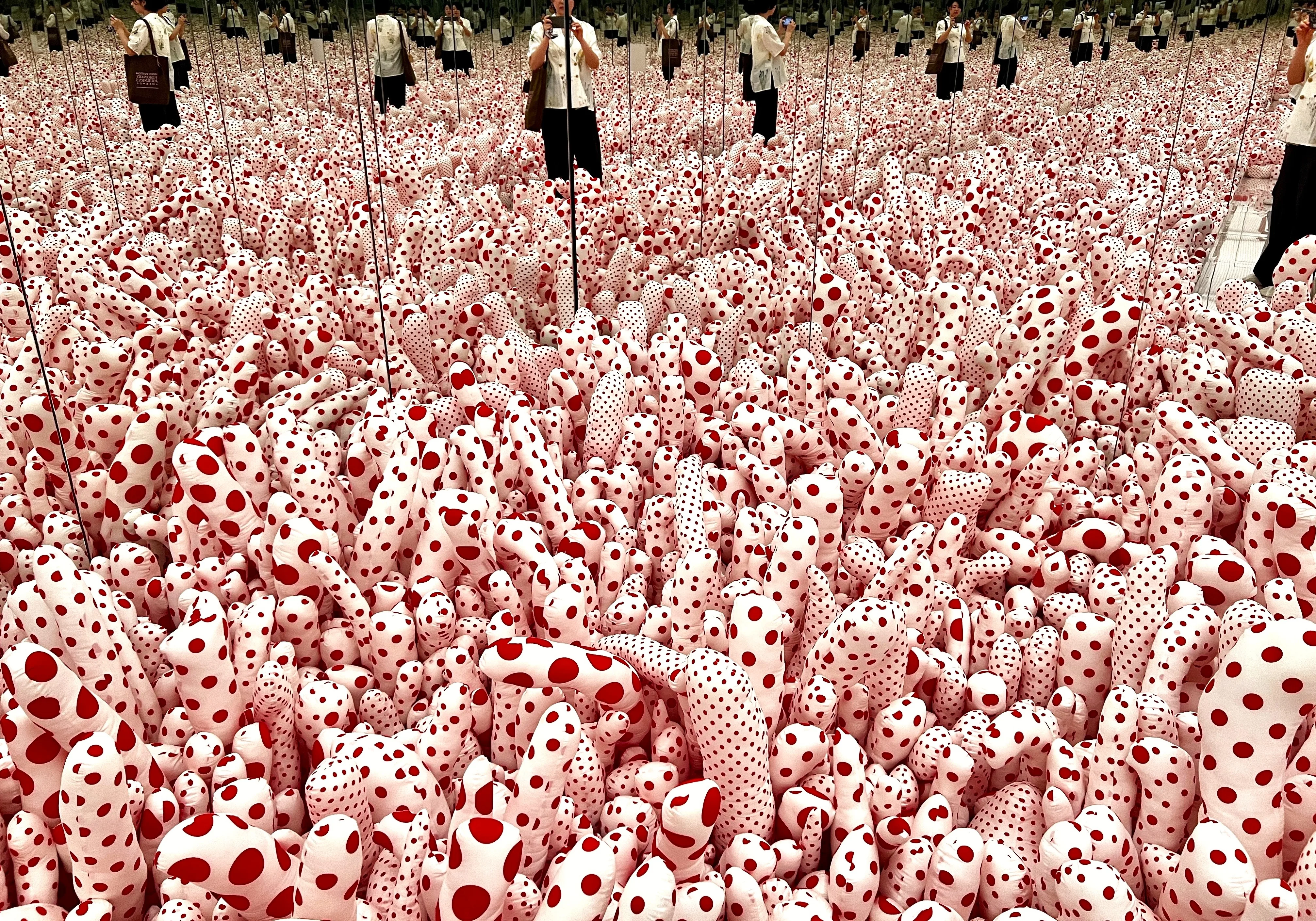 草間が鏡を用いたインスタレーションを初めて制作したのは「インスタ映え」という言葉が生まれる遥か昔、1965年の「フロアー・ショー」である。当時の記録写真では、鏡で反復するソフトスカルプチュアに囲まれながら全身赤いタイツで仁王立ちする草間の姿が収められている(興味のある方は《無限の鏡の部屋―ファルスの原野》で検索すると画像を確認できる)。この演出された写真は、草間の「自己消滅」を効果的に表現するセルフ・プロモーション的な方法であるが、なにより興味深いのはこんにちセルフィーを撮って草間作品を楽しむ鑑賞者たちの写真にもヴィジュアル的に似通っている点である。カメラという目を通じて得た自己像によって作品に備わった「自己消滅」の力が増幅し、人間の目を通して鑑賞するのとはまた別の体験をもたらしているという意味では、撮影を通じた鑑賞方法が、決して浅いと一蹴できるものではないことが理解できよう。無論、作品のメディウムにもよるだろうが、ことインスタレーションに関しては、「自分がそこにいた」という写真による記録が鑑賞で重要な役割を担う場合も多い。草間のケースは、写真を撮ることが芸術鑑賞から遠ざかるのではなく、むしろ作品理解に結びつく可能性を持つという好例だろう。