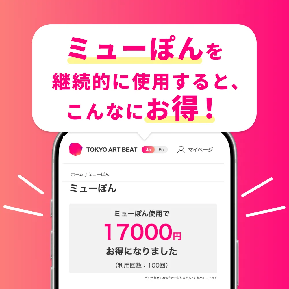 「オンラインミューぽん」は、現在、「SORAYAMA 光・透明・反射 -TOKYO-」展のほか、「テート美術館 ― YBA & BEYOND 世界を変えた90s英国アート」展で使用可能。なお、窓口で割引できる「ミューぽん」の3〜4月に対象となるすべての展覧会を鑑賞するだけで、有料会員の年会費(2500円)に相当する金額を上回ります(ラインアップはこちらから)。会期中に複数の展覧会を巡る人ほど、その差は歴然。ちなみに、2025年の「ミューぽん」による割引総額は17000円でした。