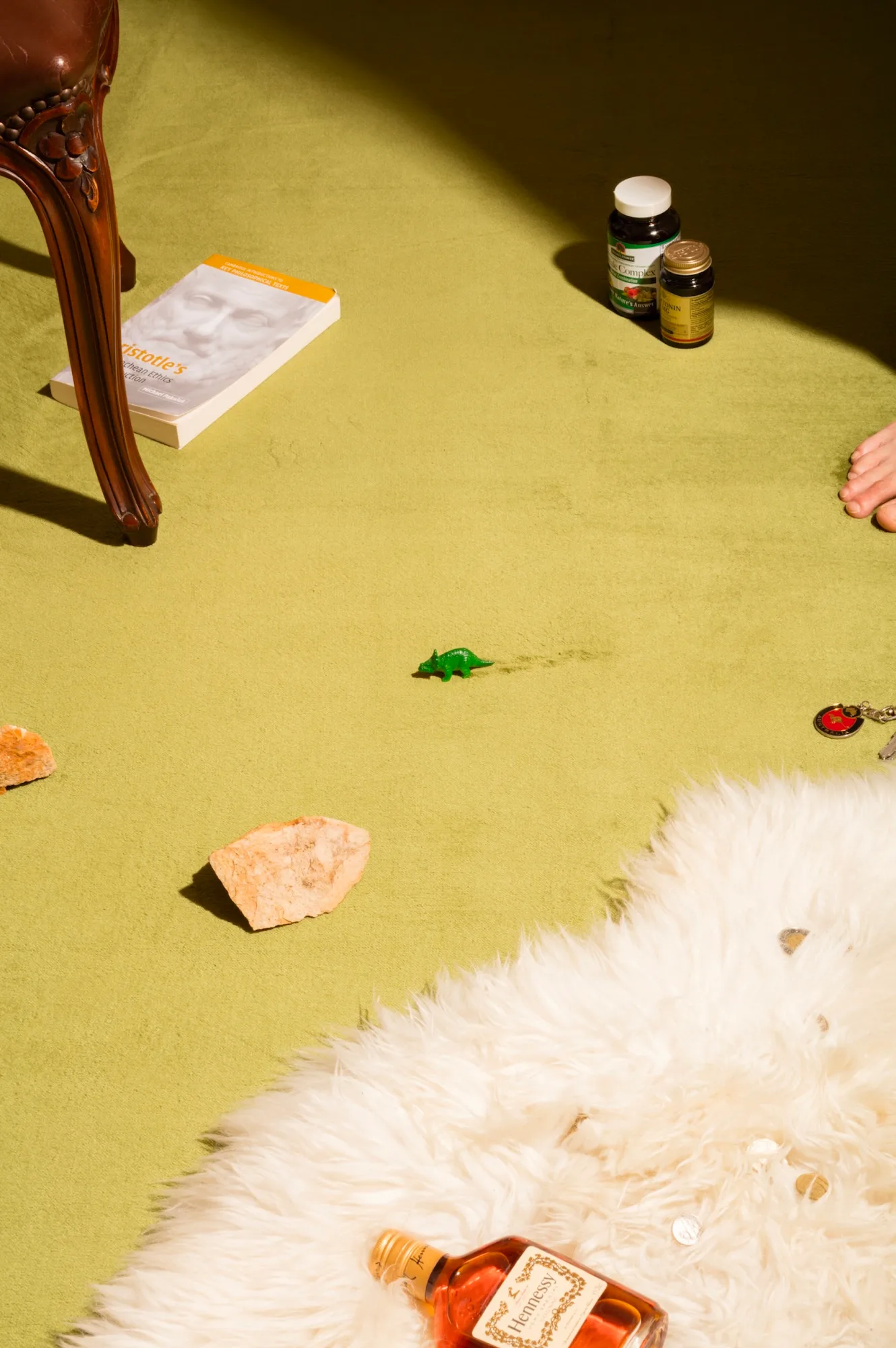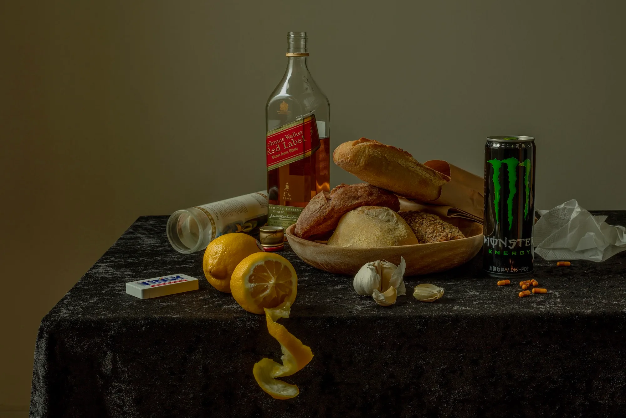 2024年にSystem of Cultureが出版した、これまでの作品を網羅的にまとめた作品集『Book 2』を開いてみよう。最初に掲載されている《Still Life Breakfast》は代表作といってもいいものだが、伝統的な西洋絵画の静物主題のような構成を取りつつも、サプリメントと思しき錠剤やエナジードリンクが配置されている。奥にはふたの開いたウィスキーのボトルがあり、わたしたちはその伝統的絵画構成への挑戦とともに、そこから物語を掬い上げてしまう。ページをめくっていくと、ほかにもこのようなデペイズマンともいえる手法をとった作品は多く見られるし、あるいは空に浮かぶ炎や、人間の身体を静物モチーフと同様にほとんどモノのように配した作品もしばしば見られる。ただ、それは物語を鑑賞者の解釈に任せるというよりは、明確な物語の提示がなされている観がある。