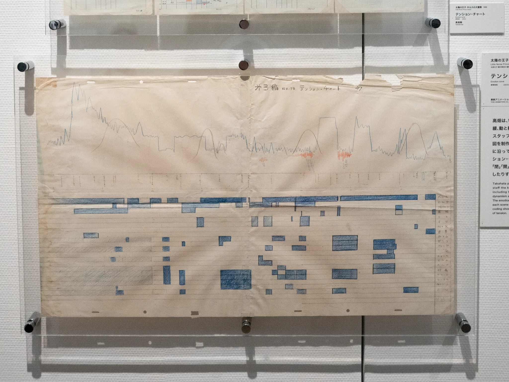 さらに、高畑が制作した「テンション・チャート」や色分けされた感情起伏の図表も展示されており、物語の構築に対する緻密なアプローチを知ることができる。当初予算を大幅に超える制作費と3年半という歳月をかけた本作は、まさに高畑勲という表現者の原点が詰まった記念碑的作品なのだ。