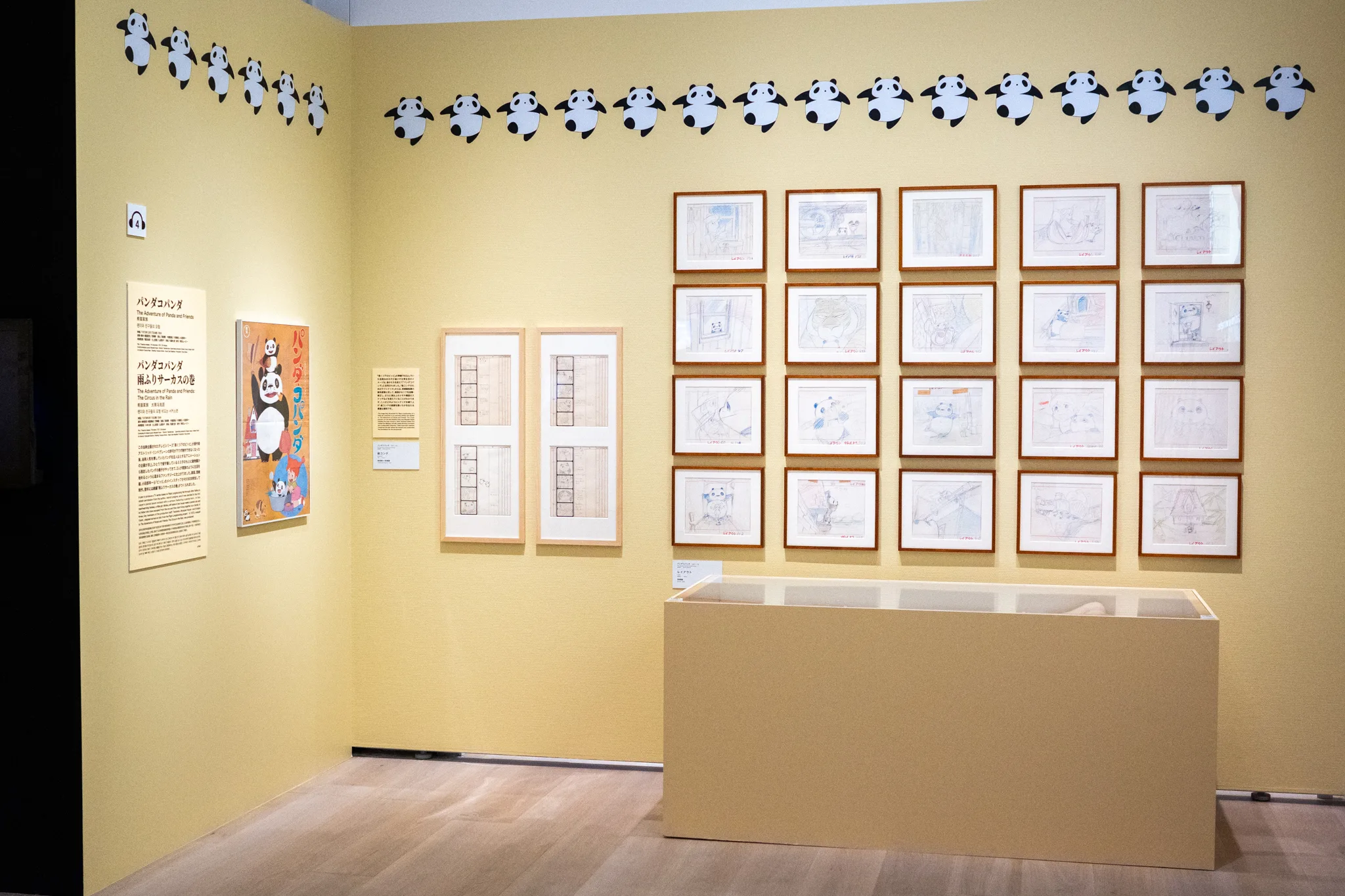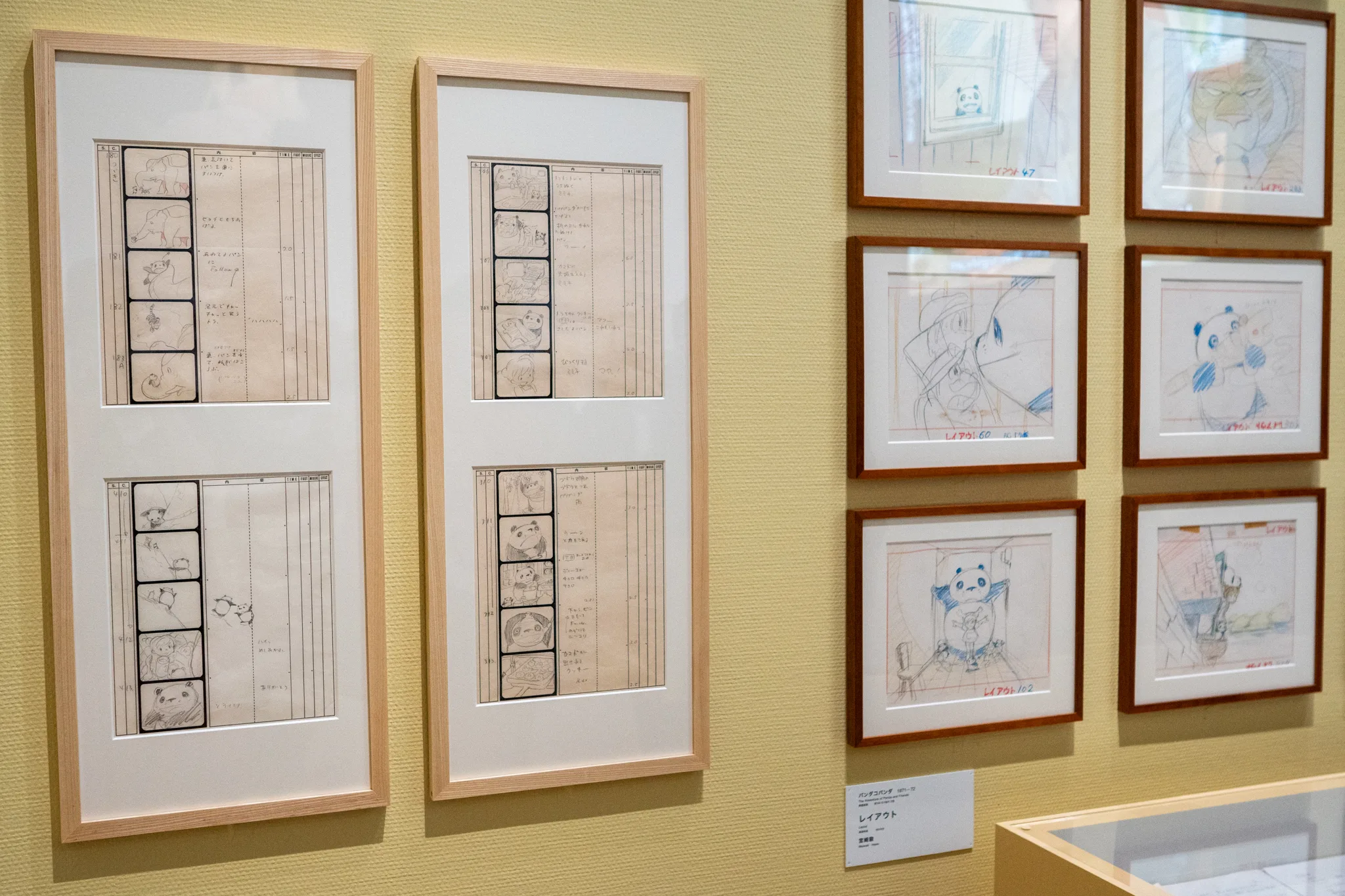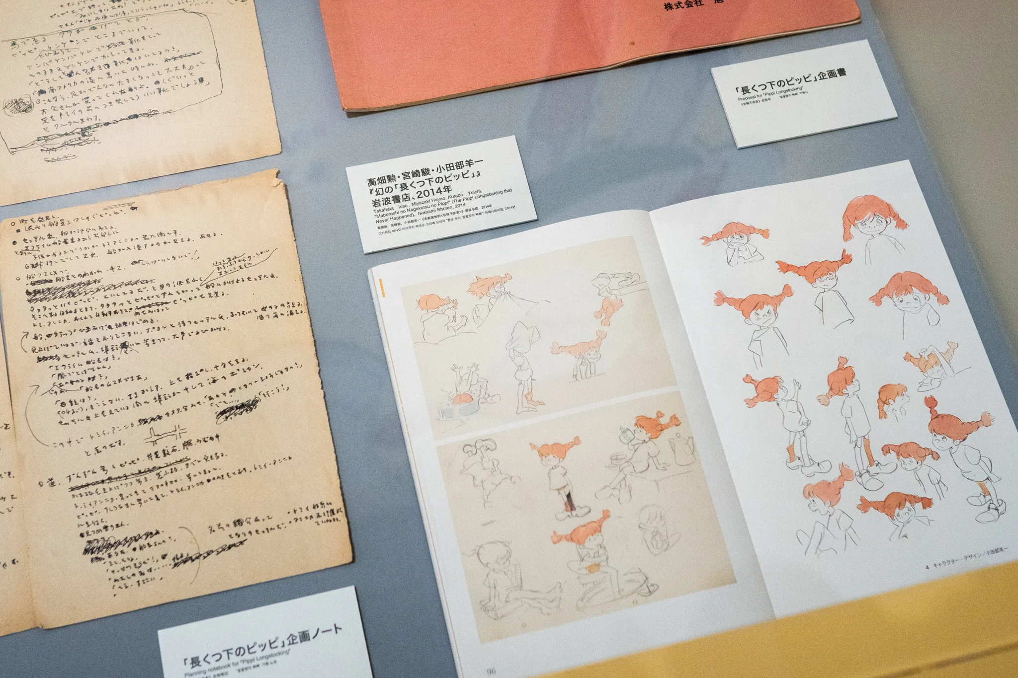 いっぽう『パンダコパンダ』(1972)では、原作者の許可が下りず制作中止となった幻の企画『長くつ下のピッピ』で準備していた活発な女の子のイメージが活用された。展示では「絵コンテのためのラフシナリオ」が公開されており、宮﨑駿執筆の脚本原案に対して高畑がセリフを加筆・修正し、演出上のメモや構図のスケッチを添えた過程を見ることだできる。ふたりがどのようにシナリオを練り上げ、絵コンテの基礎を築いたかを伝える貴重な資料である。