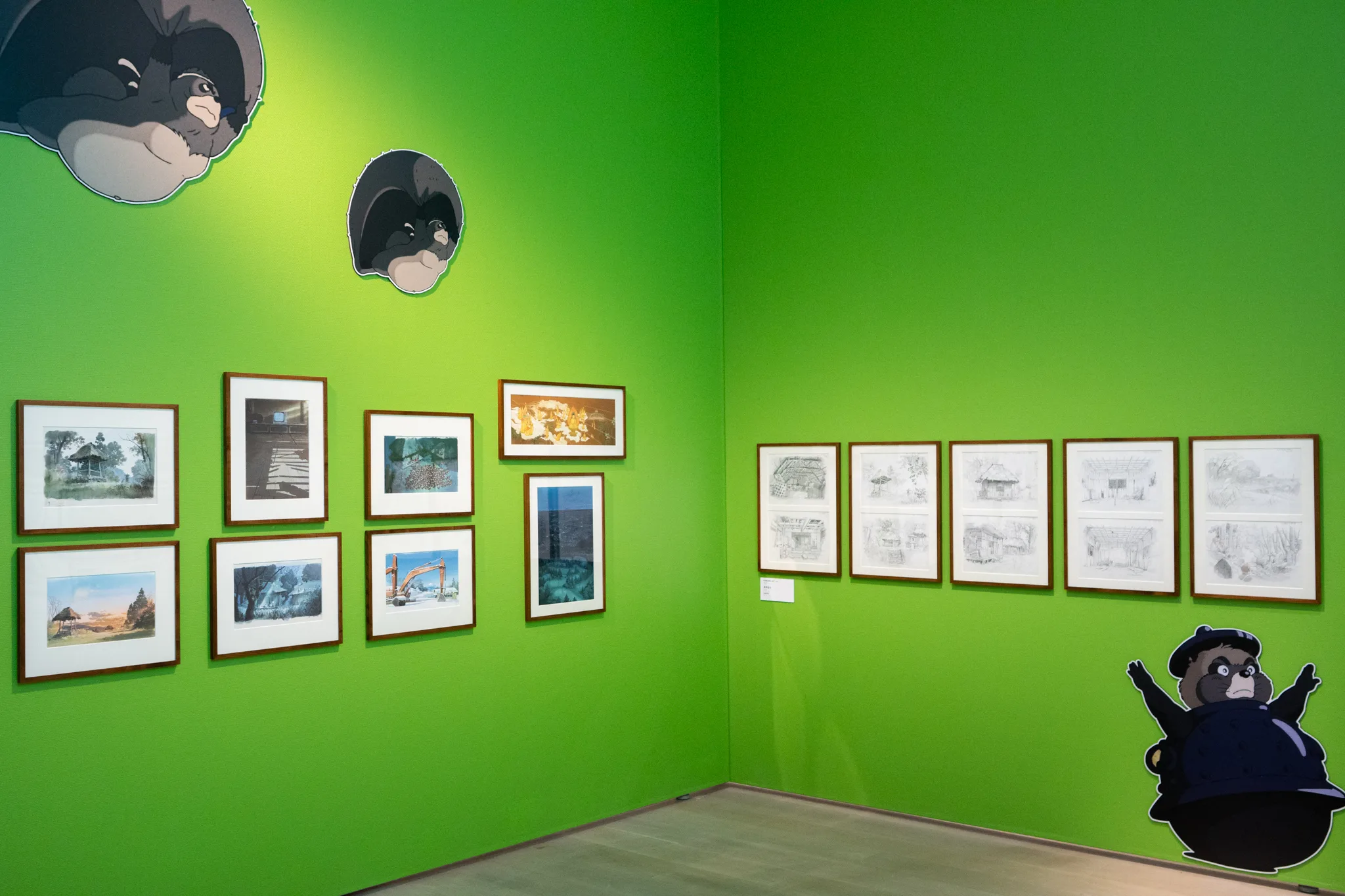 シナリオ作りと並行して、百瀬義行と大塚伸治による大量のイメージボードも描かれた。展示ではタヌキの生態や化ける方法に関するユーモラスなアイディアの数々を楽しむことができる。