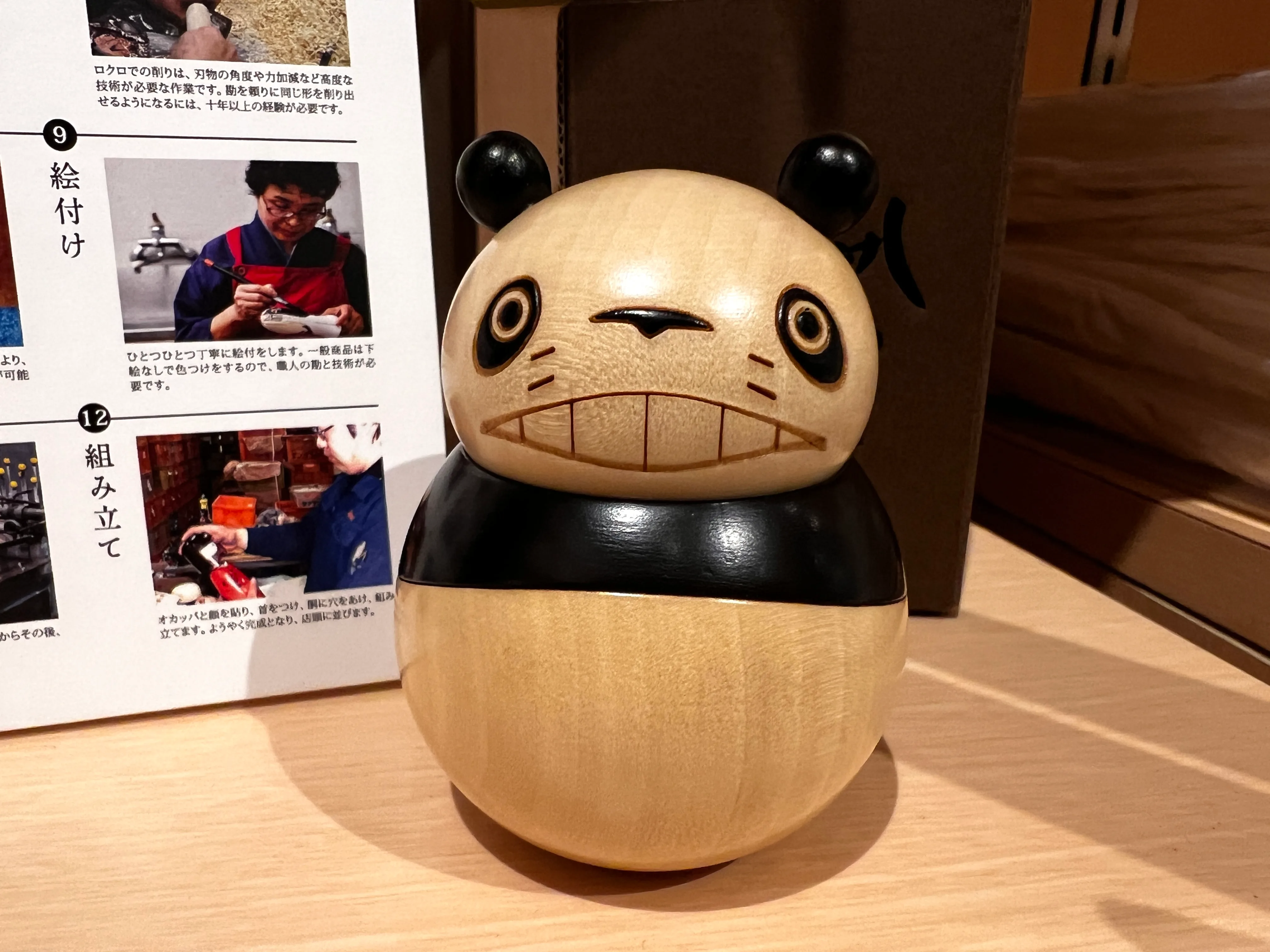 『パンダコパンダ』のパパンダをモチーフにした木製こけし。職人の手作業によって一つひとつ仕上げられており、独特の笑顔が印象的。部屋に飾るだけで、懐かしさとあたたかさが広がる。税込5500円。