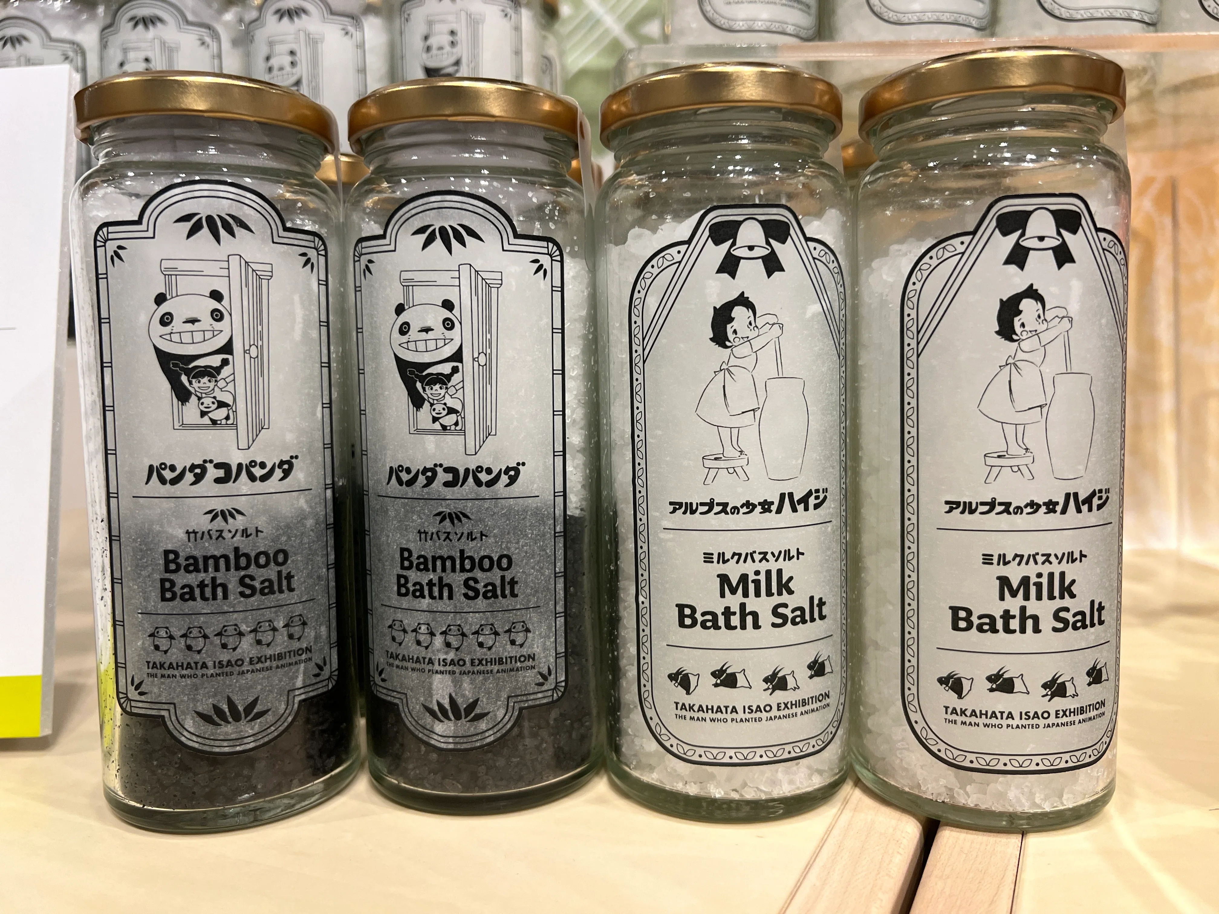 『パンダコパンダ』と『アルプスの少女ハイジ』のキャラクターが描かれたバスソルト。竹の香りの「バンブーバスソルト」と、ミルクの香りの「ミルクバスソルト」の2種類。パッケージも可愛らしく、使い終わった瓶は小物入れにも。税込2420円。