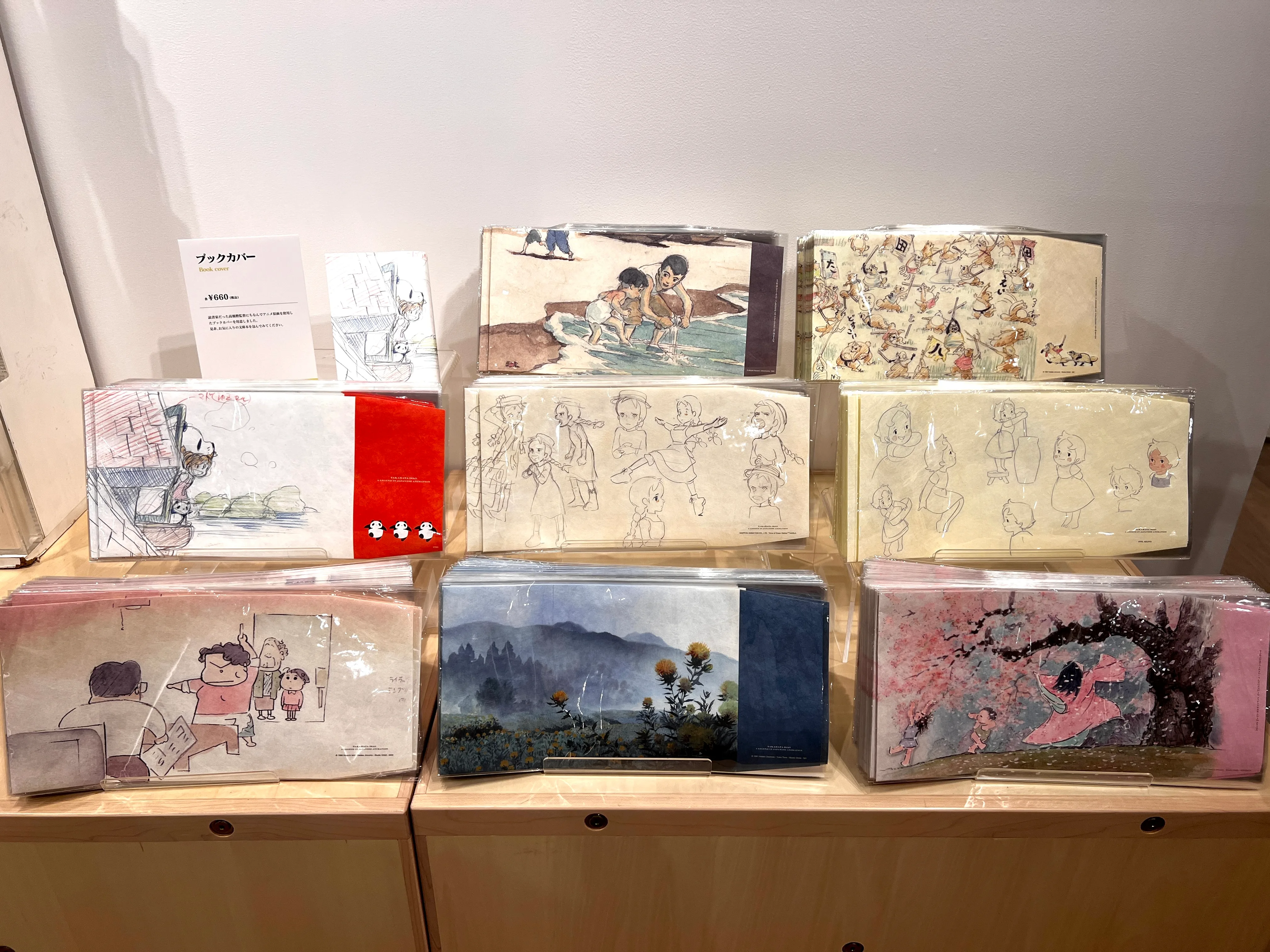 高畑作品のスケッチや背景画をプリントしたブックカバー。『火垂るの墓』『おもひでぽろぽろ』『平成狸合戦ぽんぽこ』など、10種類以上のデザインから選べる。読書好きだった高畑監督にちなんだ、ファンにはたまらない逸品。税込660円。