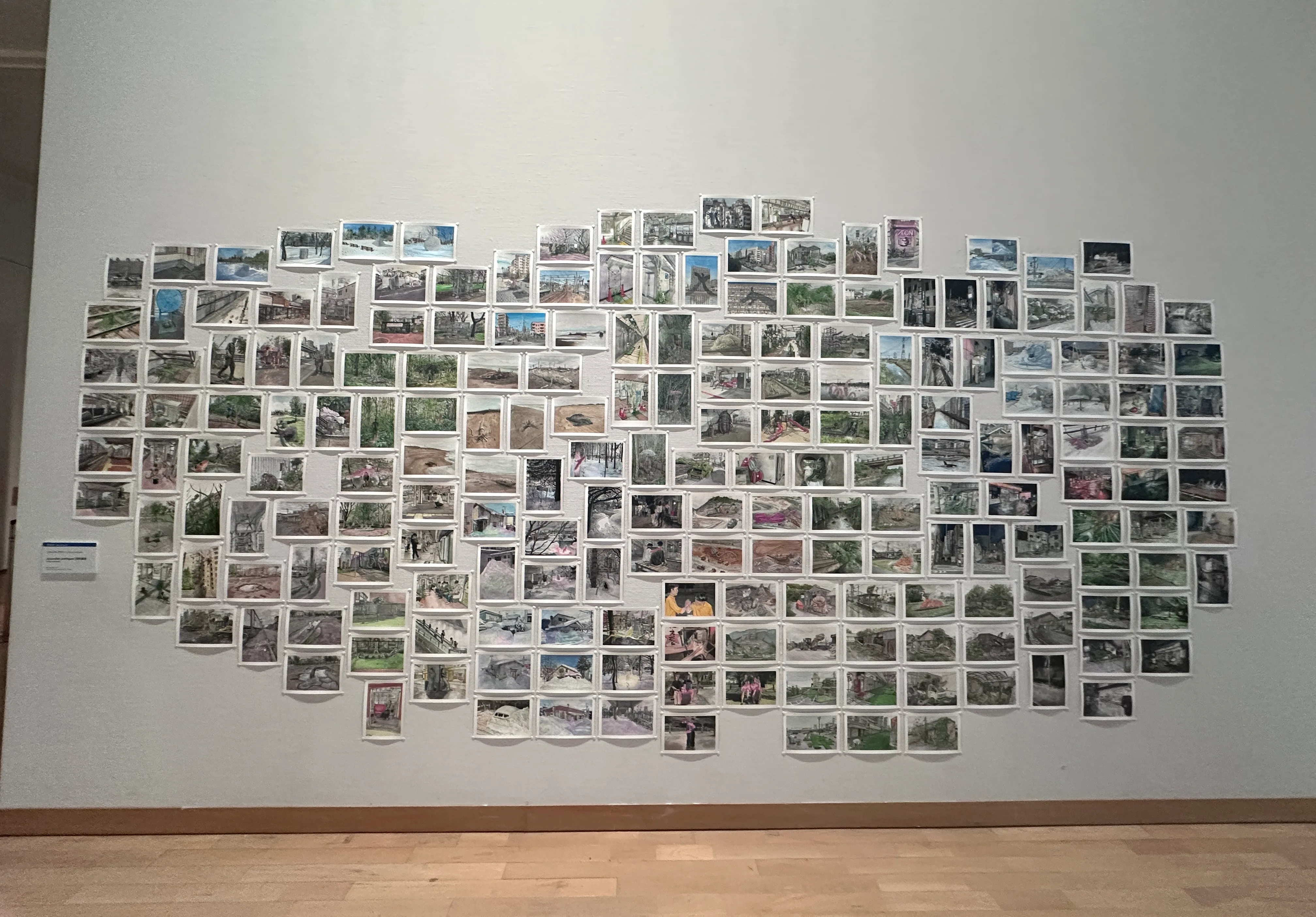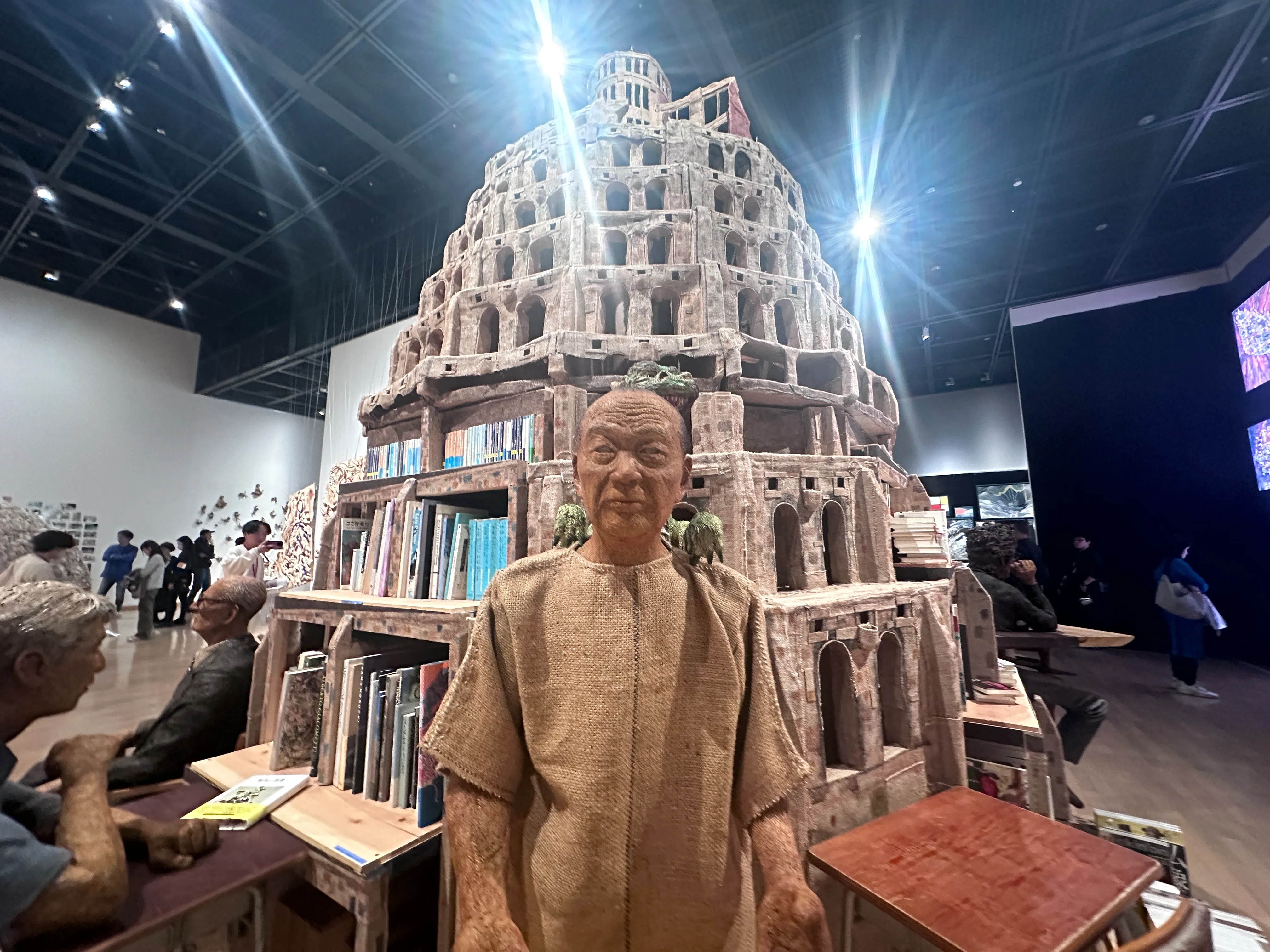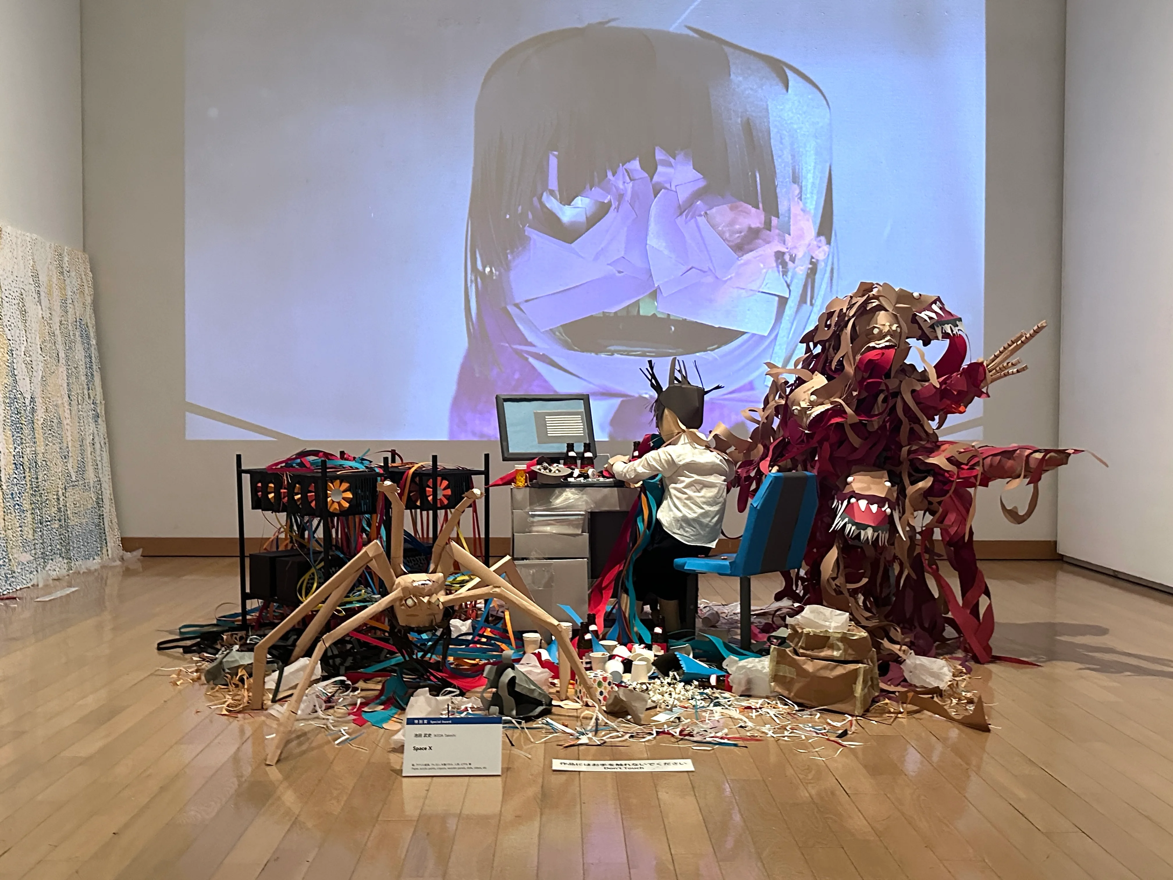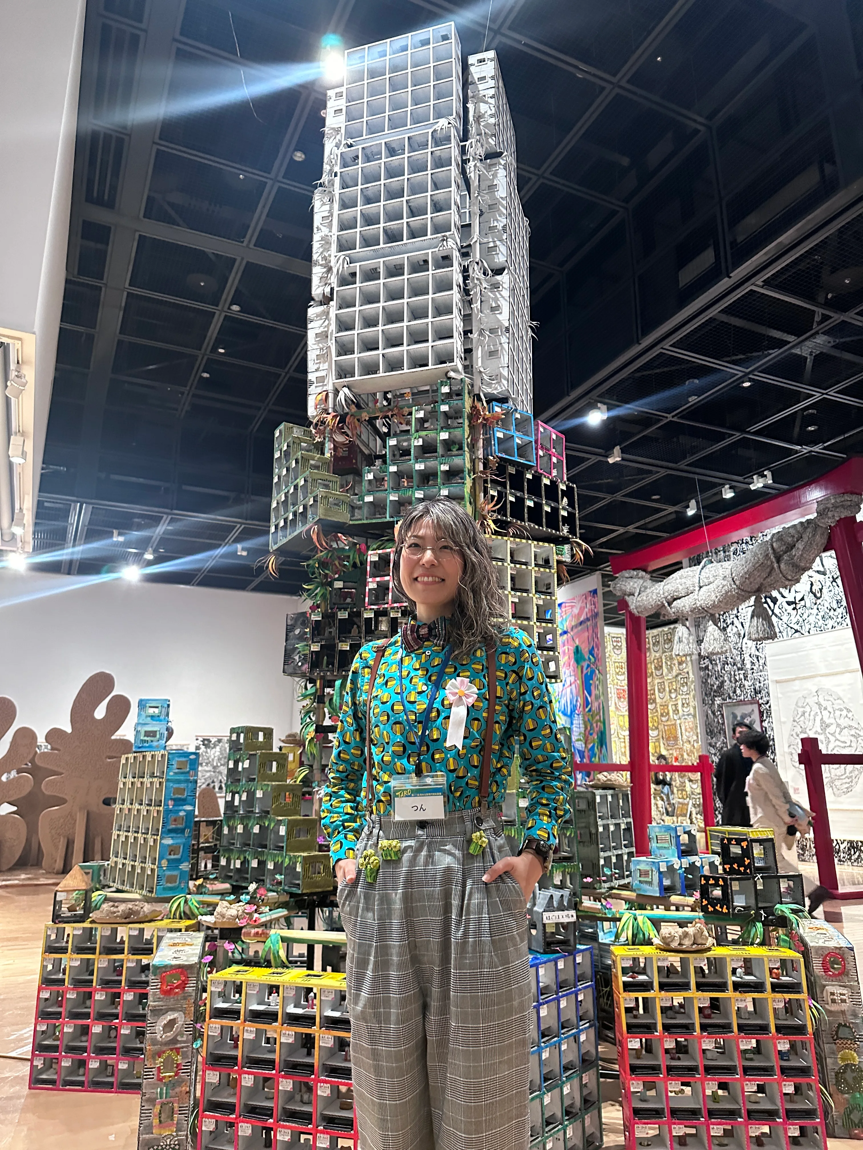 岡本太郎賞を受賞したつん。背後が受賞作《今日も「あなぐまち」で生きていく》