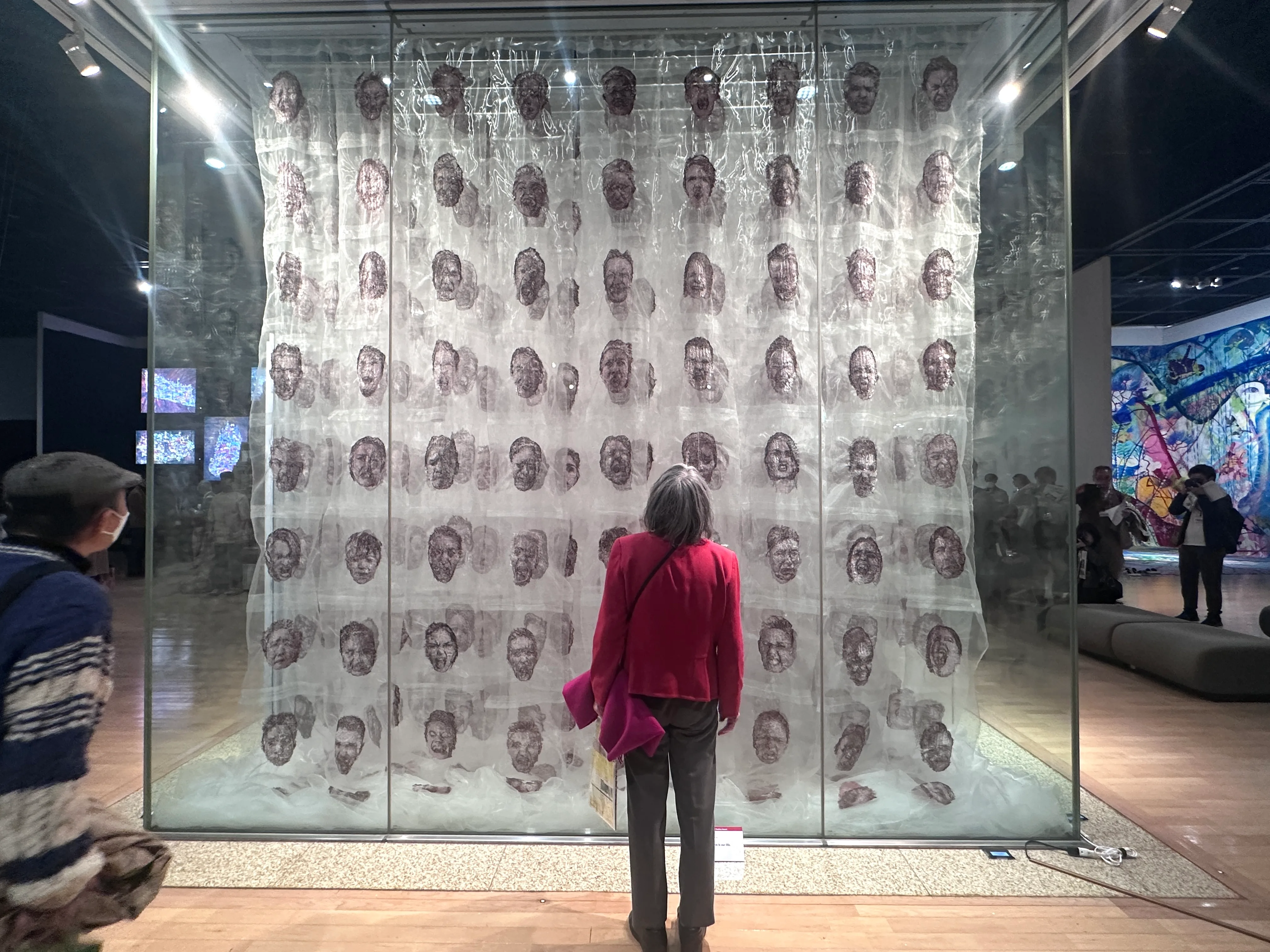 岡本敏子賞(準大賞)の三角瞳は1988年長野県生まれ、東京藝術大学大学院を修了。受賞作《This is a life. This is our life.》は、ポリエステルの布に無数の人の顔が刺繍された作品だ。川崎市岡本太郎美術館館長の土方明司は「表は人物の顔、裏は遺伝子を表す赤い糸。たんなる入れ物としての肉体を暗示する。薄い布切れに刺繍された無数の『個』が折り重なるように並べられる。表現内容と新鮮な手法、展示方法がうまくかみ合い、説得力を持った作品となった」とコメントを寄せている。