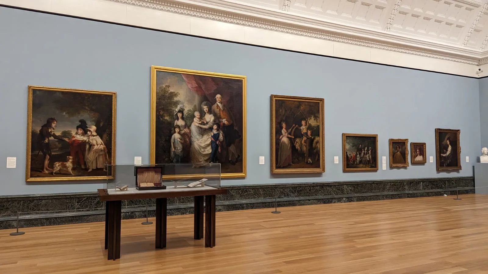 第二次世界大戦以前のイギリス美術のセクションは、1545年から1640年にかけて描かれた肖像画のコレクションから始まる(*1)。そのタイトルを「Exiles and Dynasties(流れ者と王家)」とする最初の展示室には、アンソニー・ヴァン・ダイク《スペンサー家の貴婦人》(1633〜38)などを中心に、当時の王侯貴族たちを描いた肖像画が集められている。当時の英国で人気を博した芸術家のほとんどが、宮廷画家としての職業機会を求めてやってきた北ヨーロッパ系移民であった。その中には、母国での宗教的迫害から逃れるために難民としてやってきた者も多く含まれていた(*2)。