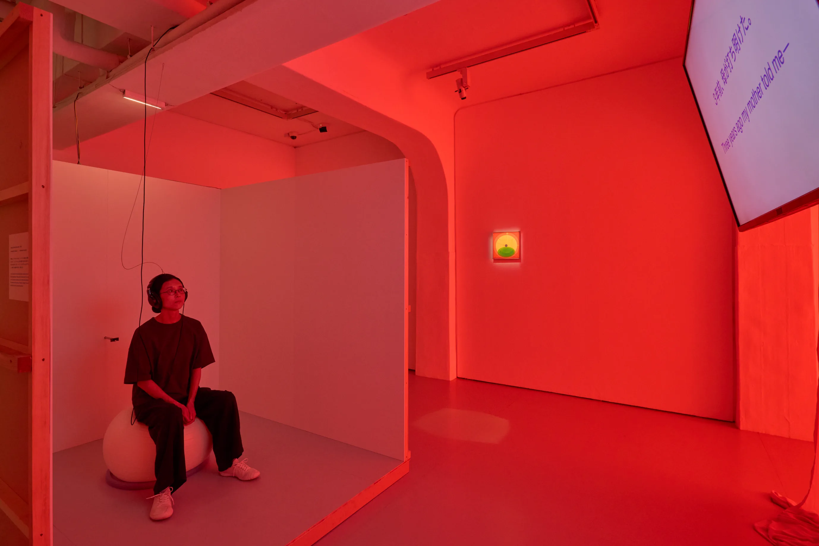 さらに中央には、スクリーンとバランスボールが置かれた半個室がふたつ、向き合うように設置されている。鑑賞者はバランスボールに座りヘッドフォンを装着すると、片方では死を選択する個人、もう片方では死を受け入れる個人それぞれの立場からのモノローグを聞くことになる。呼吸音や心音に連動して床が振動し、バランスボールを伝って身体に響くと同時に、半個室の外側の空間全体にも複数のレイヤーが交錯するサウンドが流れる重層的なインスタレーションを体験する。