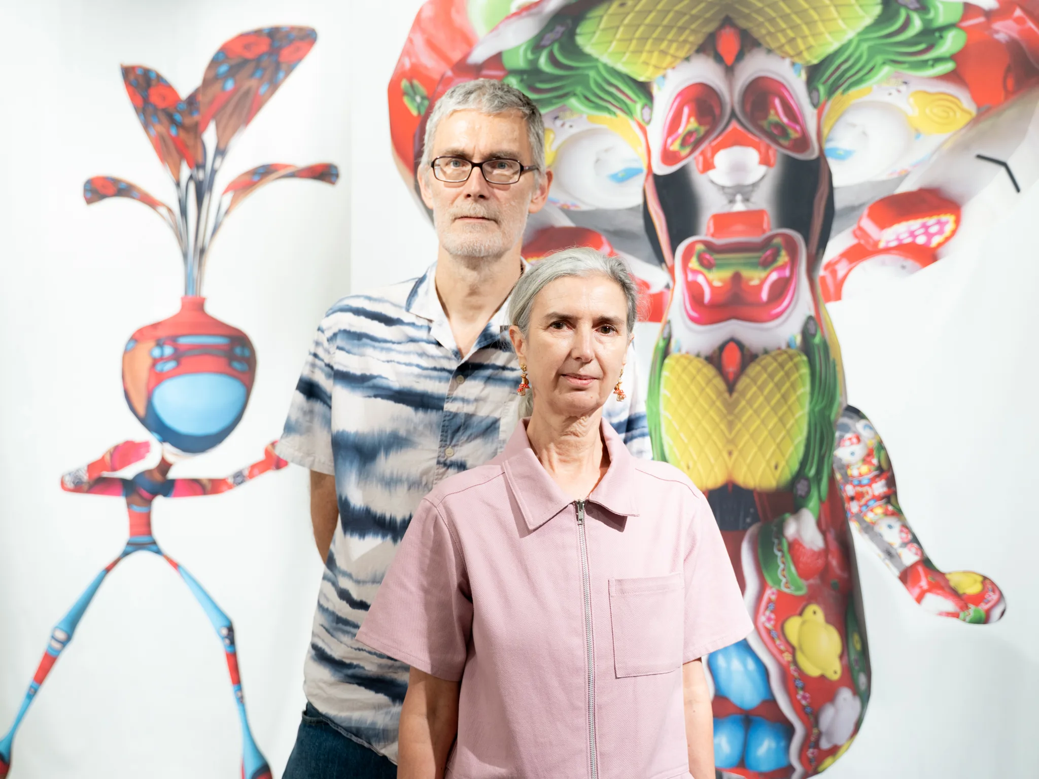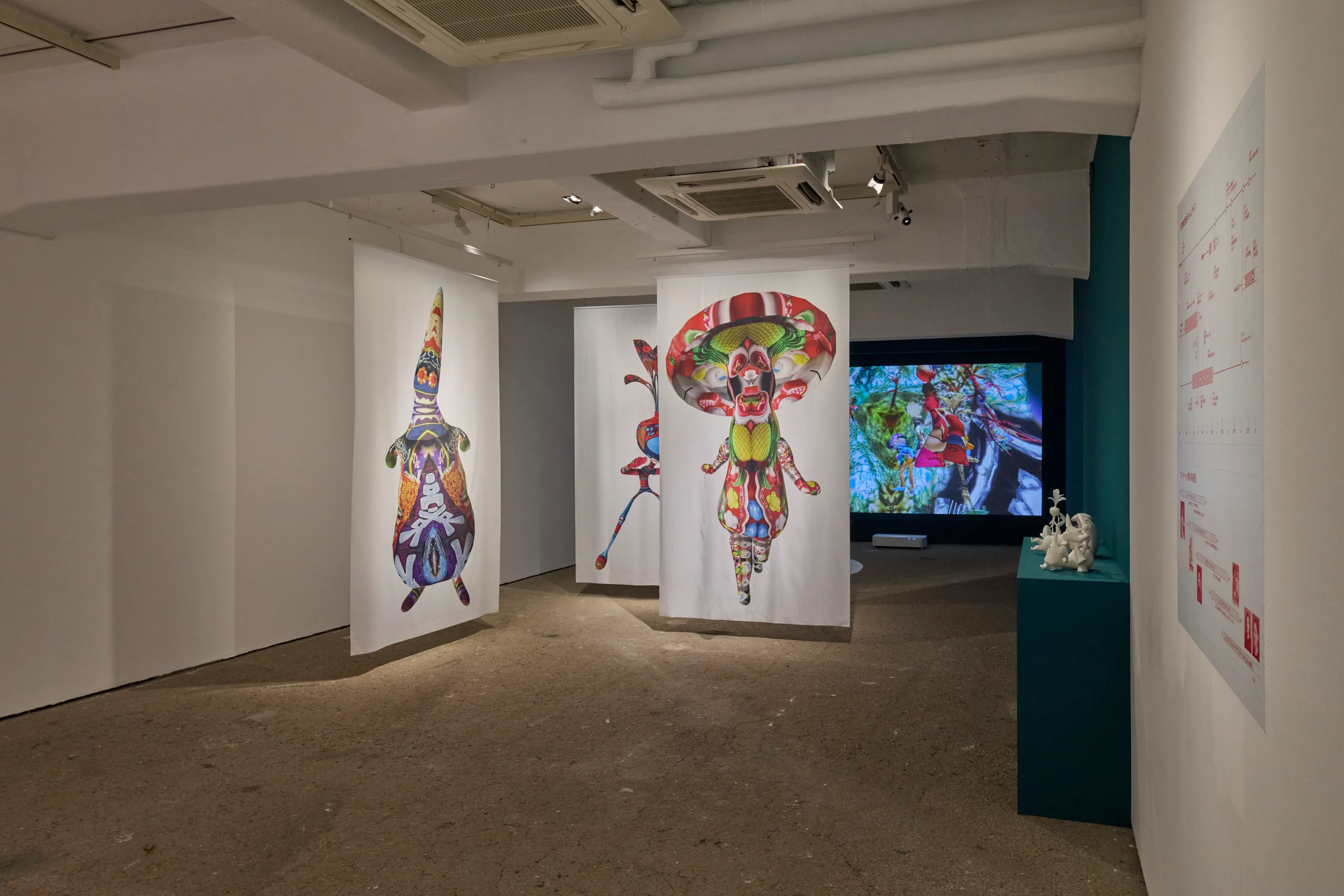 展示室の天井から掲げられた巨大なテキスタイルには、不思議なデザインの生命体がカラープリントされている。じっくり観察を続けると、見覚えのある日用品が身体のあちこちに用いられていることに気づく。