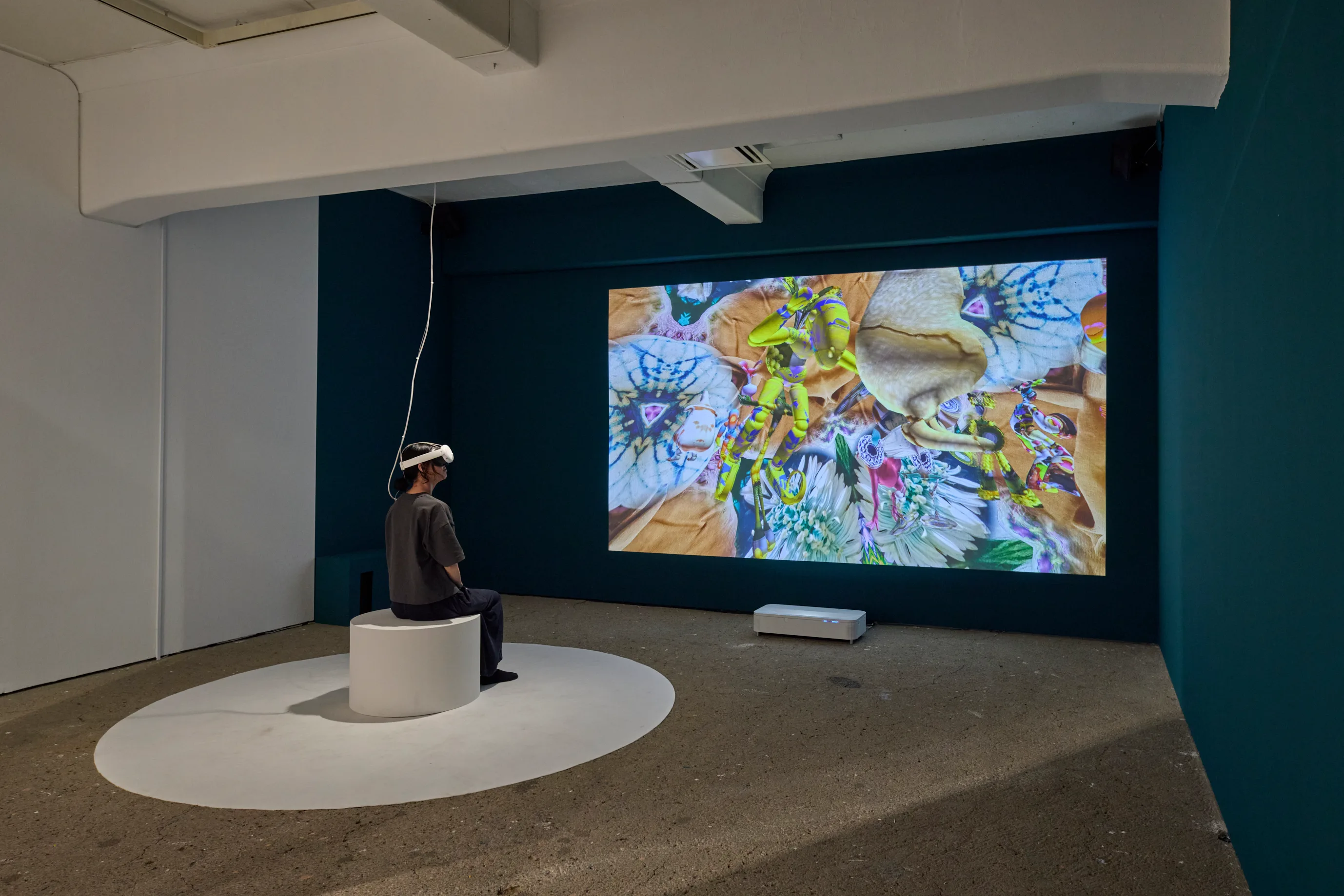ゴーグルを装着して体感するVRインスタレーション《HALLUC》では、「FOWDIB」の研究成果になぞらえて、テキスタイル上の生命体とは異なりながらも関連性のある、AI生成の生命体たちがリアルタイムでコミカルに動き回る仮想空間に遭遇できる。