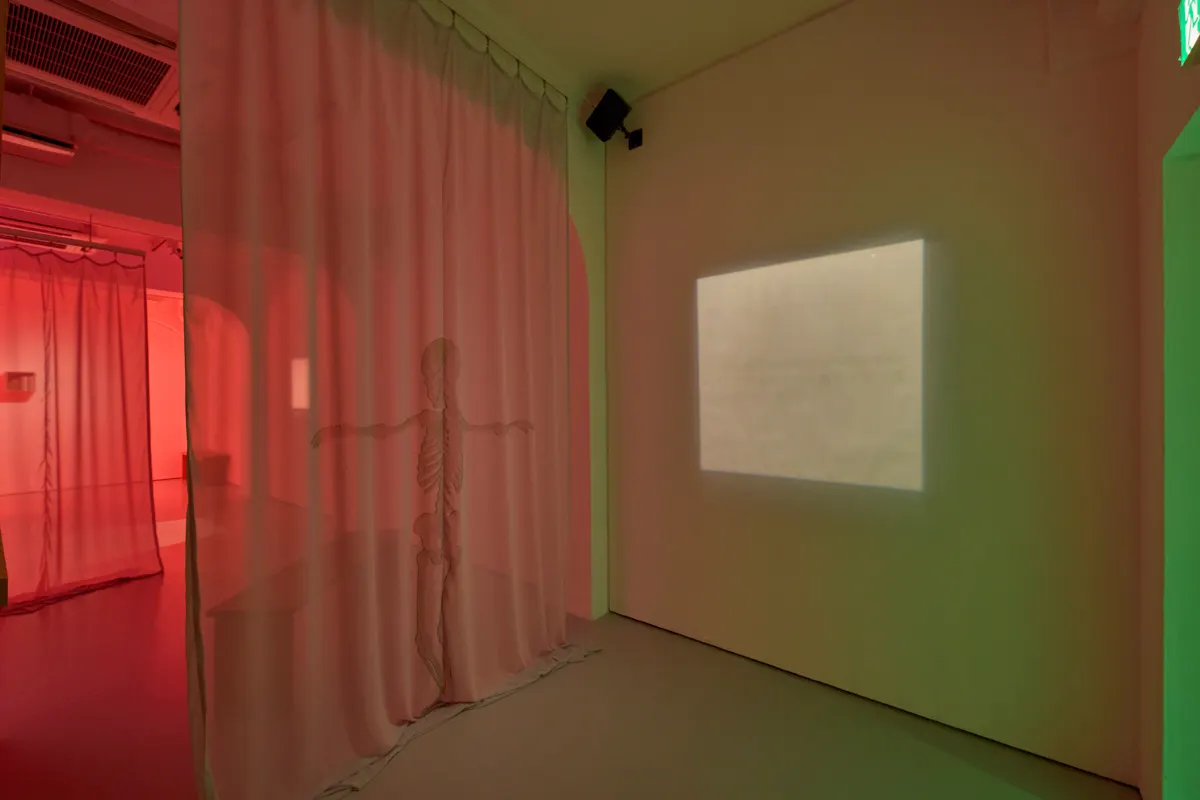 「過去作品の中でも赤と緑の色や光を使用してきましたが、今回は信号機の色の意味合いに寄せています。緑の光はゴーサインを意味しますが、今回のリサーチで、安楽死の承諾が下りた際に支援団体が『グリーンライト』という表現を使っていることを知りました。かつてアトリエ・モンディアルで展示を行ったときも、緑の光の空間演出をしましたが、今回はそもそも安楽死という選択肢がない日本で、どのように表現したらいいか、検討を重ねました」(中島)