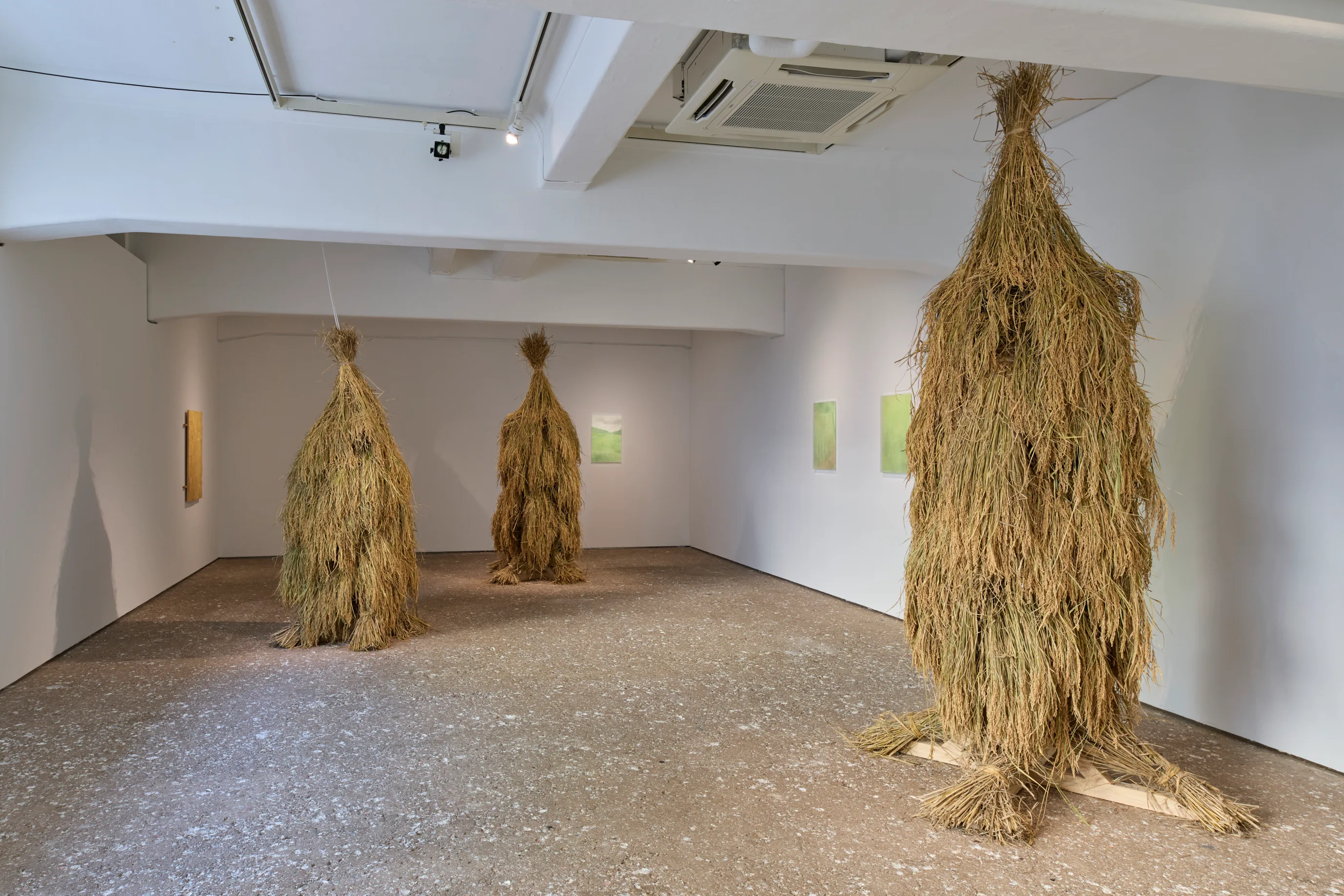稲わらの香りが広がる展示室に一歩入ると、天井近くまで積み重ねられた稲の束が、オブジェのようにそびえ立っていた。まるで意思を持って動き出しそうな存在感だが、よく見ると新米がたっぷりと実っている。収穫を終えた稲田で、稲穂を下に向けて吊るし、自然乾燥させる伝統的な技法「稲架(はさ)掛け」から着想したインスタレーション《アニマ》だ。展示室には作家自身がフィールドレコーディング・編集した音源が流れている。