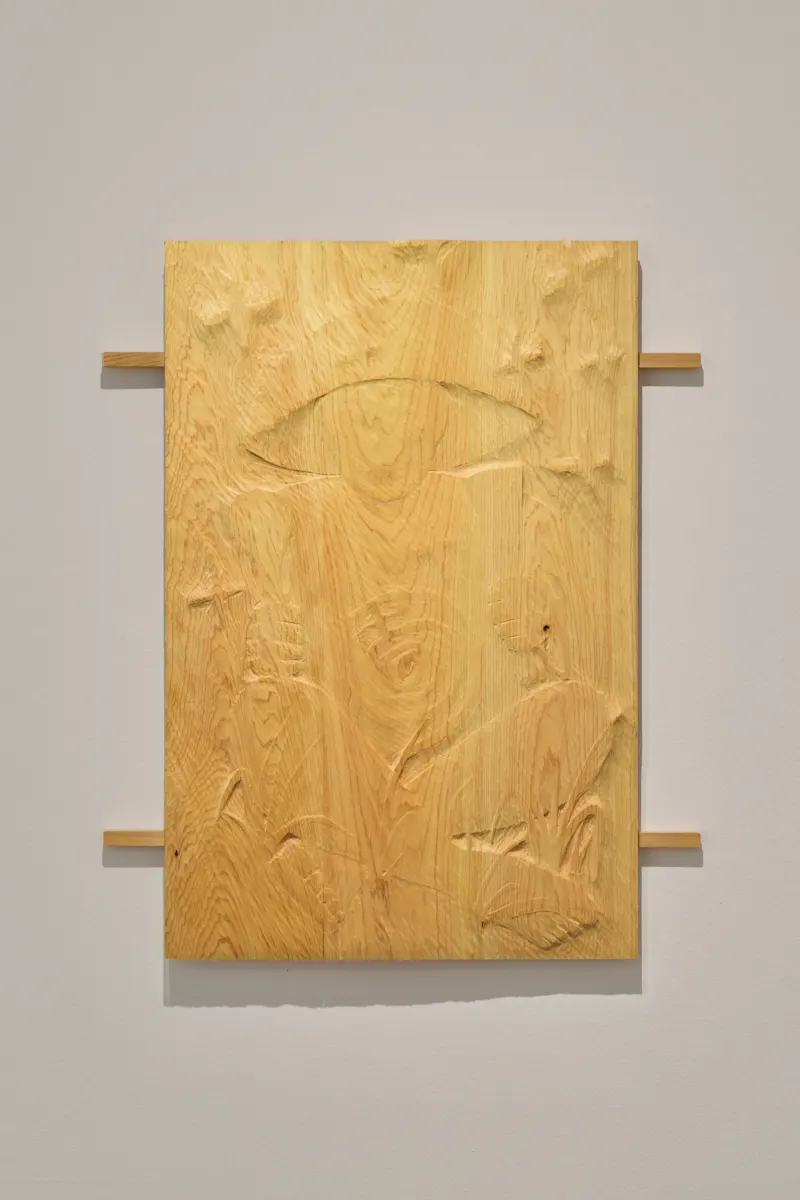 そして、杉材を使った木彫の新作《存在の肖像》は、立体と平面の間のようでもあり、抽象的な表現だ。滞在した地域に根付く石像「田の神」を祀る土着信仰がモチーフになっているという。