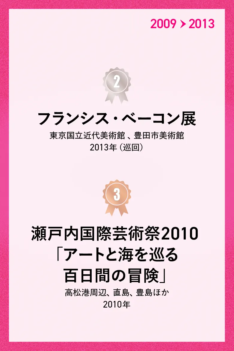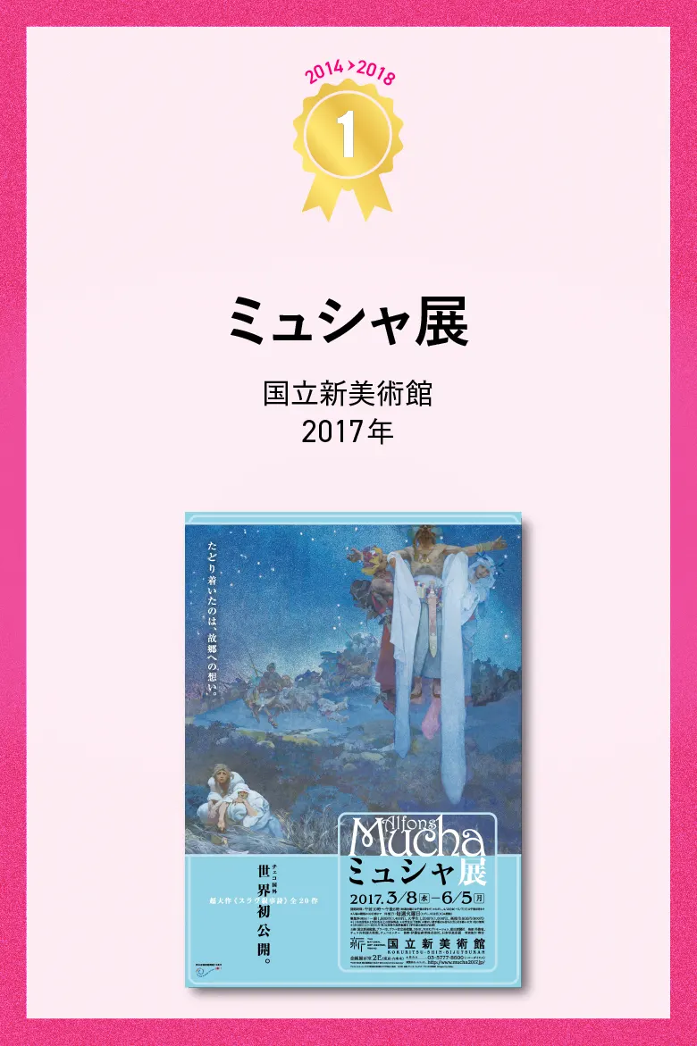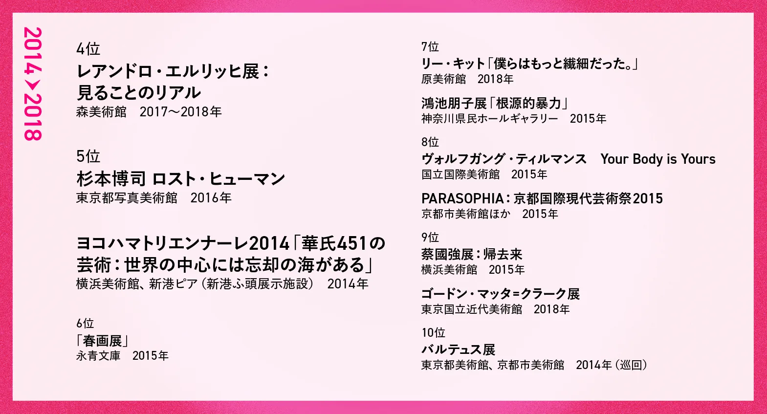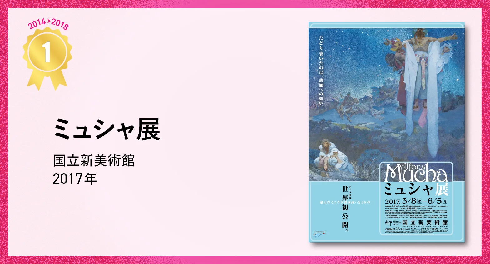 それでは、4つの期間ごとに1〜10位までの展覧会を発表します! 見事1位に輝いた展覧会については、関係者からコメントをいただきました。また、ユーザーから投票時に寄せられた、思い出の展覧会に関するコメントも合わせてご紹介します。