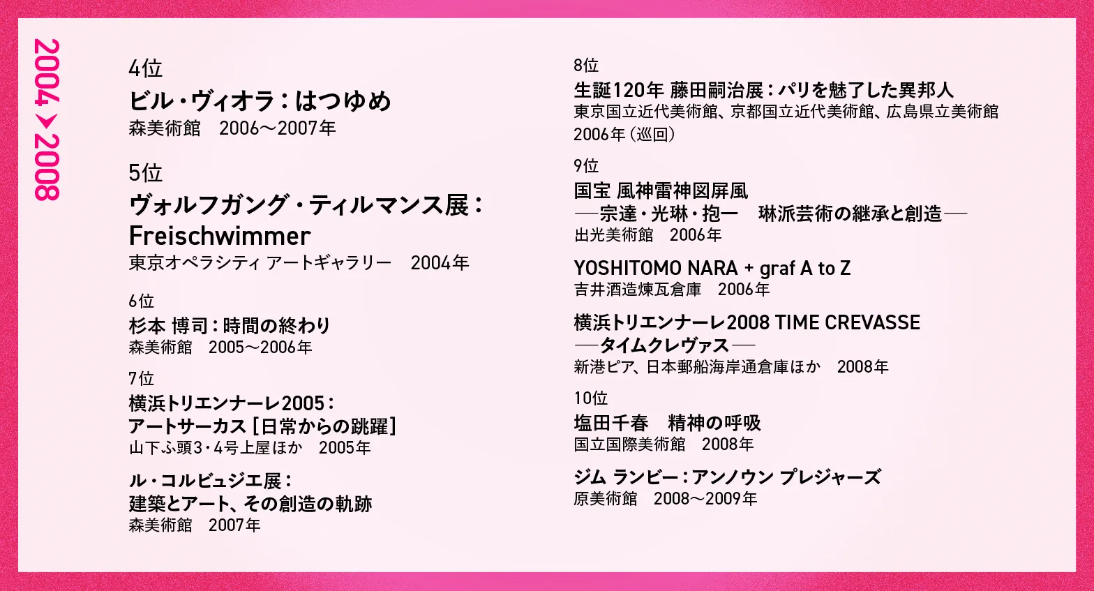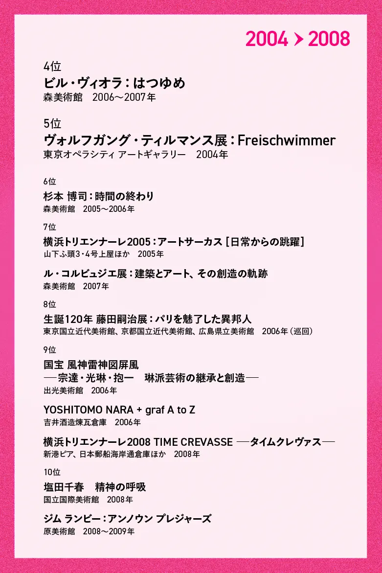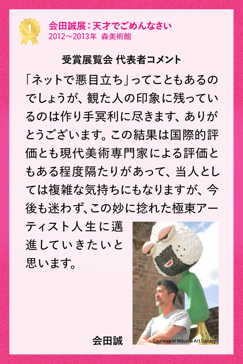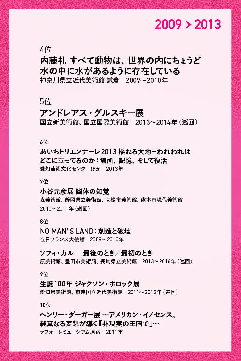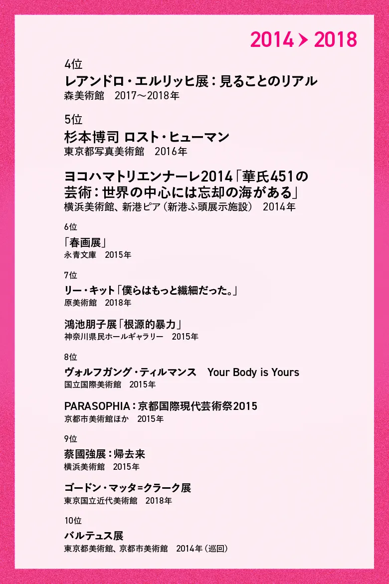 それでは、4つの期間ごとに1〜10位までの展覧会を発表します! 見事1位に輝いた展覧会については、関係者からコメントをいただきました。また、ユーザーから投票時に寄せられた、思い出の展覧会に関するコメントも合わせてご紹介します。