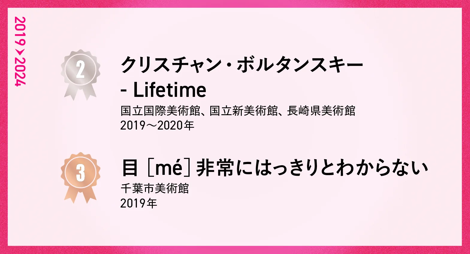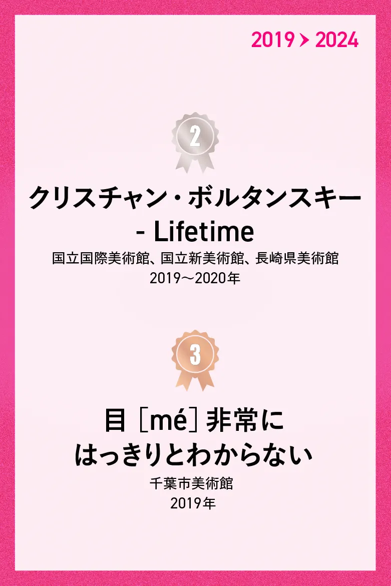2021年に惜しくも亡くなった、フランスを代表する現代アーティストの個展「クリスチャン・ボルタンスキー – Lifetime」が第2位、現在日本でもっとも注目を集めるアーティストグループによる驚きの展覧会「目 [mé]非常にはっきりとわからない」が第3位にランクインしました。